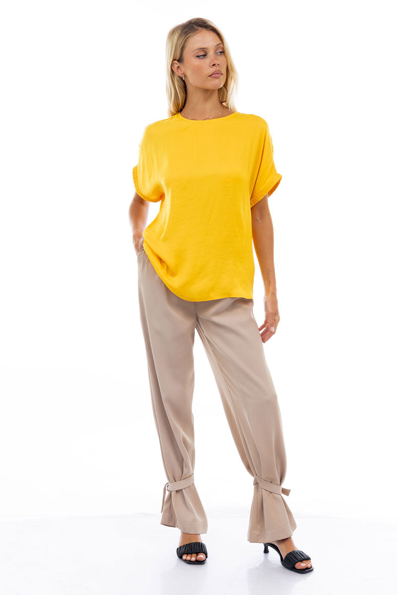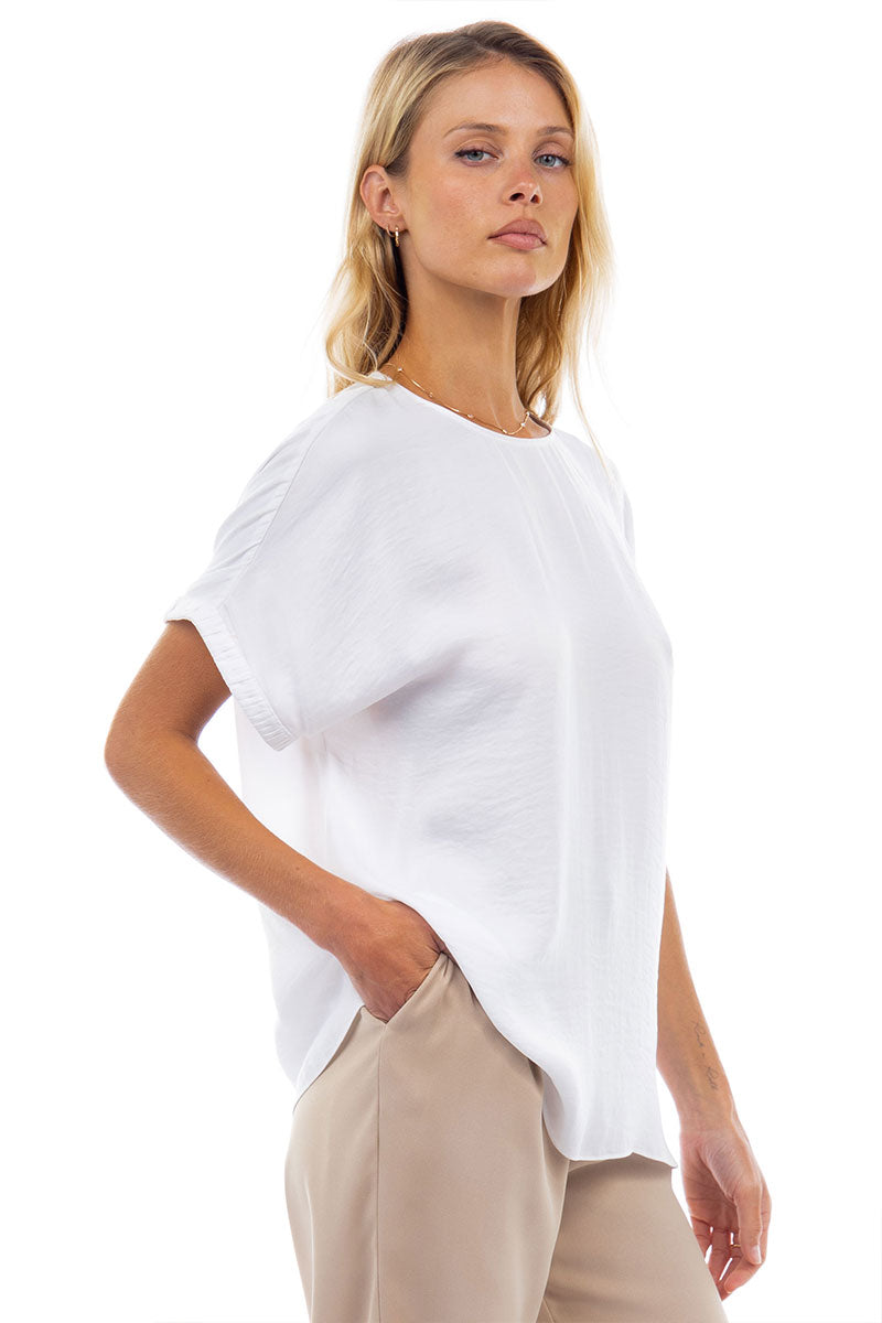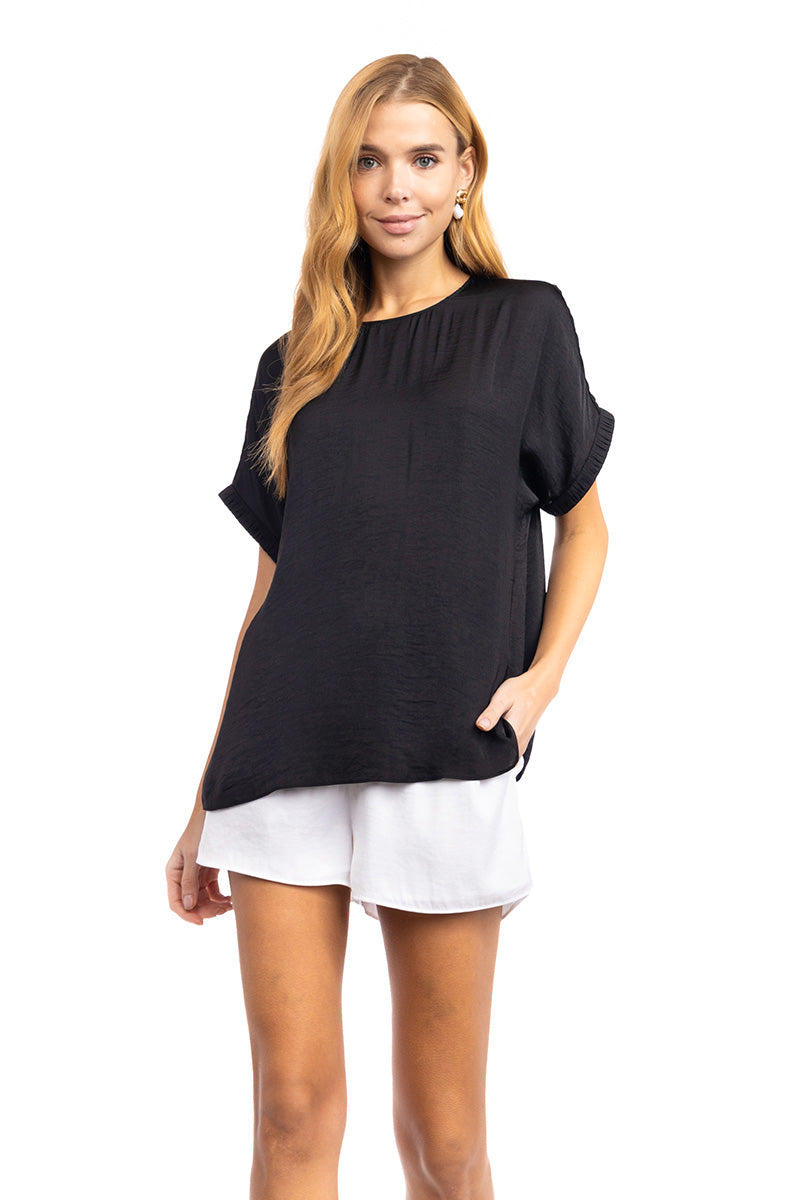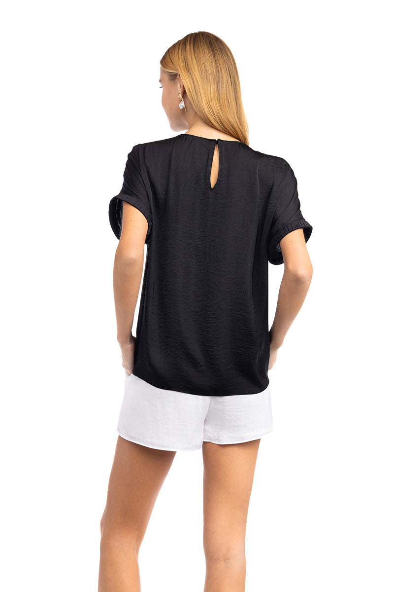 The standout feature of this blouse is the plisse texture on the sleeves, offering a subtle yet eye-catching twist on a classic silhouette. For a night out, pair this blouse with a sleek pencil skirt or leather pants. Add statement earrings and strappy heels to turn heads.