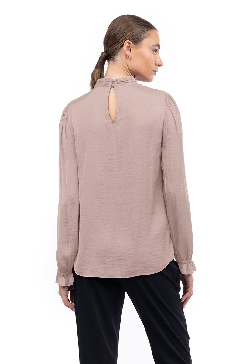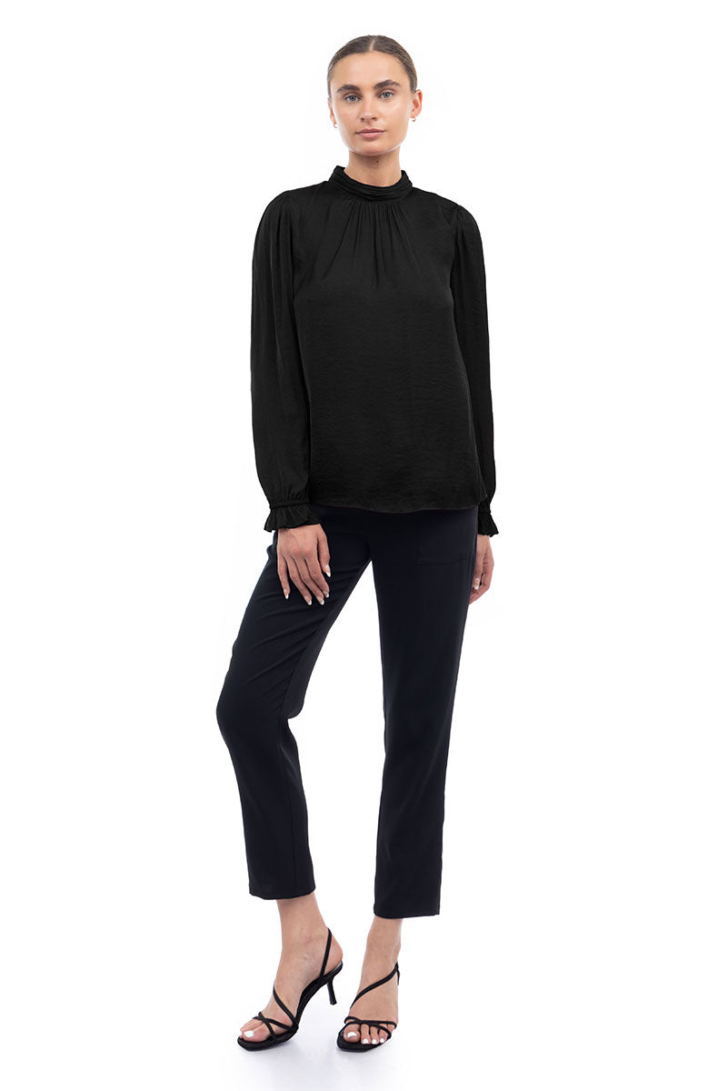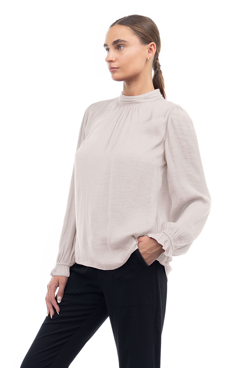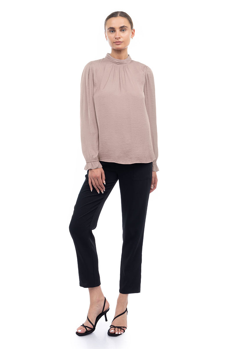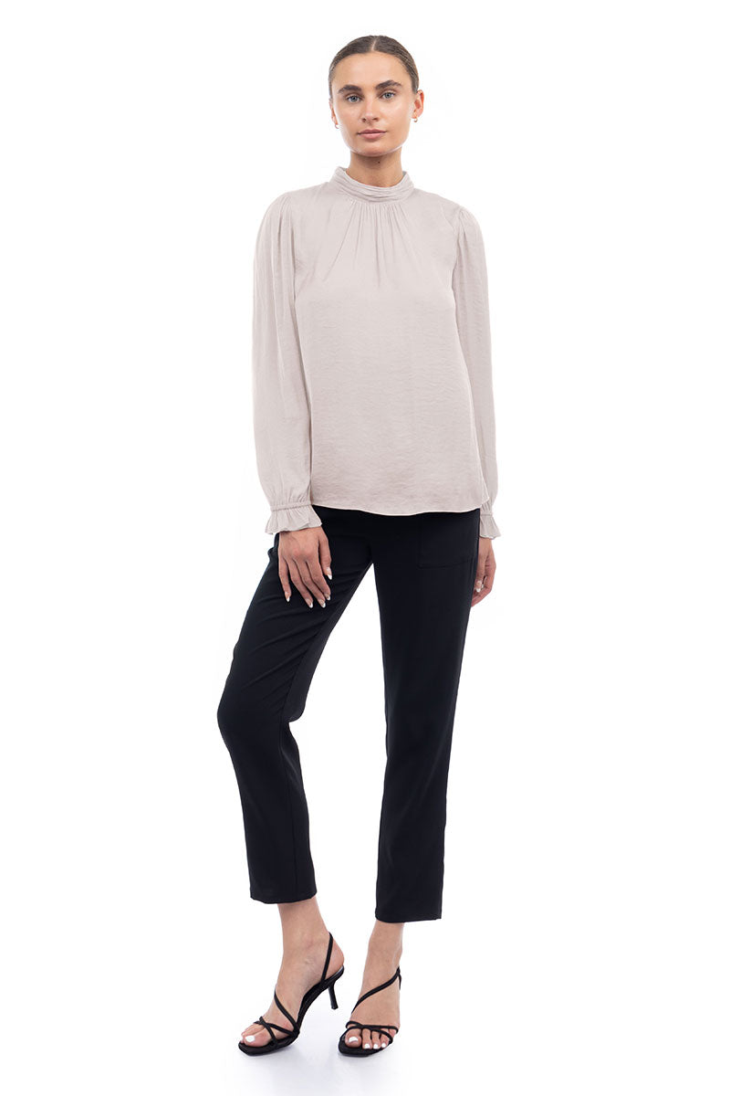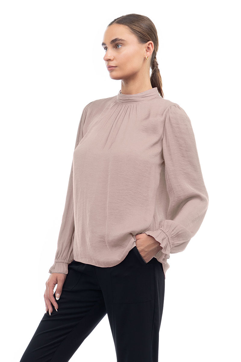 Mock Neck Long Sleeve Blouse With Smocking Cuff Detail