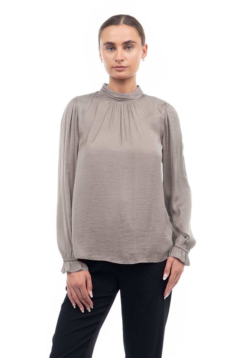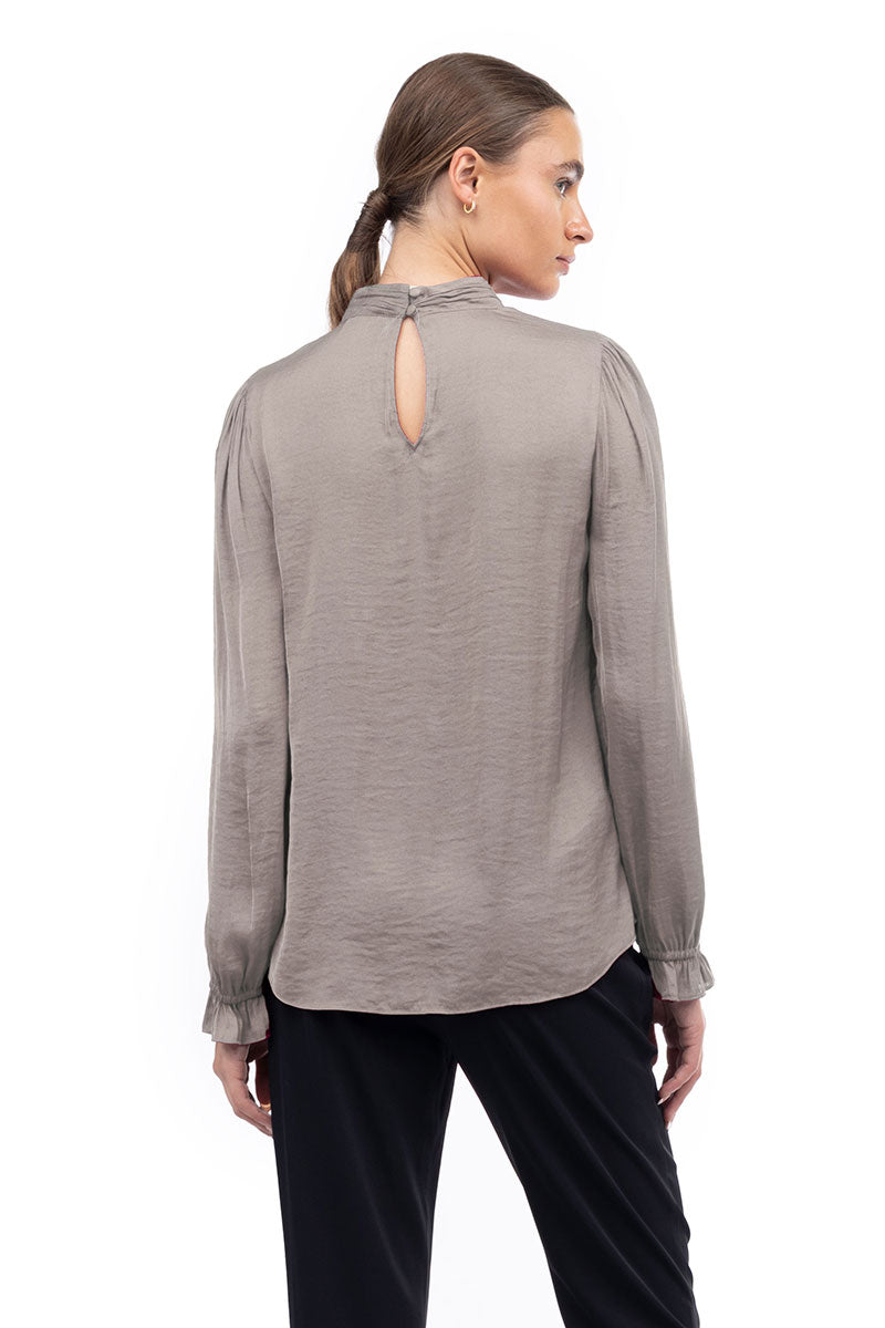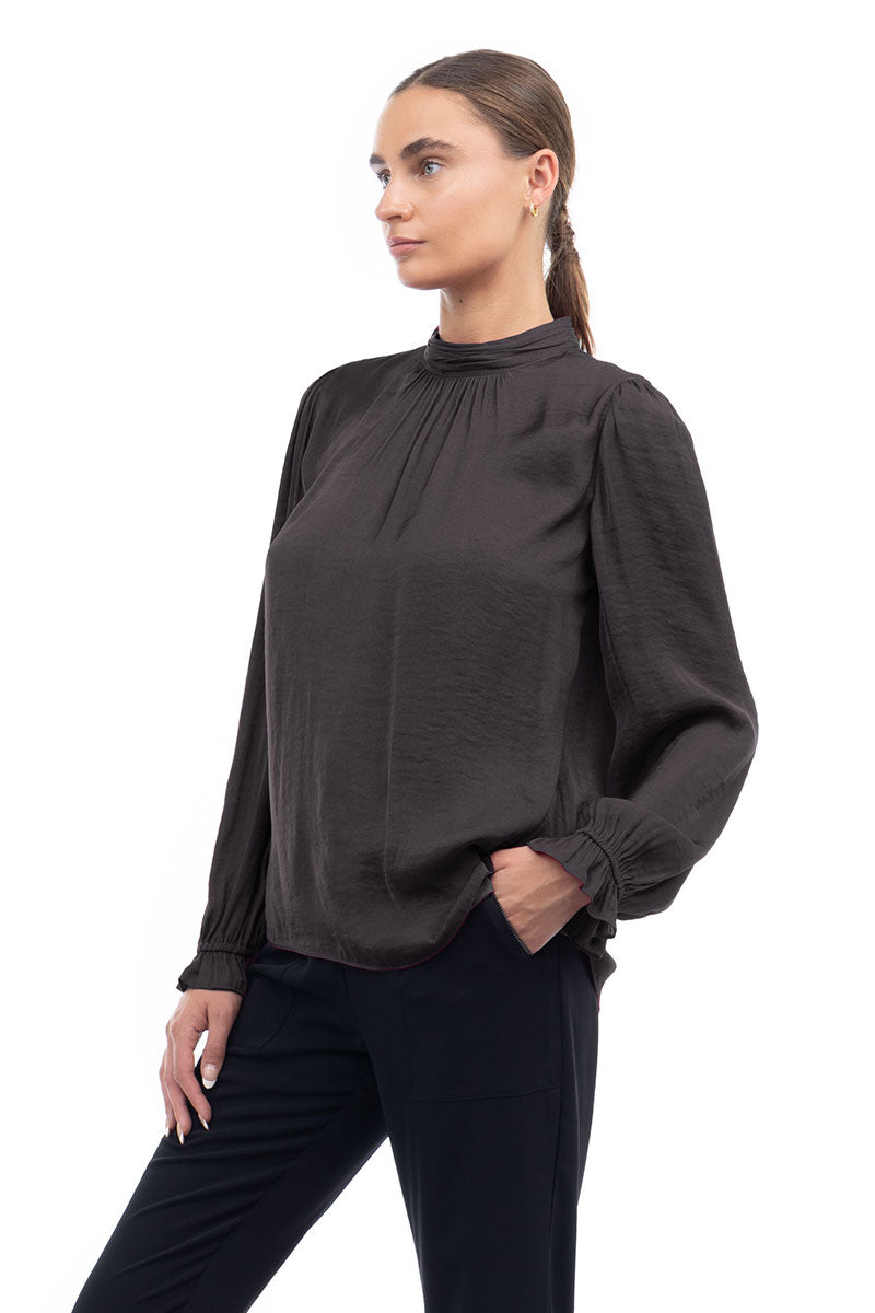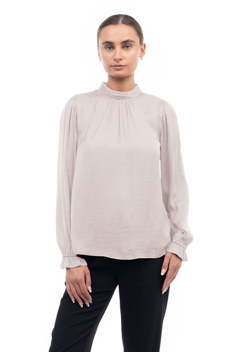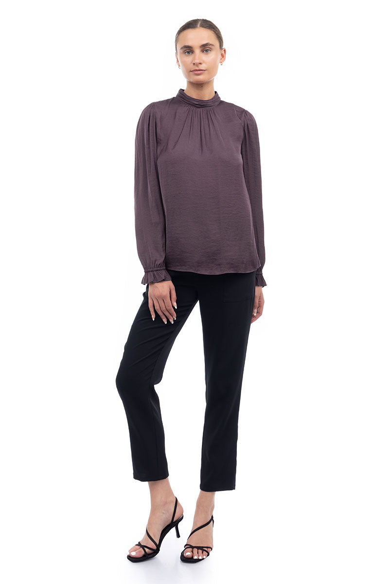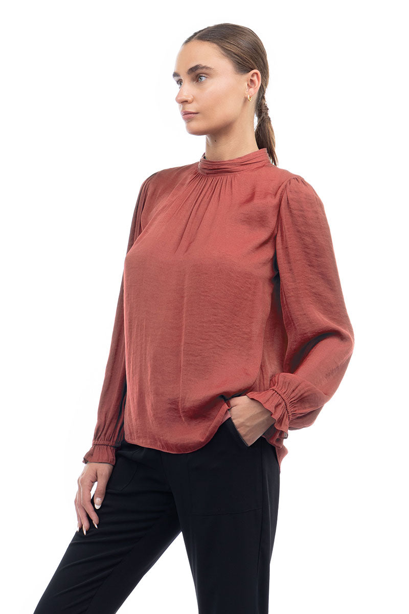 Mock Neck Long Sleeve Blouse With Smocking Cuff Detail