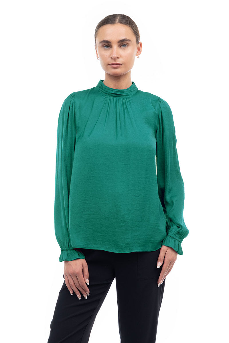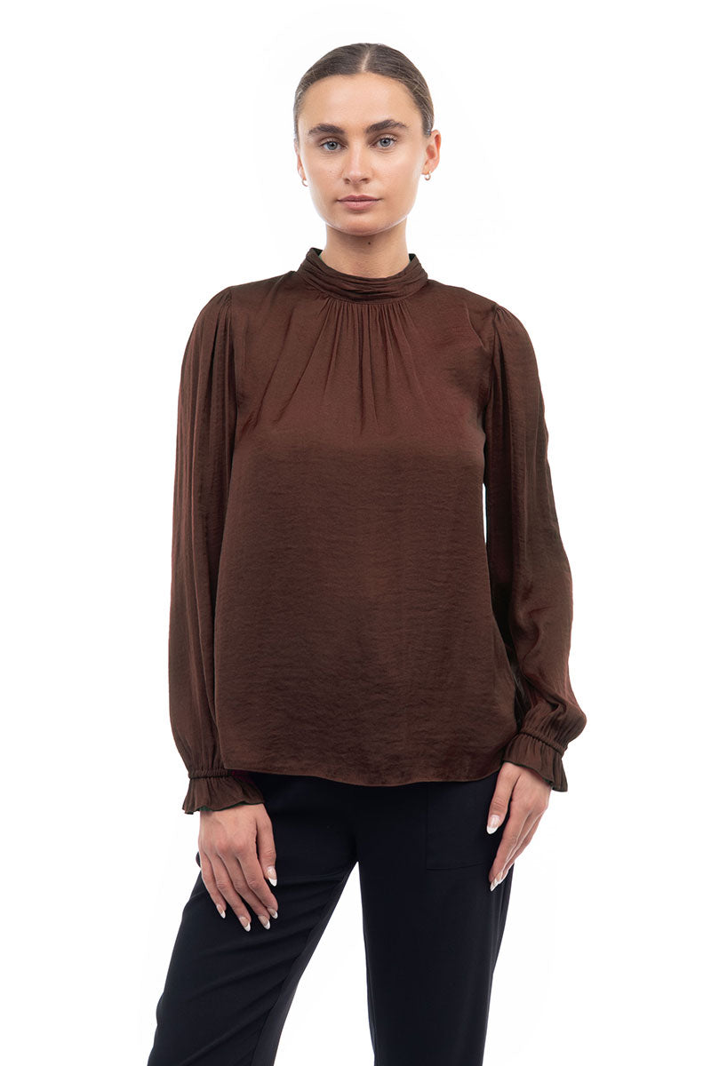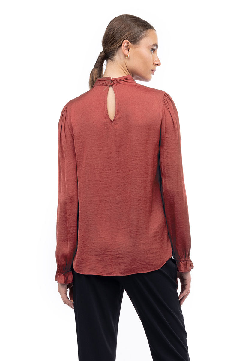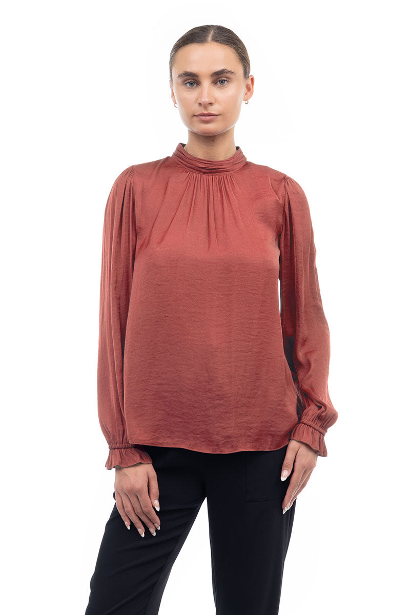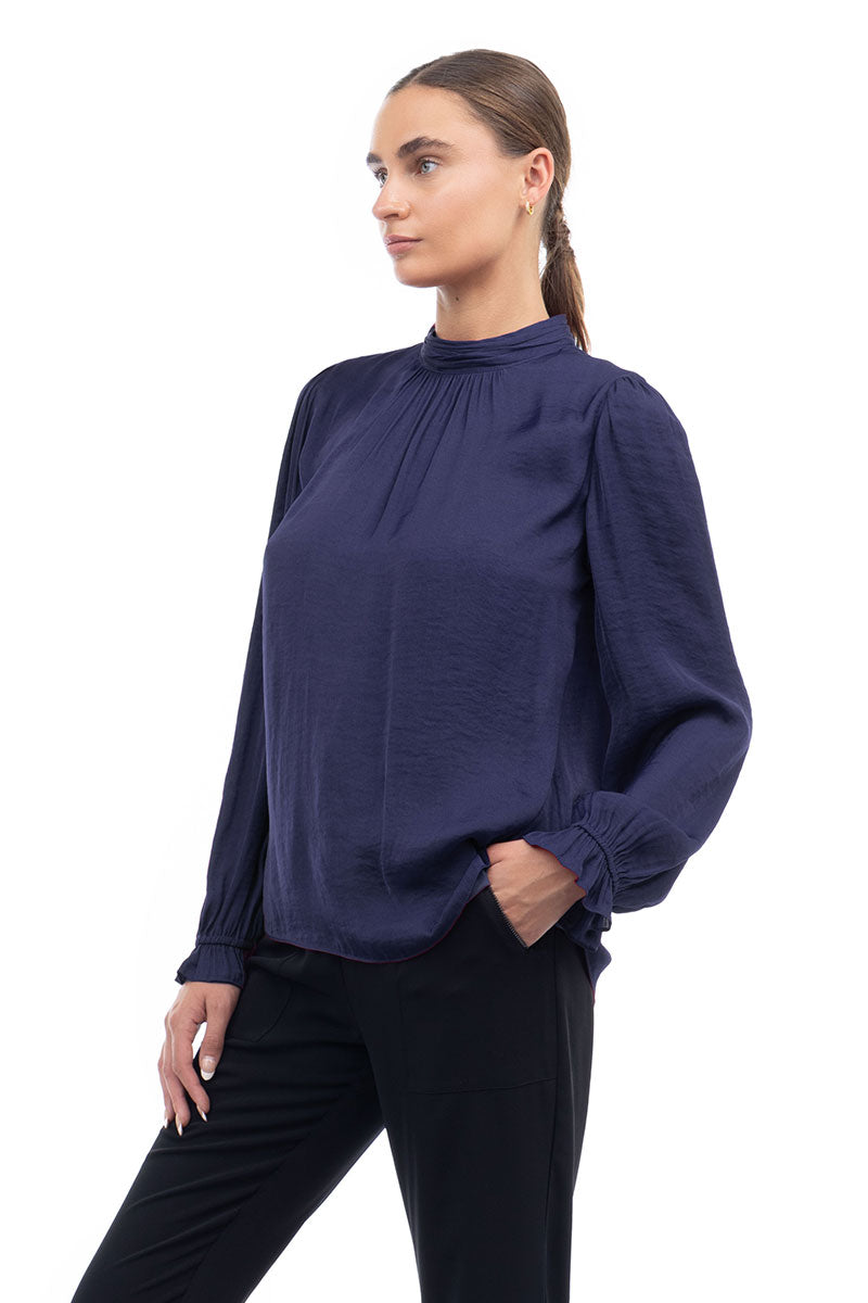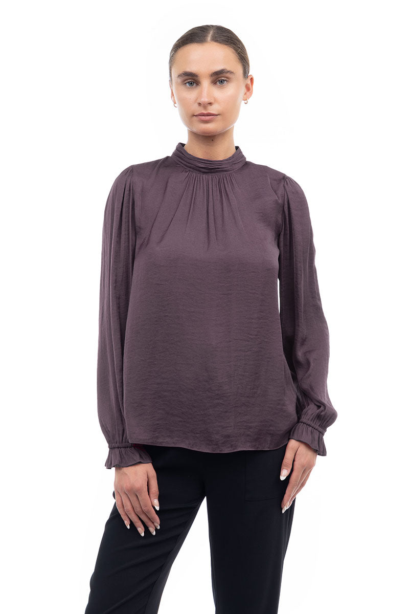 Mock Neck Long Sleeve Blouse With Smocking Cuff Detail