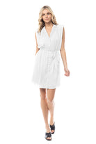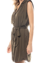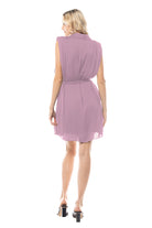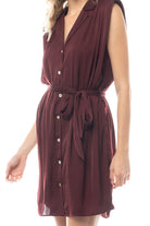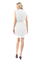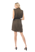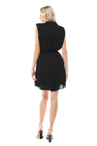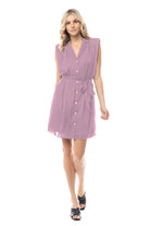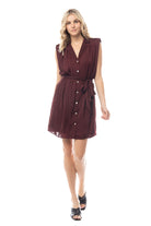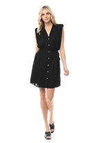 The above-the-knee dress is sleeveless and features padded shoulders for a chic and modern aesthetic. The button-down design adds a touch of classic sophistication, offering a timeless element to the dress. With padded shoulders, it introduces a bold and structured silhouette. This sleeveless dress is a versatile and fashionable choice for various occasions, providing a perfect balance of classic and contemporary style.