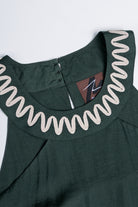 ╴Round neckline with back keyhole and button closure.