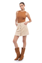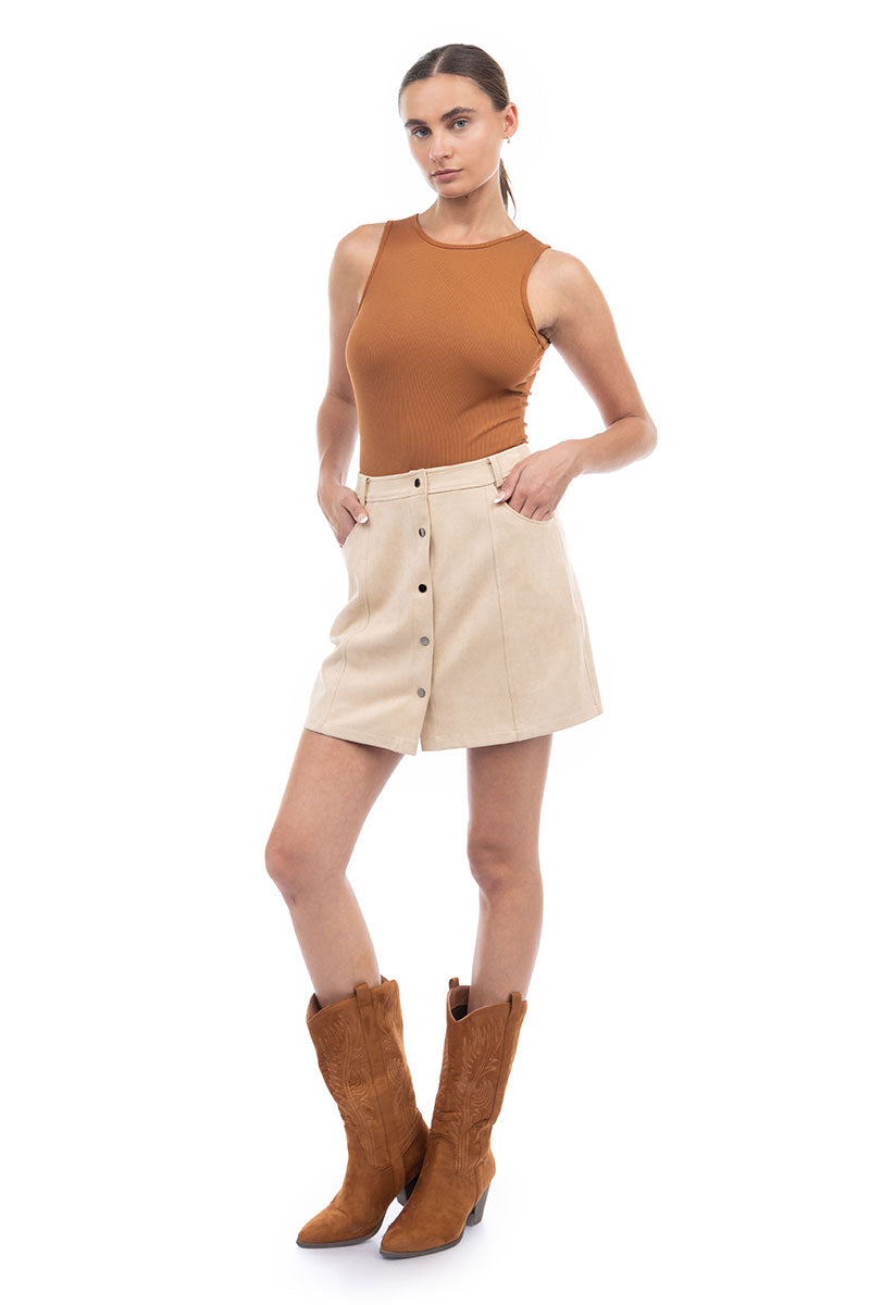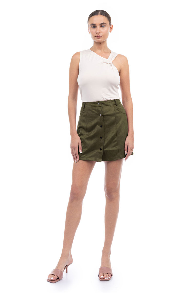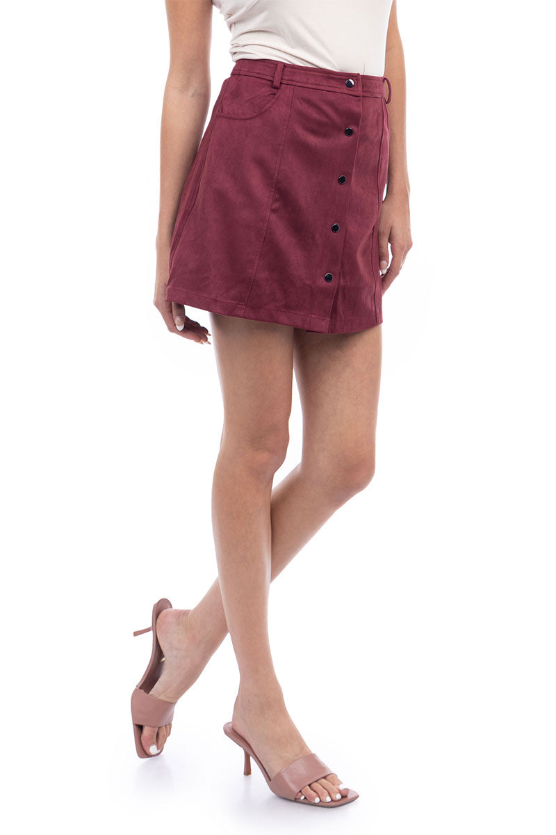 Transform your look with our Faux Suede Mini Skirt, beautifully designed with intricate button front detailing. Crafted from luxurious faux suede, this skirt adds a touch of elegance to any outfit. Ideal for various occasions, it guarantees you exude confidence and style effortlessly.