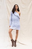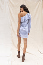 ╴Single long sleeve balances the mini hem—ideal for cocktail parties or nights out.