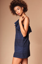 ╴Asymmetrical neckline with a cascading ruffle for a bold, feminine touch.