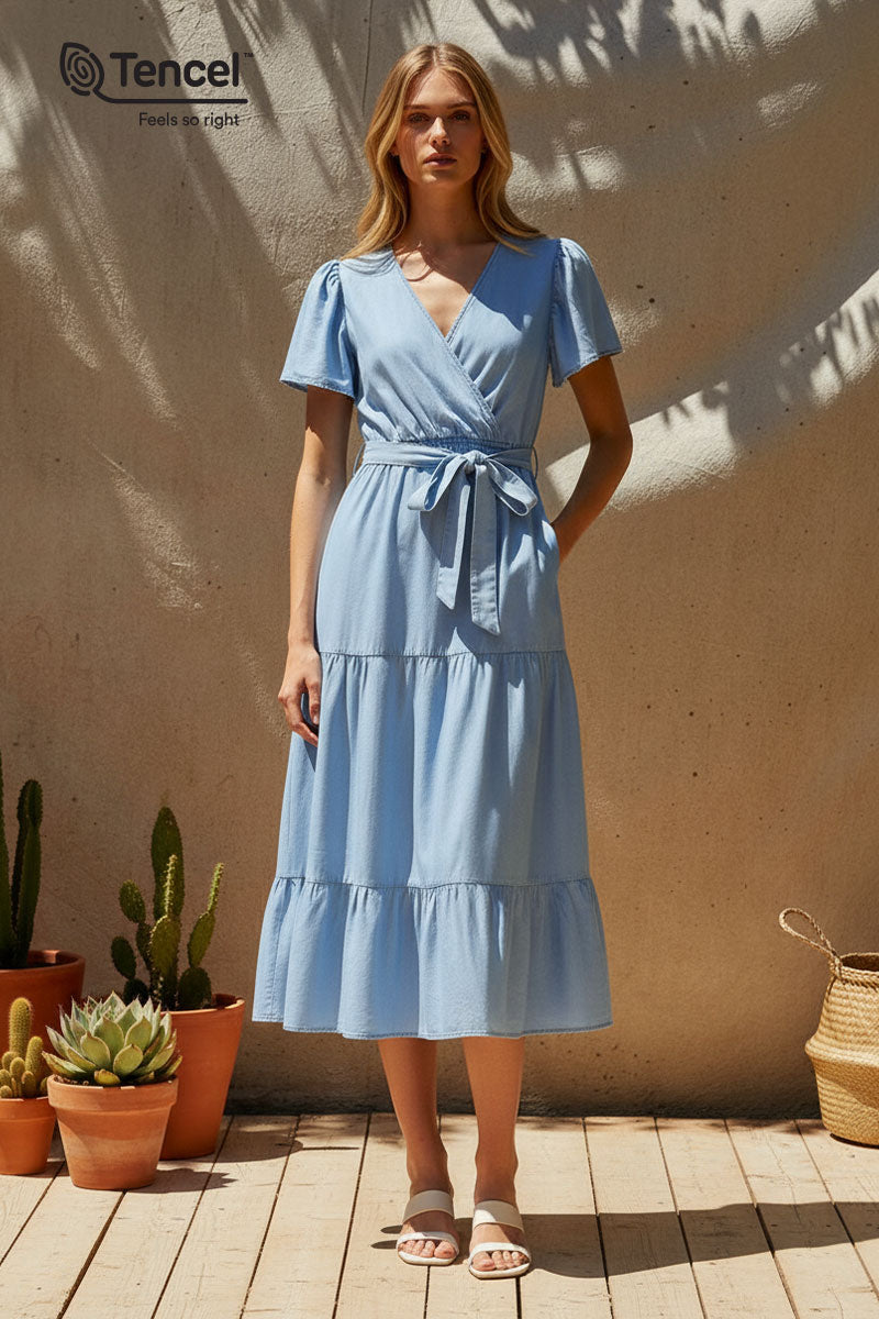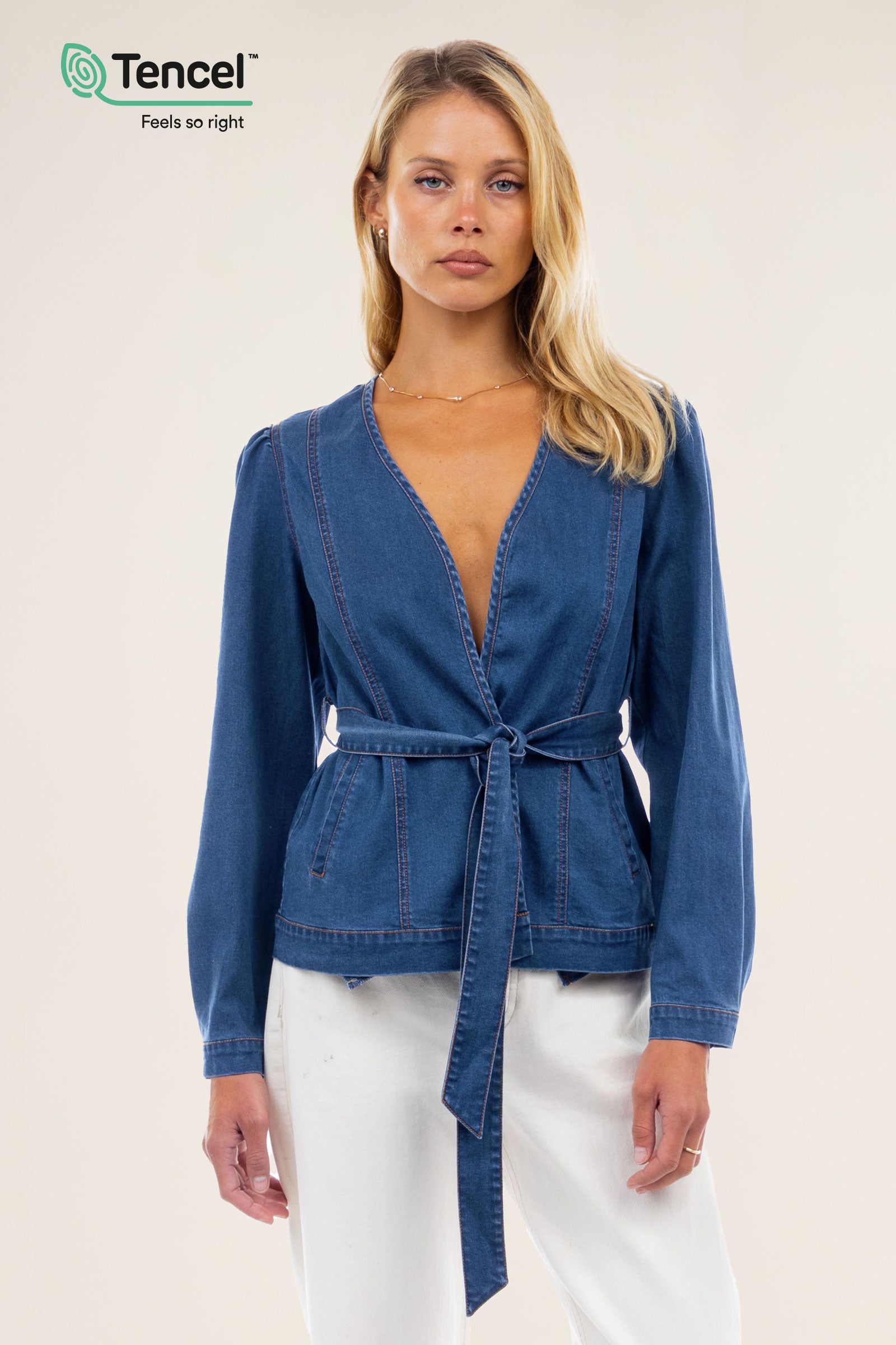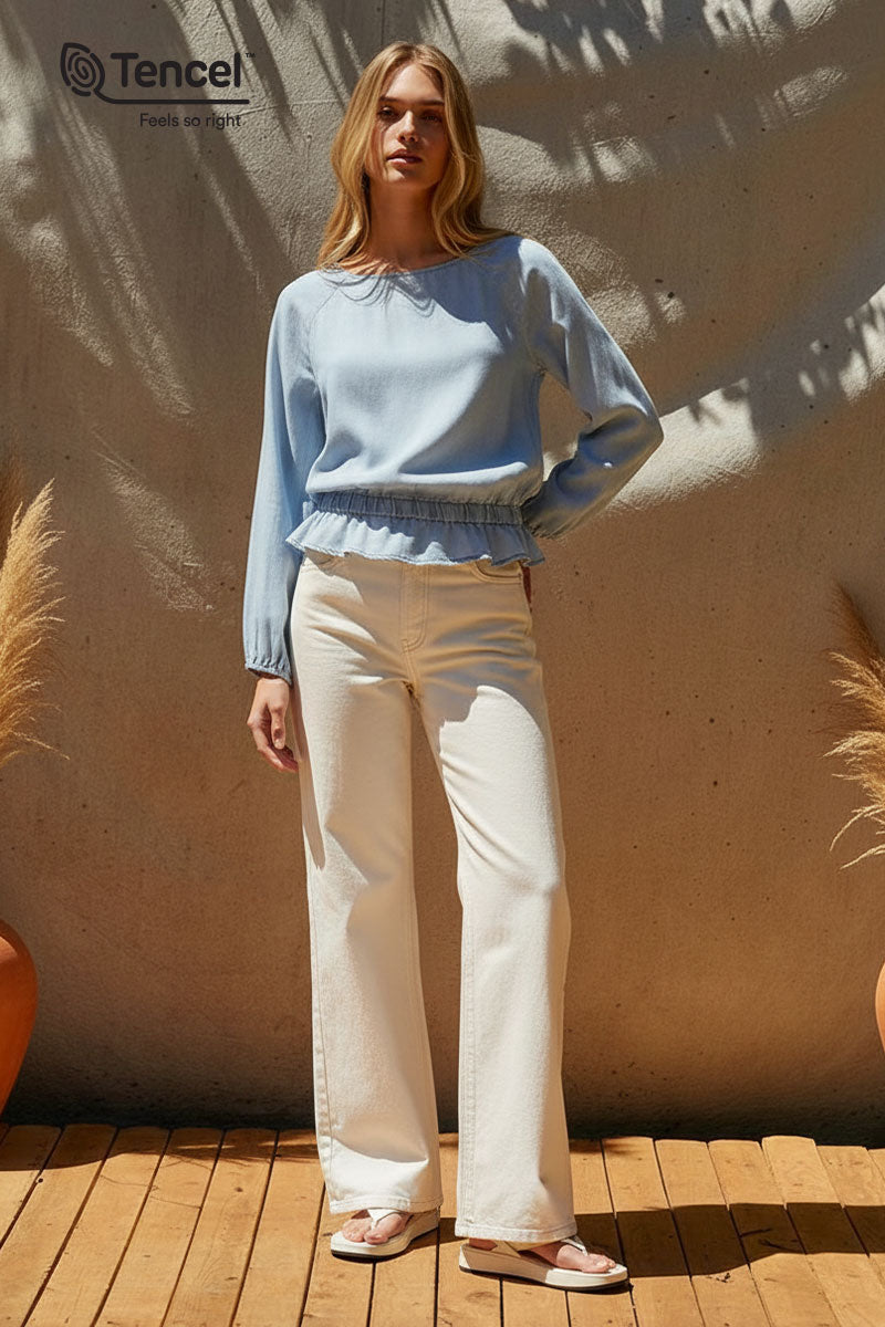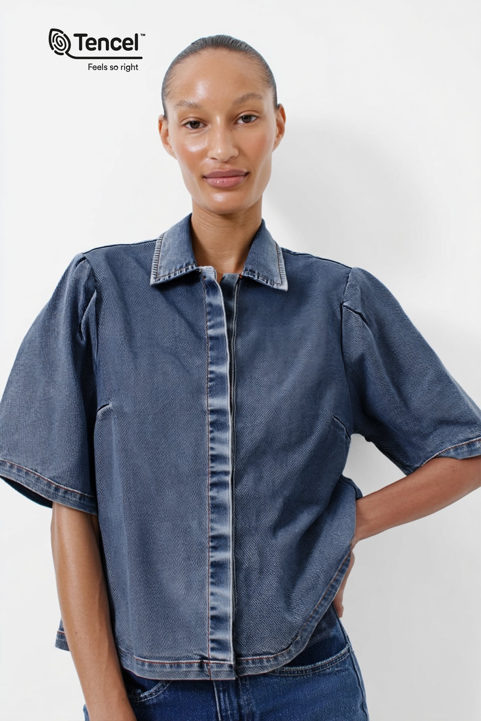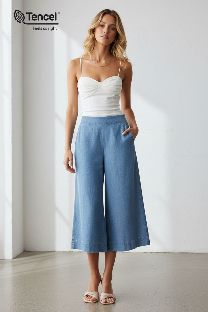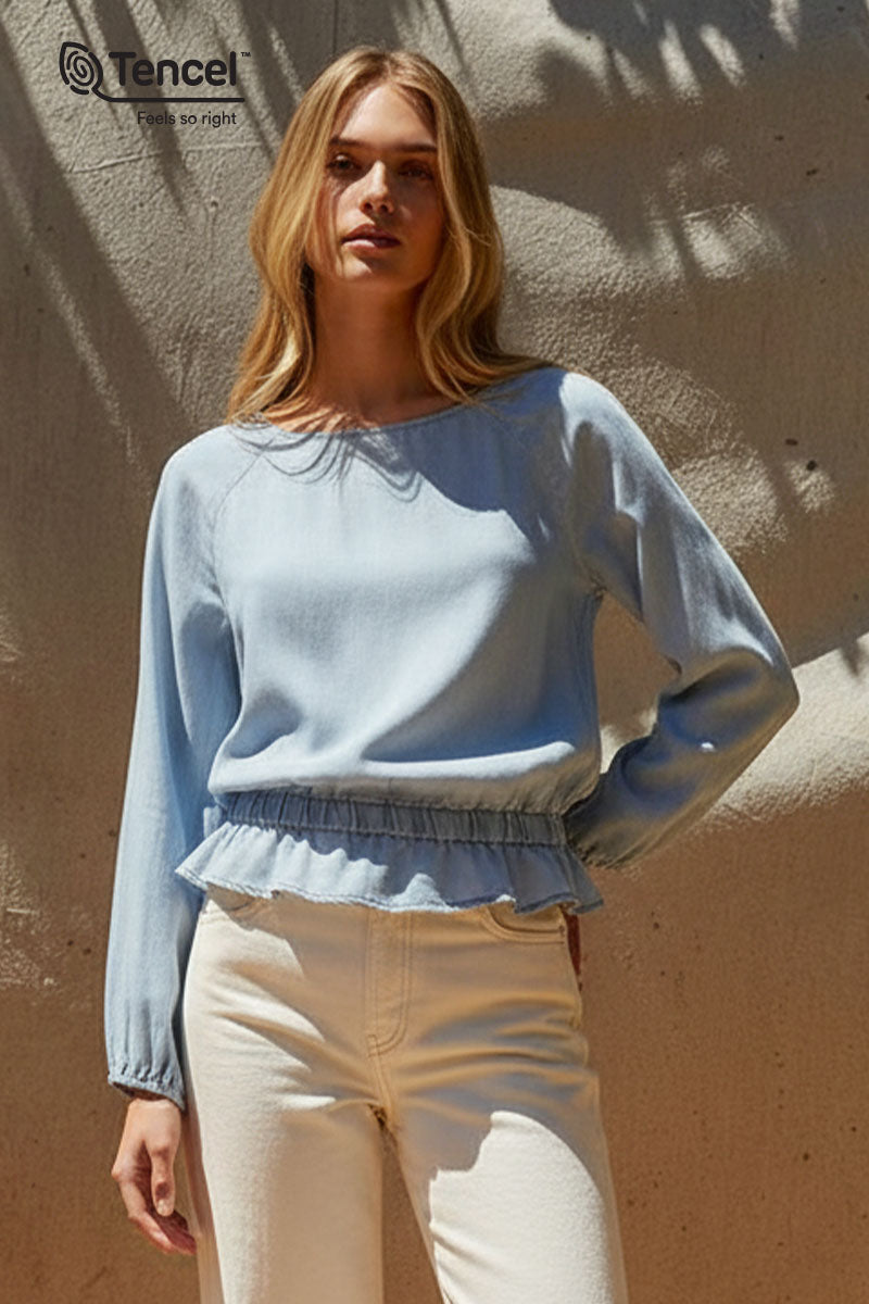 Our Tencel™ fabric is made from sustainably sourced wood pulp, offering a luxurious, eco-friendly alternative to traditional fabrics. Known for its silky-soft texture, Tencel™ is gentle on the skin, highly breathable, and moisture-wicking, keeping you cool and comfortable throughout the day. The fabric’s fluid drape creates flattering silhouettes, while its natural shine adds a touch of elegance. Plus, Tencel™ is biodegradable, making it a responsible choice for both your wardrobe and the planet.