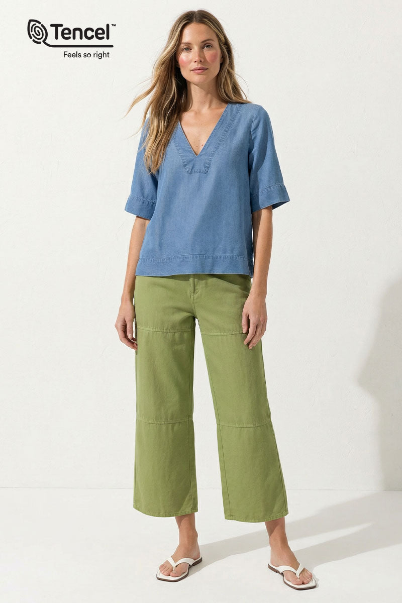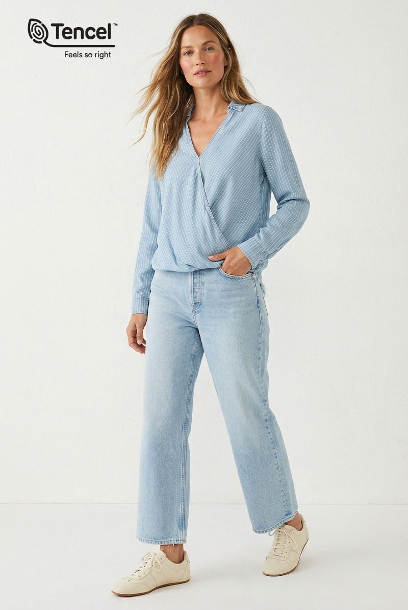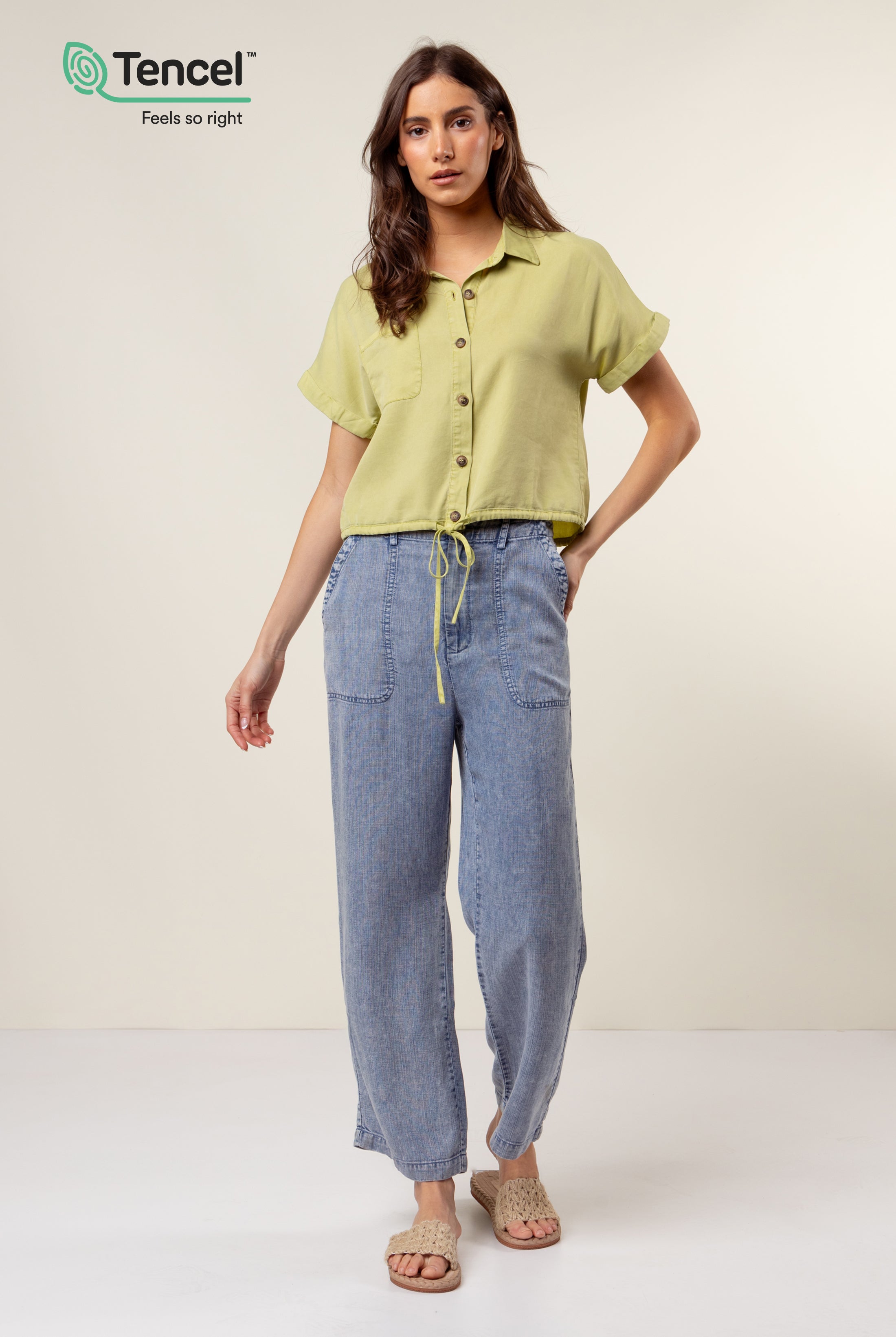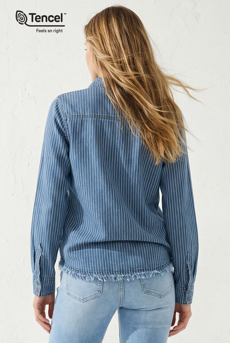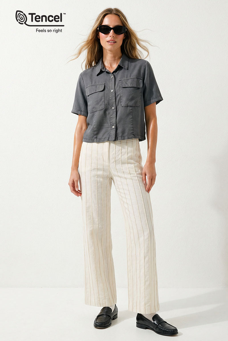 Our Tencel™ fabric is made from sustainably sourced wood pulp, offering a luxurious, eco-friendly alternative to traditional fabrics. Known for its silky-soft texture, Tencel™ is gentle on the skin, highly breathable, and moisture-wicking, keeping you cool and comfortable throughout the day. The fabric’s fluid drape creates flattering silhouettes, while its natural shine adds a touch of elegance. Plus, Tencel™ is biodegradable, making it a responsible choice for both your wardrobe and the planet.