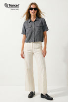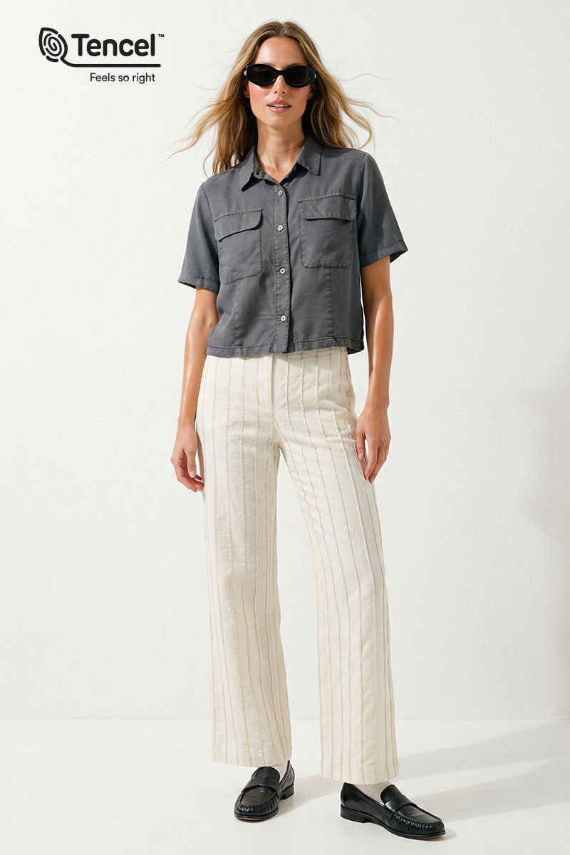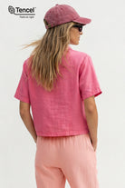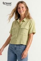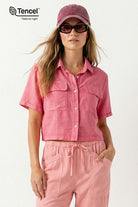 - Women's Garment Dyed Cropped Button Up Shirt with Patch Pockets.