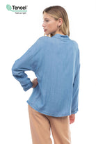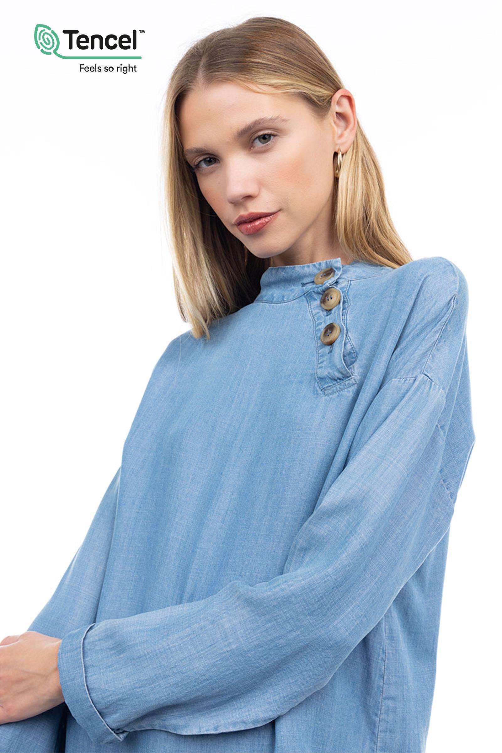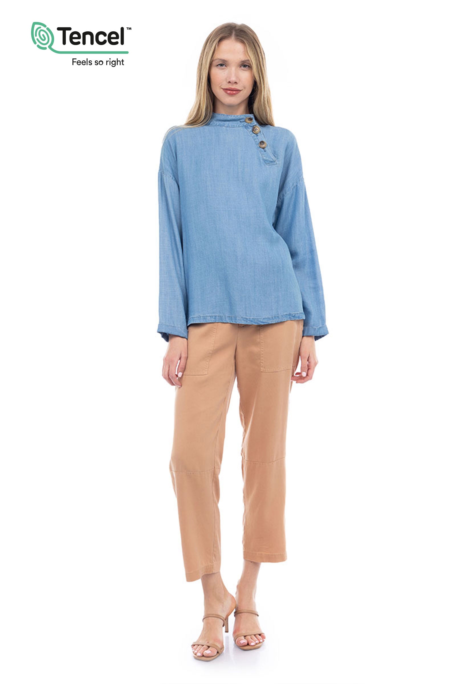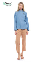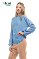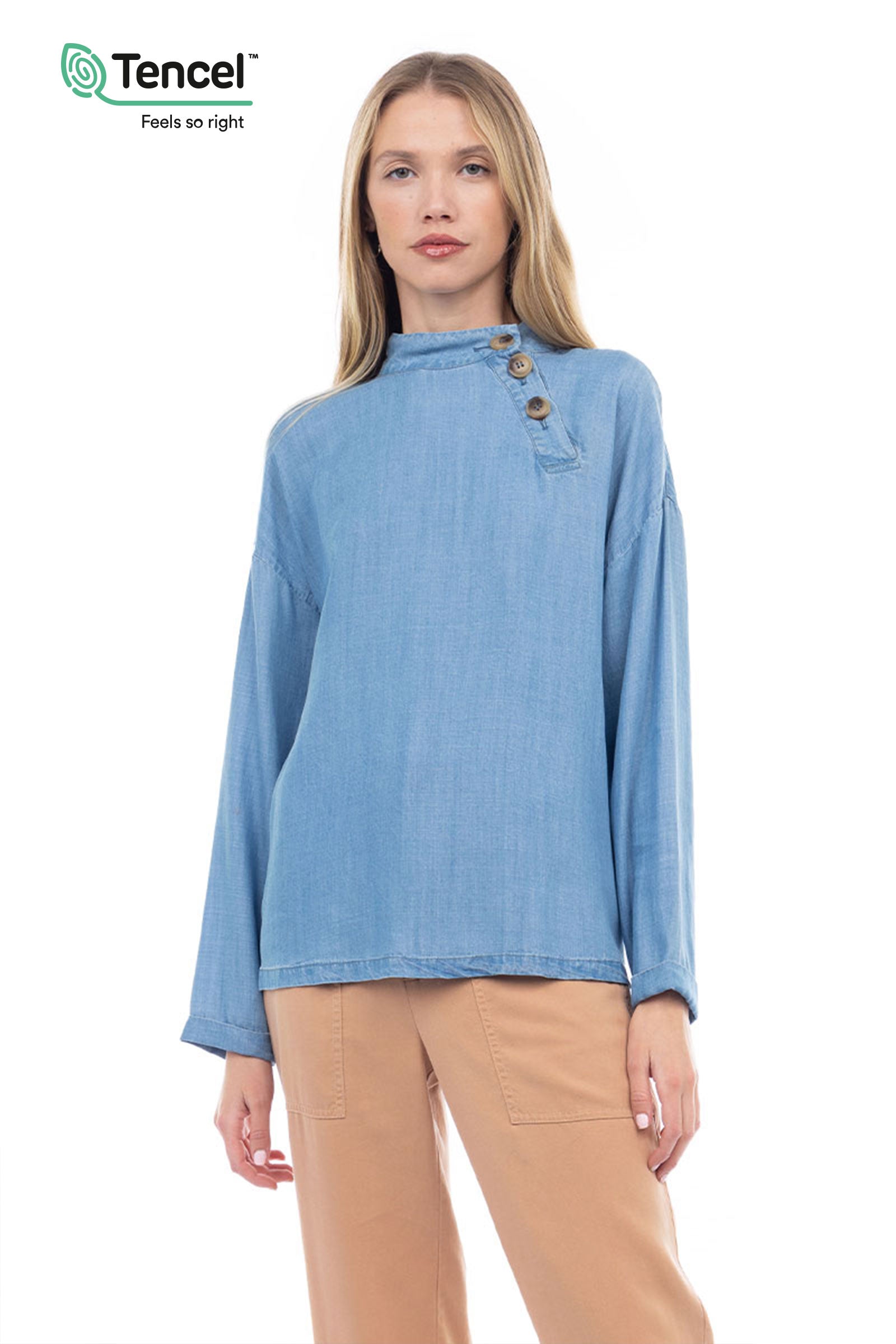 This blouse features a stylish mock neck and elegant button details, adding a touch of sophistication to any outfit. Made from high-quality materials, it offers both style and comfort in one. Perfect for both formal and casual occasions.