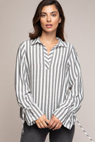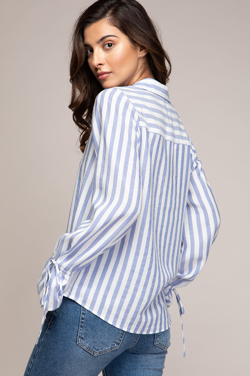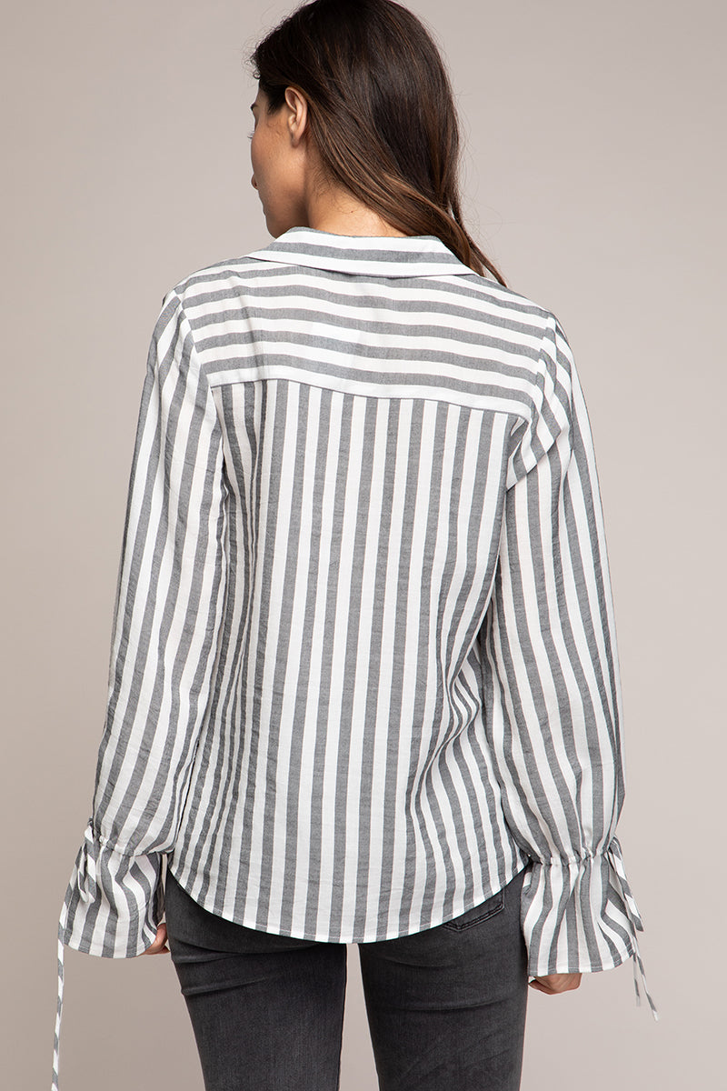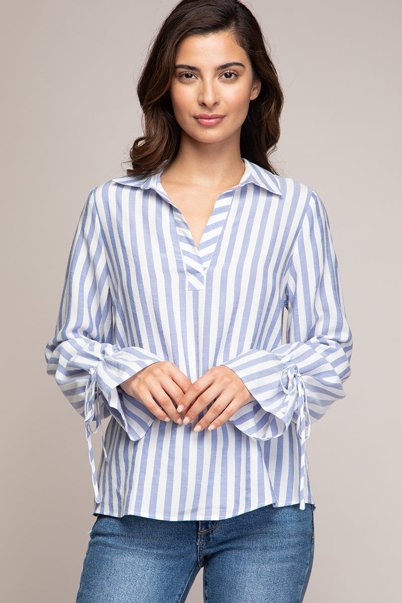 ╴Sophisticated V-neck with a structured collar and charming tie-cuff sleeves.