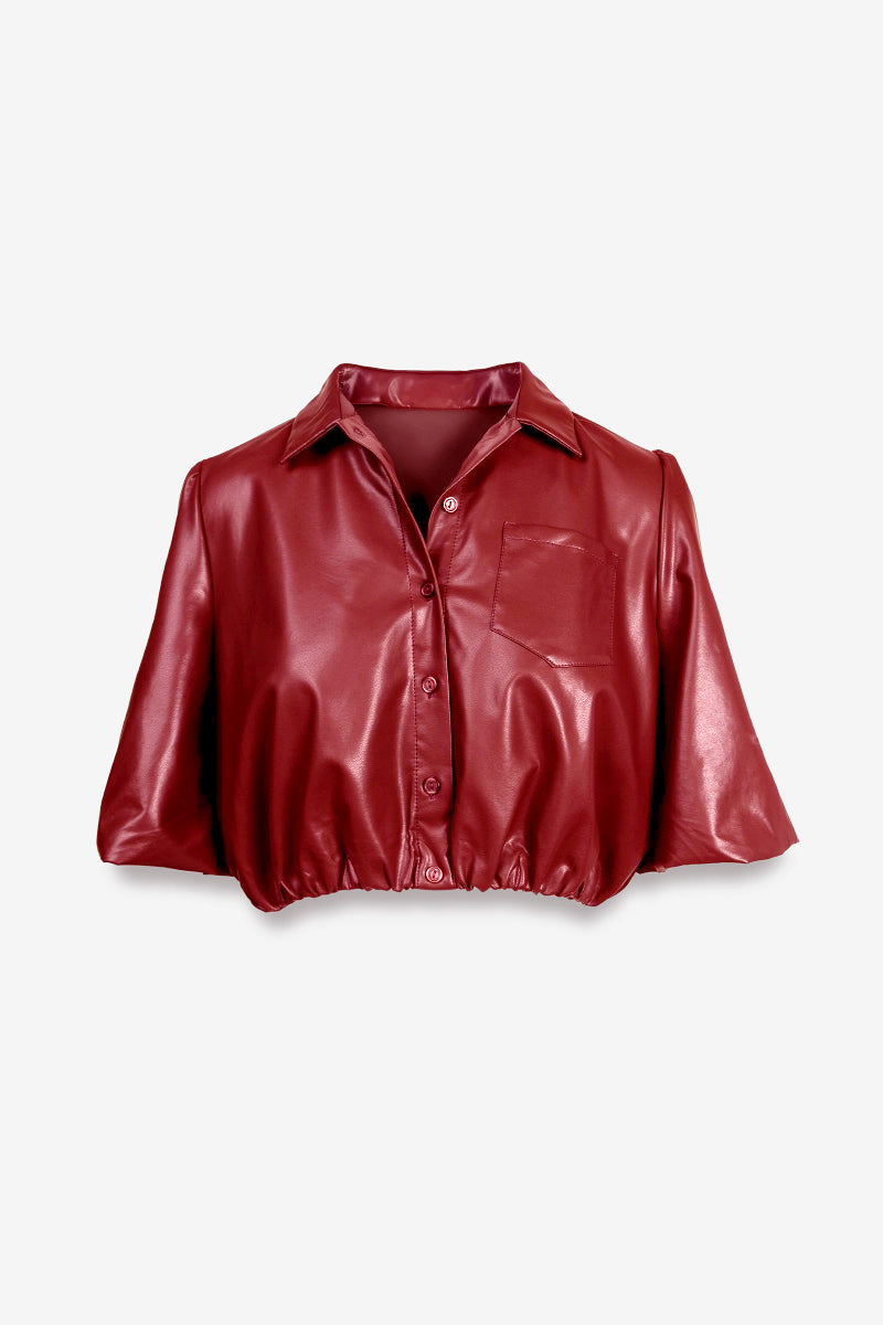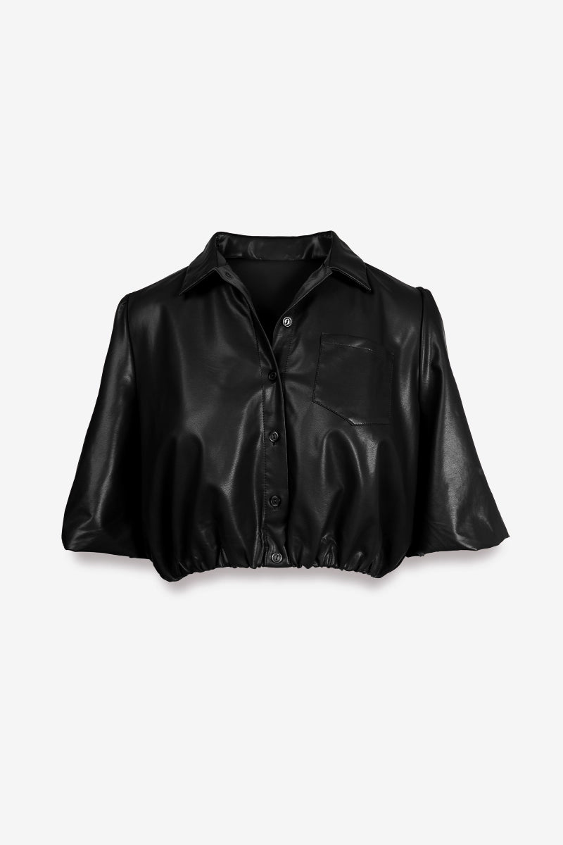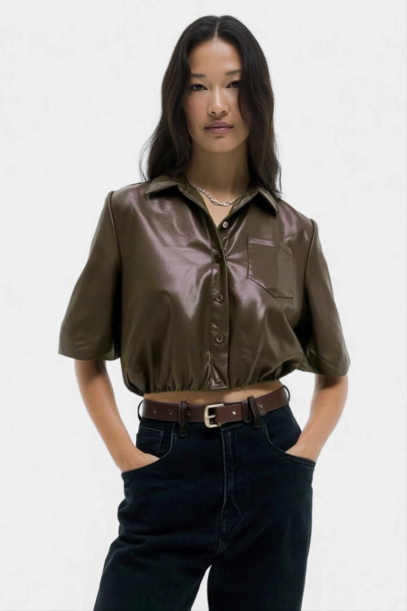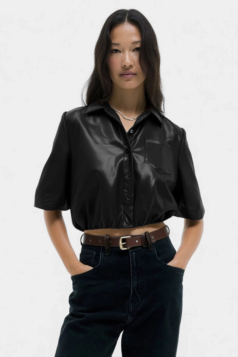Vegan Leather Cropped Button Up Blouse