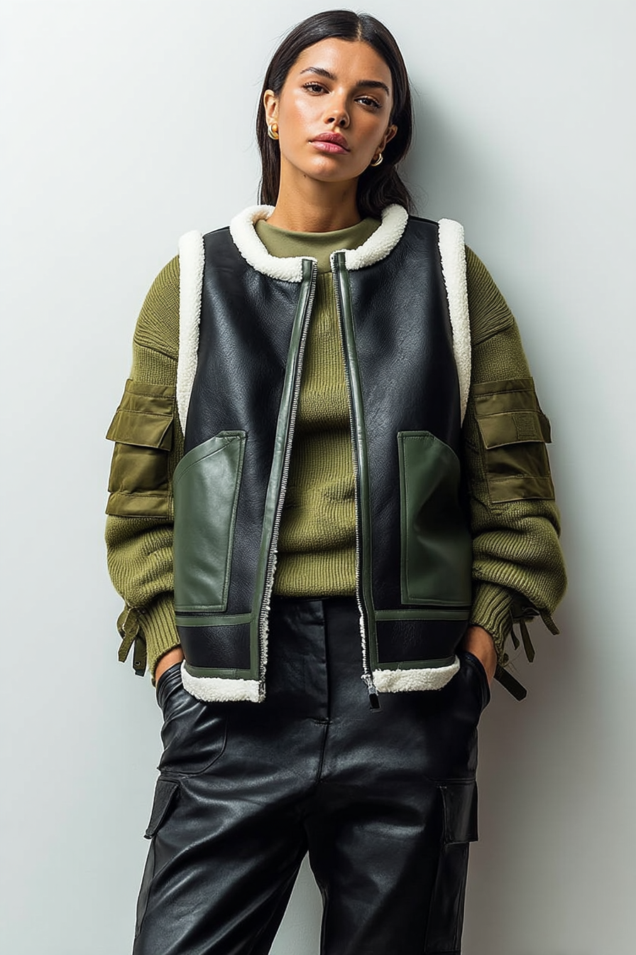 Faux Shearling-trimmed Leather Vest (3PCS 1PACK)