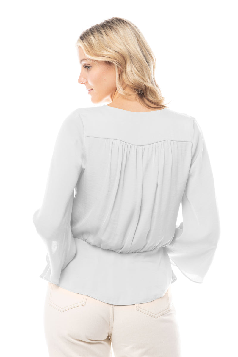 ╴Graceful flutter sleeves and a flattering V-neckline with a defined peplum waist.