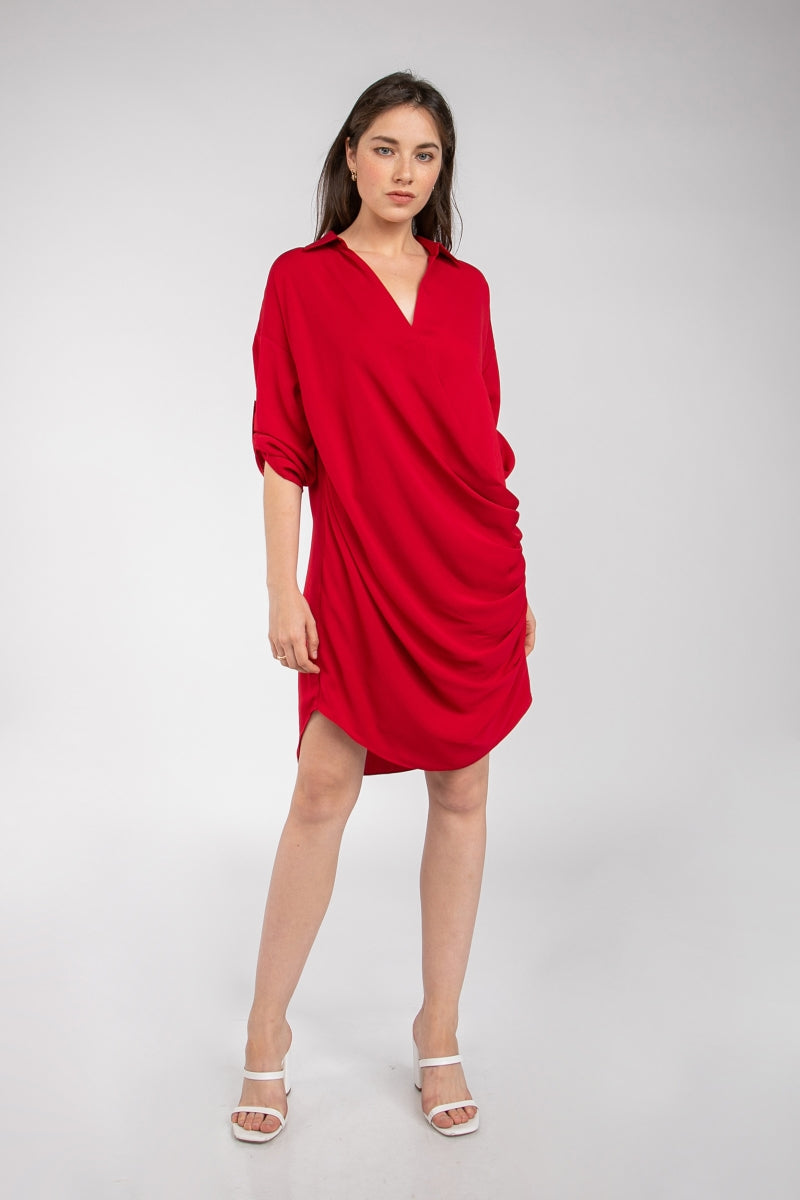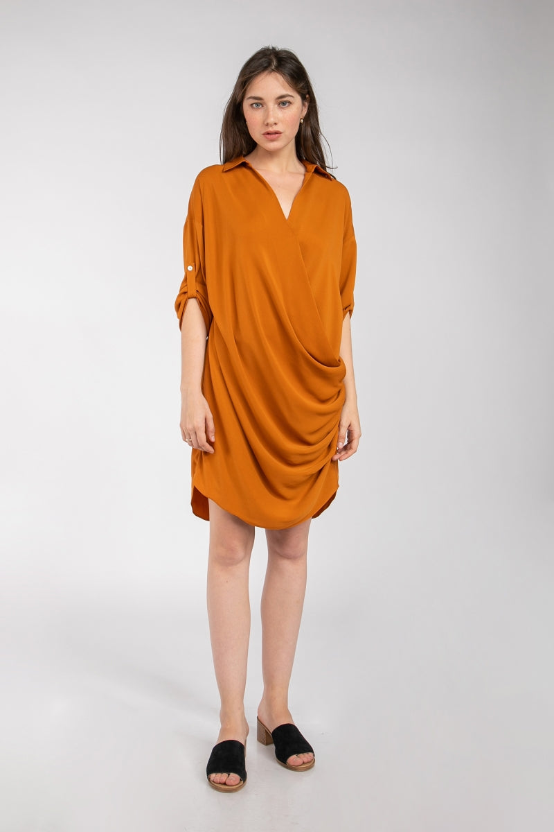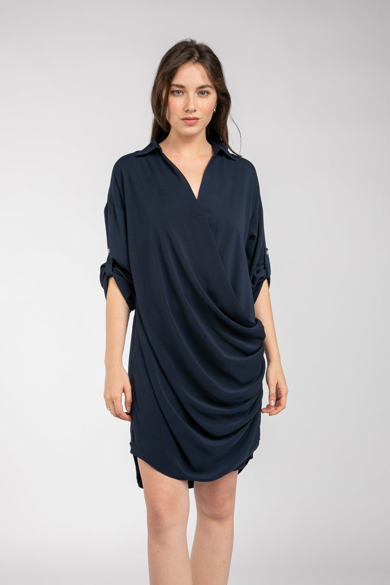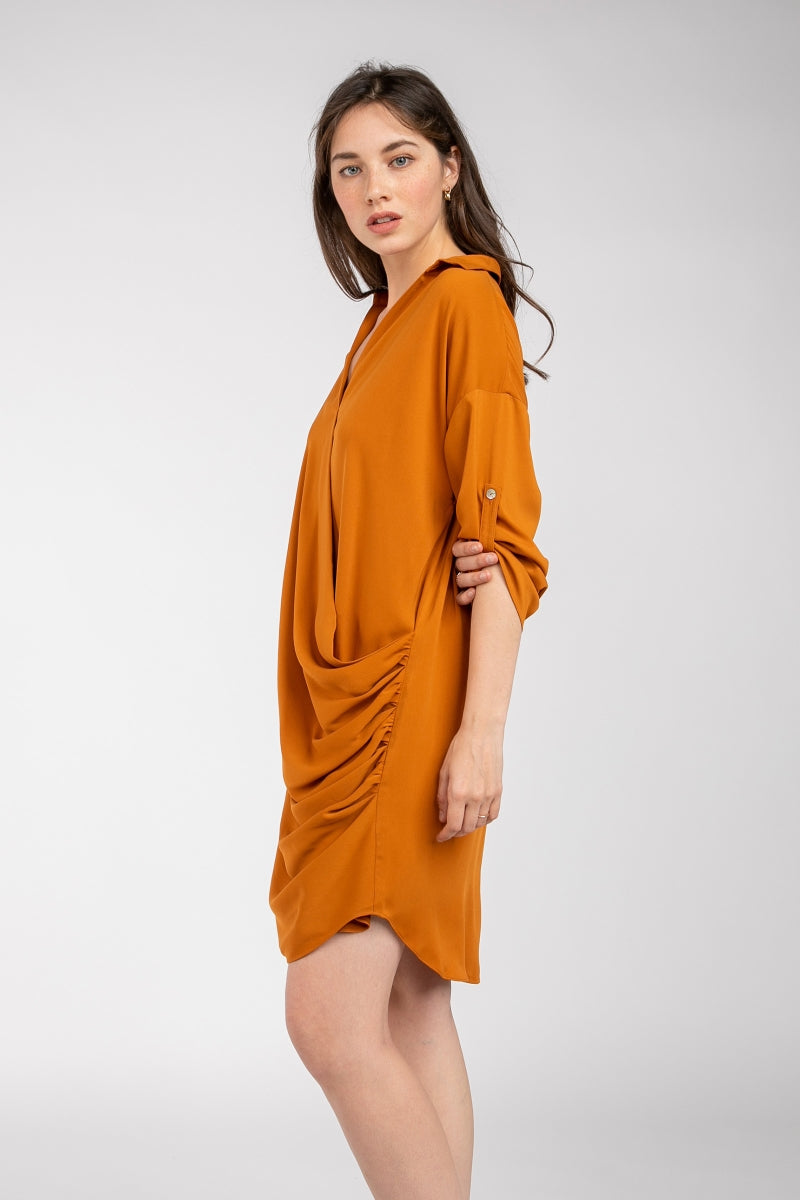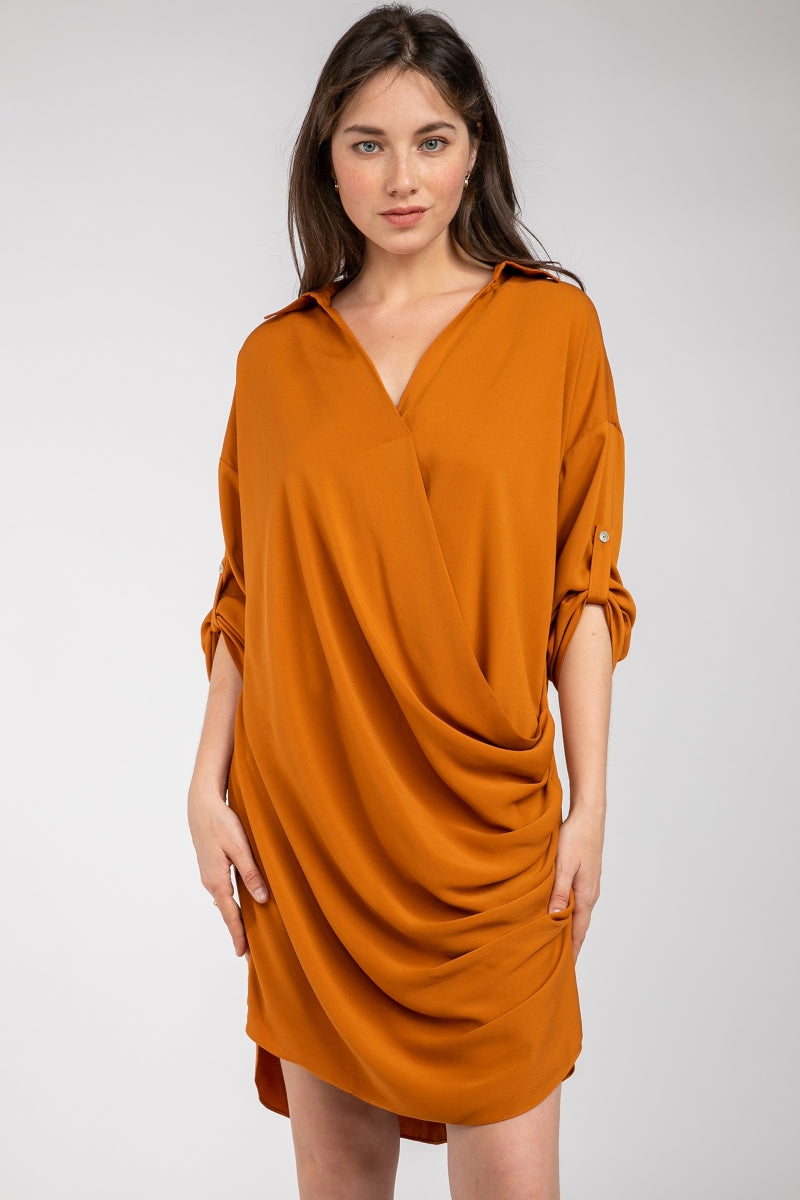 3/4 Sleeve Mini Cowl Front Shirt Dress