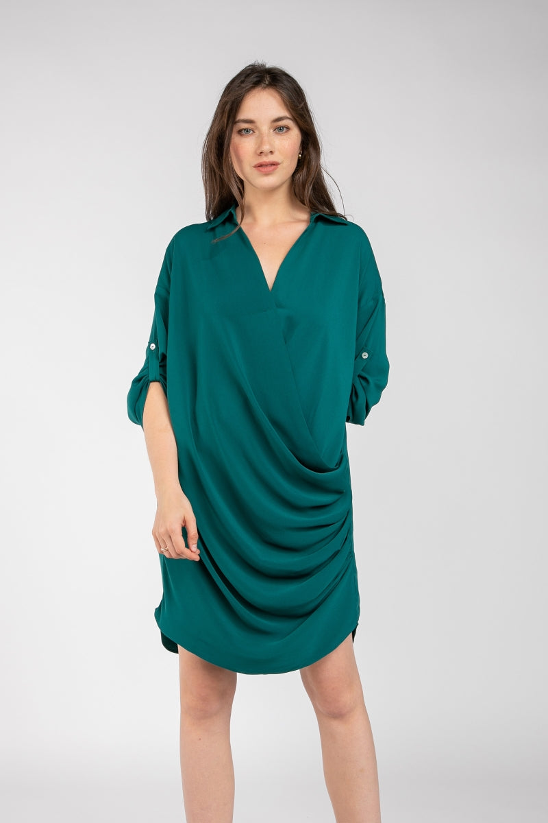 Women's 3/4 Sleeve Mini Cowl Front Shirt Dress