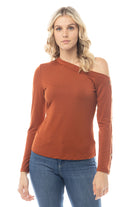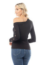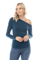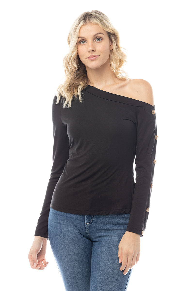 This Asymmetric Long Sleeve Knit Top features a striking off-shoulder design and sleek button detailing along the sleeve for a unique, modern look. Crafted from soft, stretchy knit fabric, it offers a perfect blend of comfort and style, easily transitioning from casual outings to evenings out.