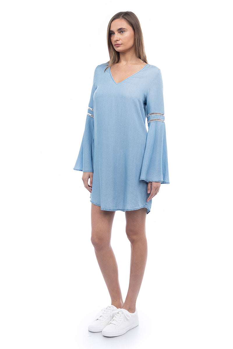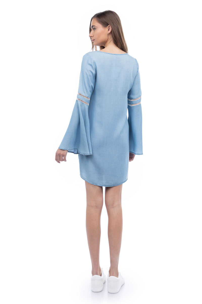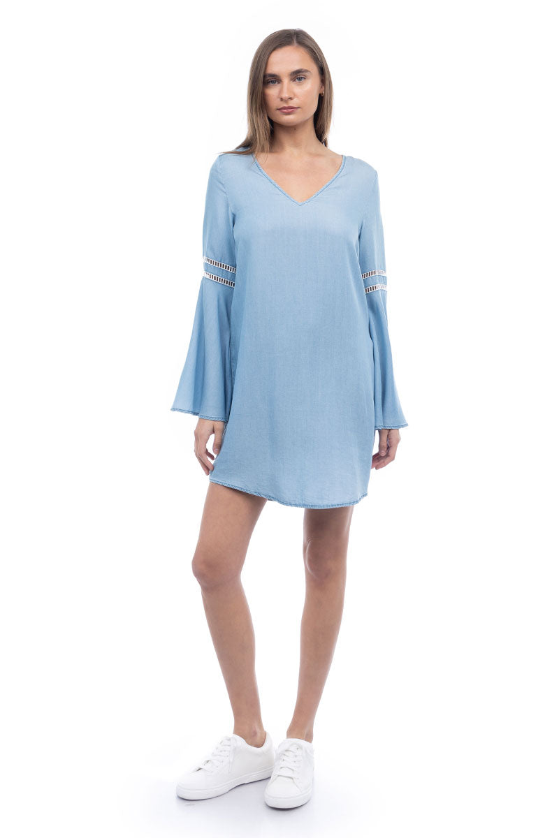 The Bell Sleeve Dress with Ladder Trim is a perfect mix of elegance and boho charm. Featuring dramatic bell sleeves and intricate ladder trim details, this dress adds texture and sophistication. Its flowing silhouette makes it a versatile choice for daytime outings or evening events, offering effortless style with a touch of flair.