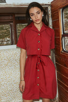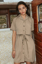 ╴Women's Button Front Mini Shirt Dress With Drawstring Waist