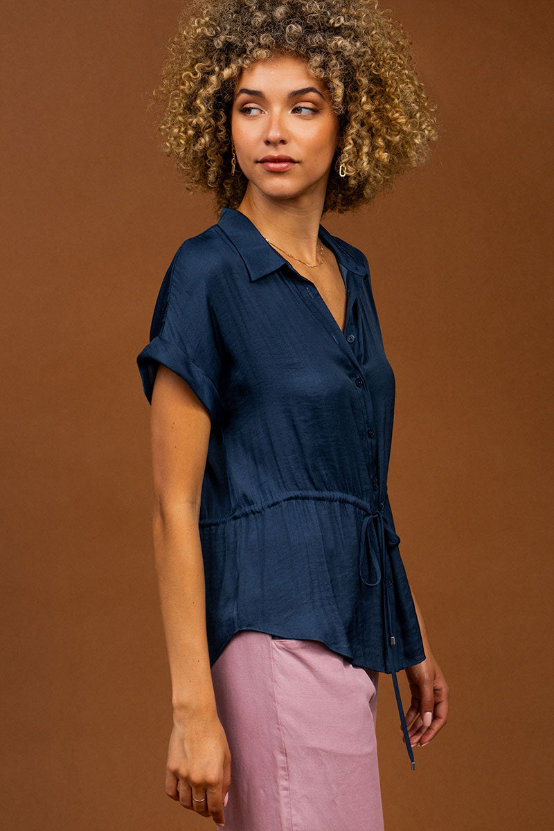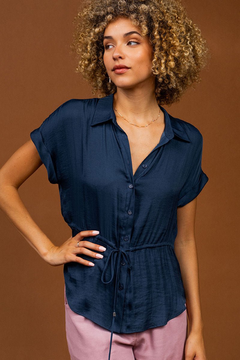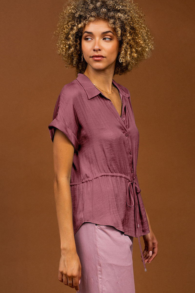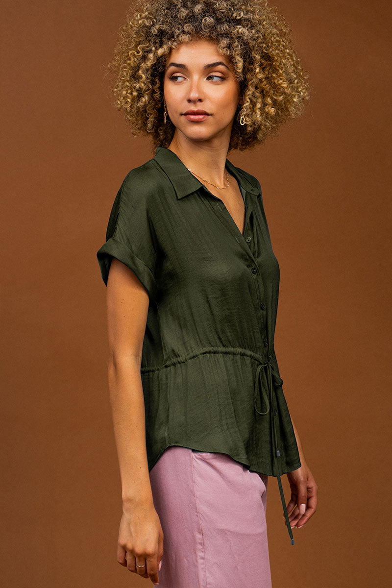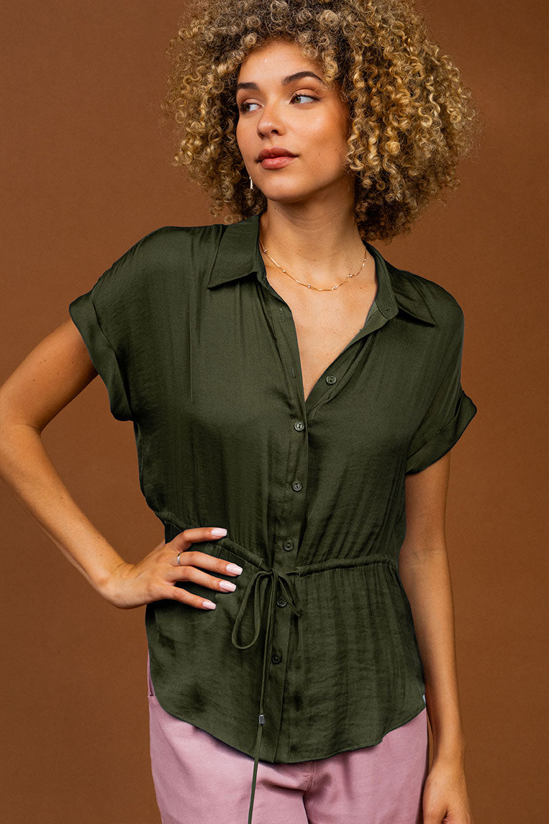 - Women's Button-Up Shirt with Self Belt in darker tones.