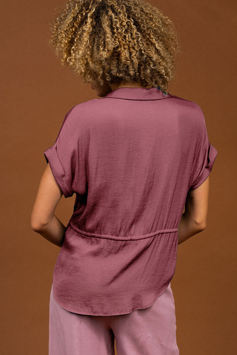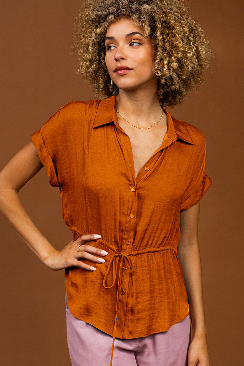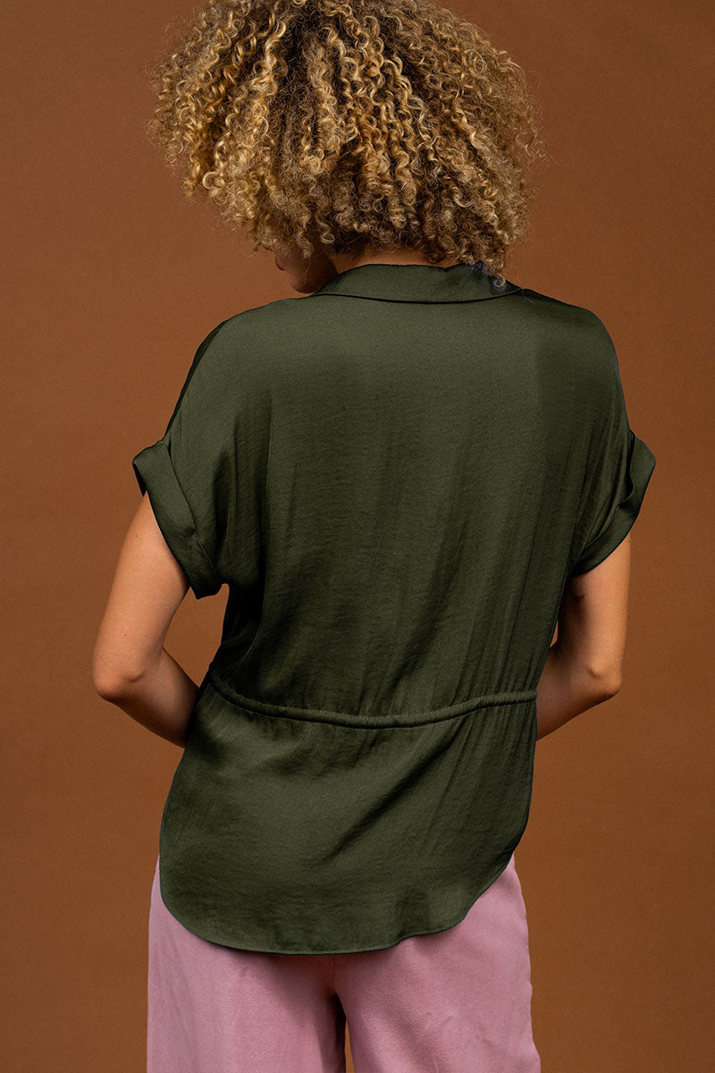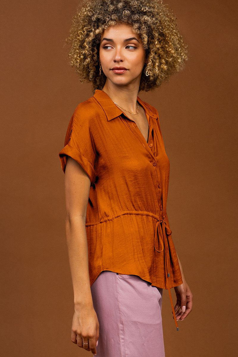- Women's Button-Up Shirt with Self Belt in darker tones.
