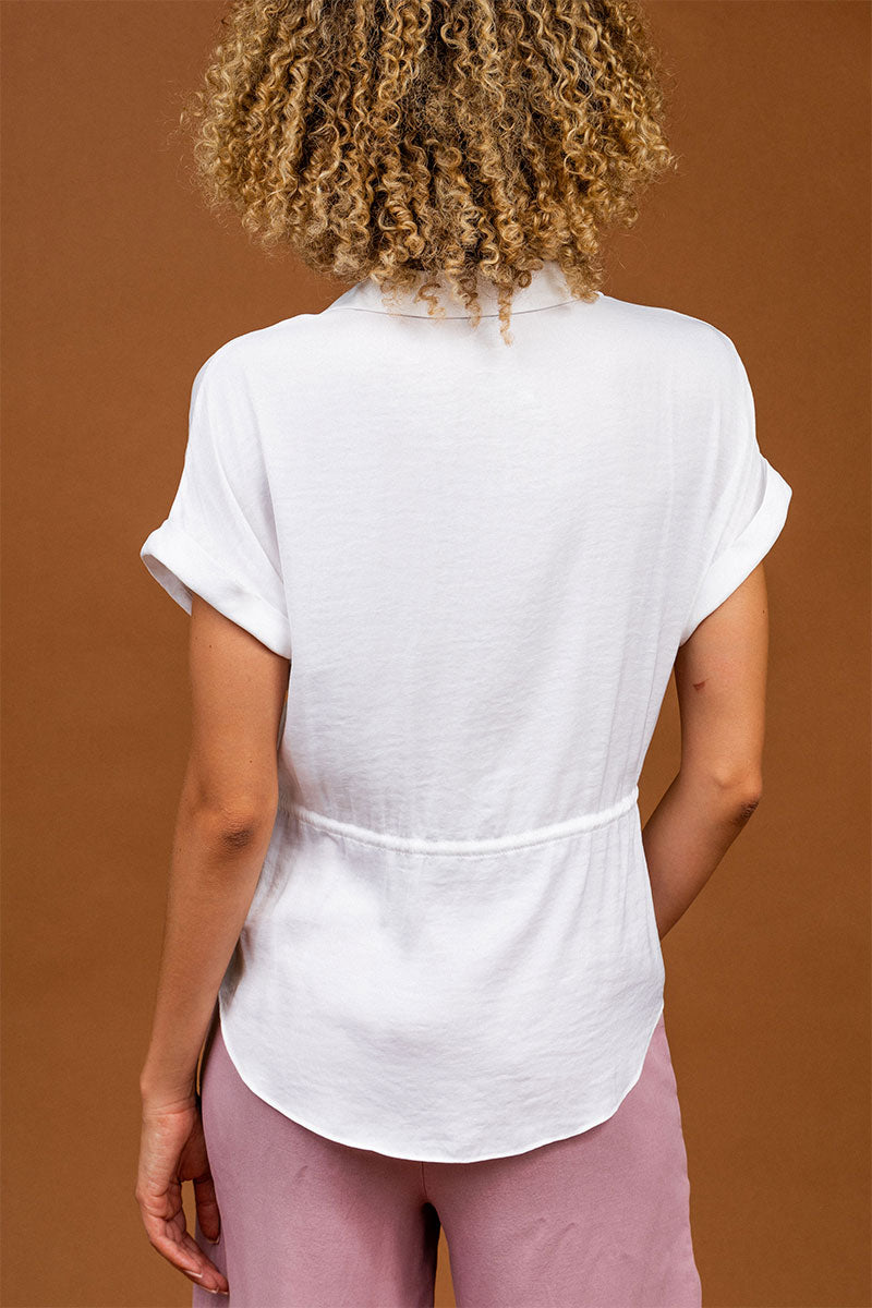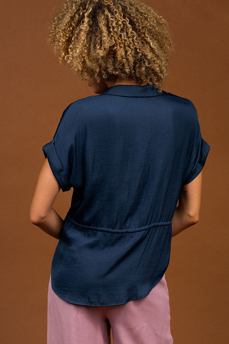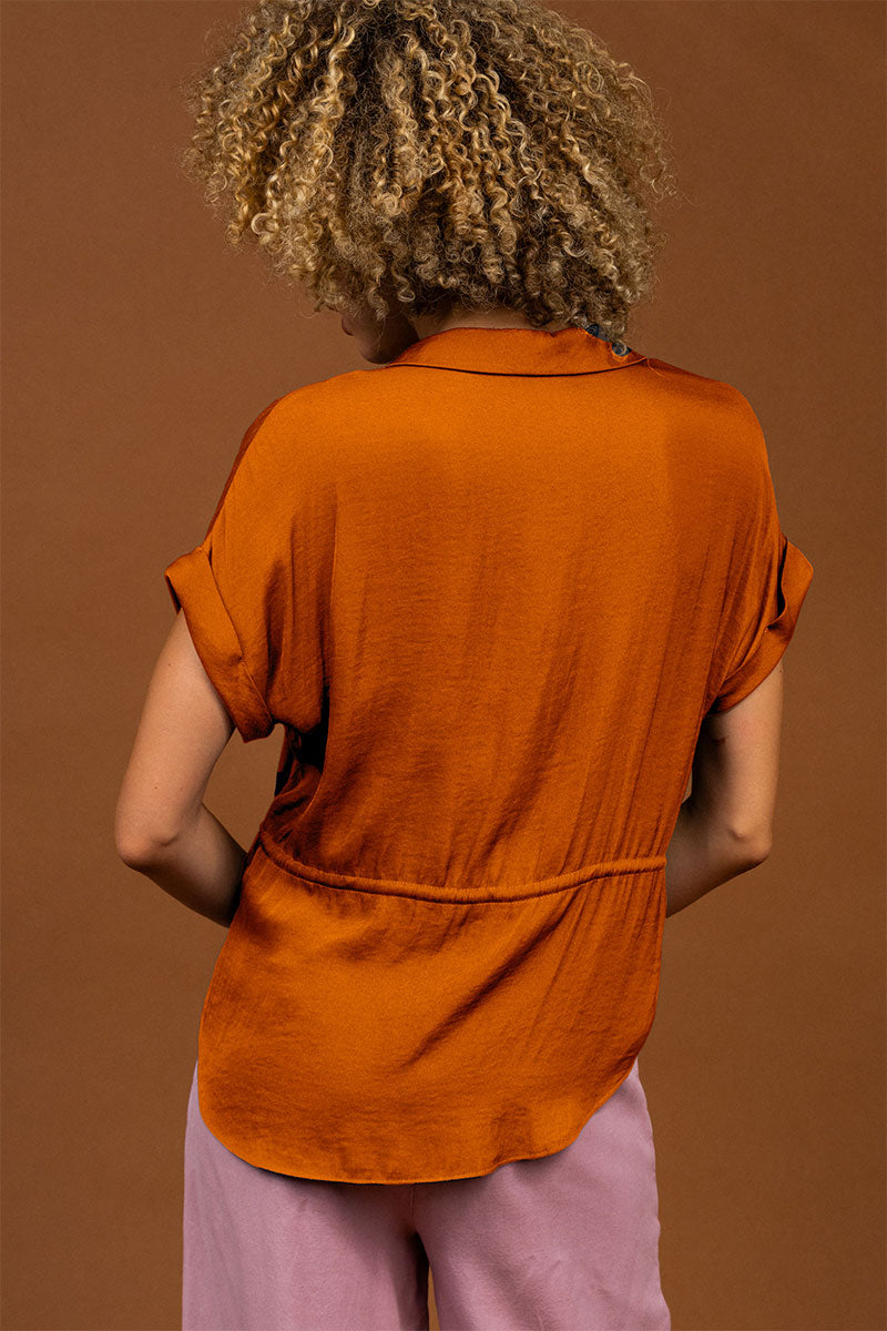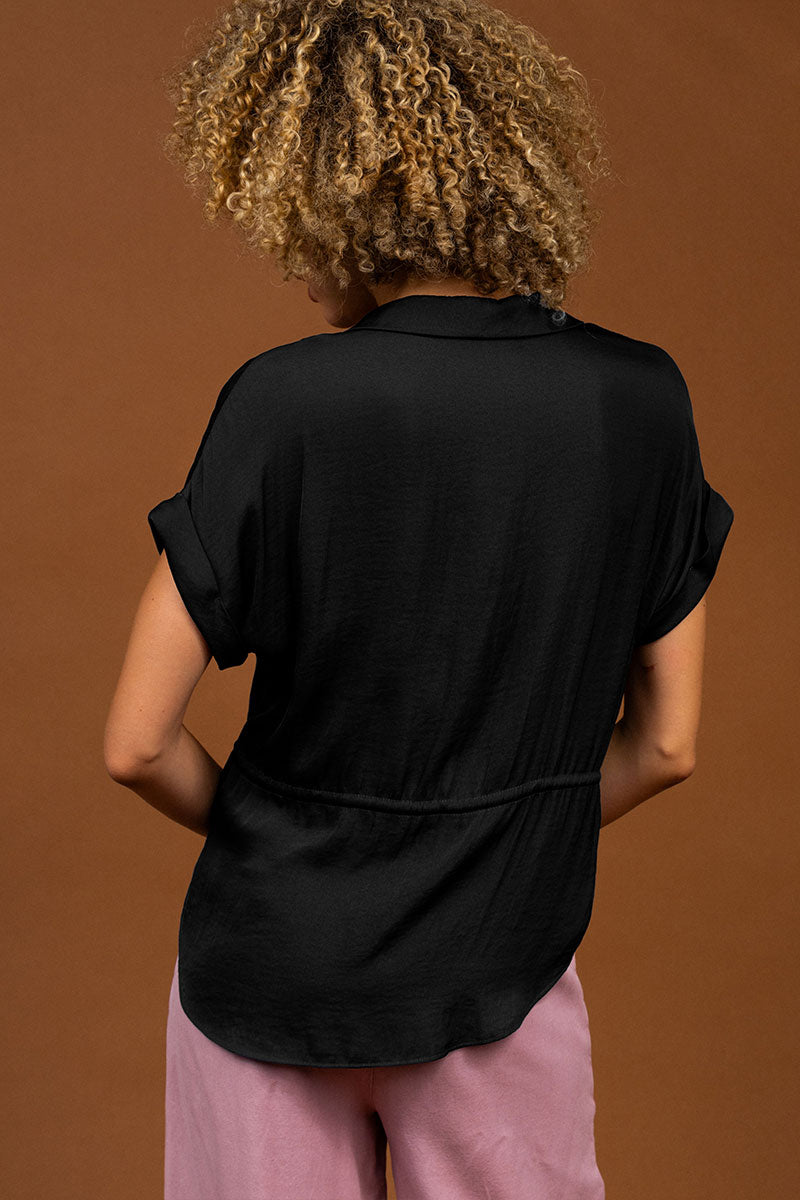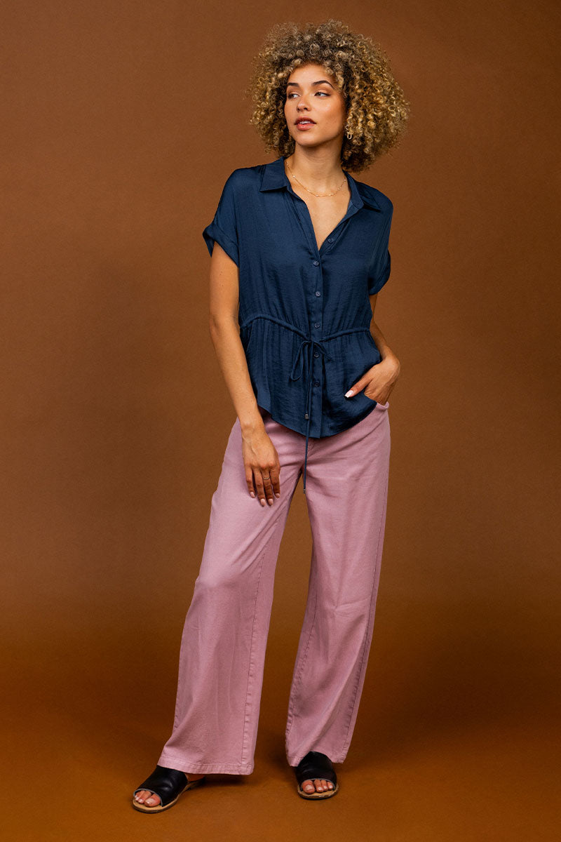 - Women's Button-Up Shirt with Self Belt in darker tones.