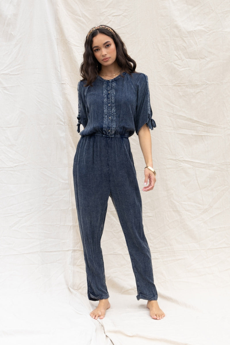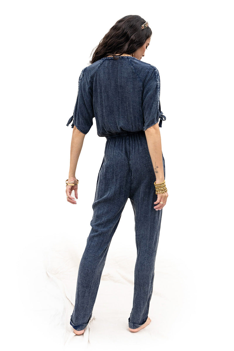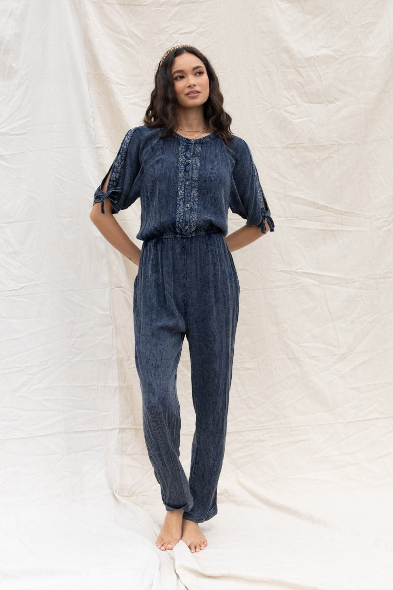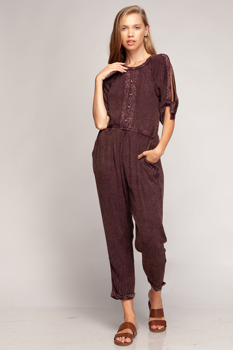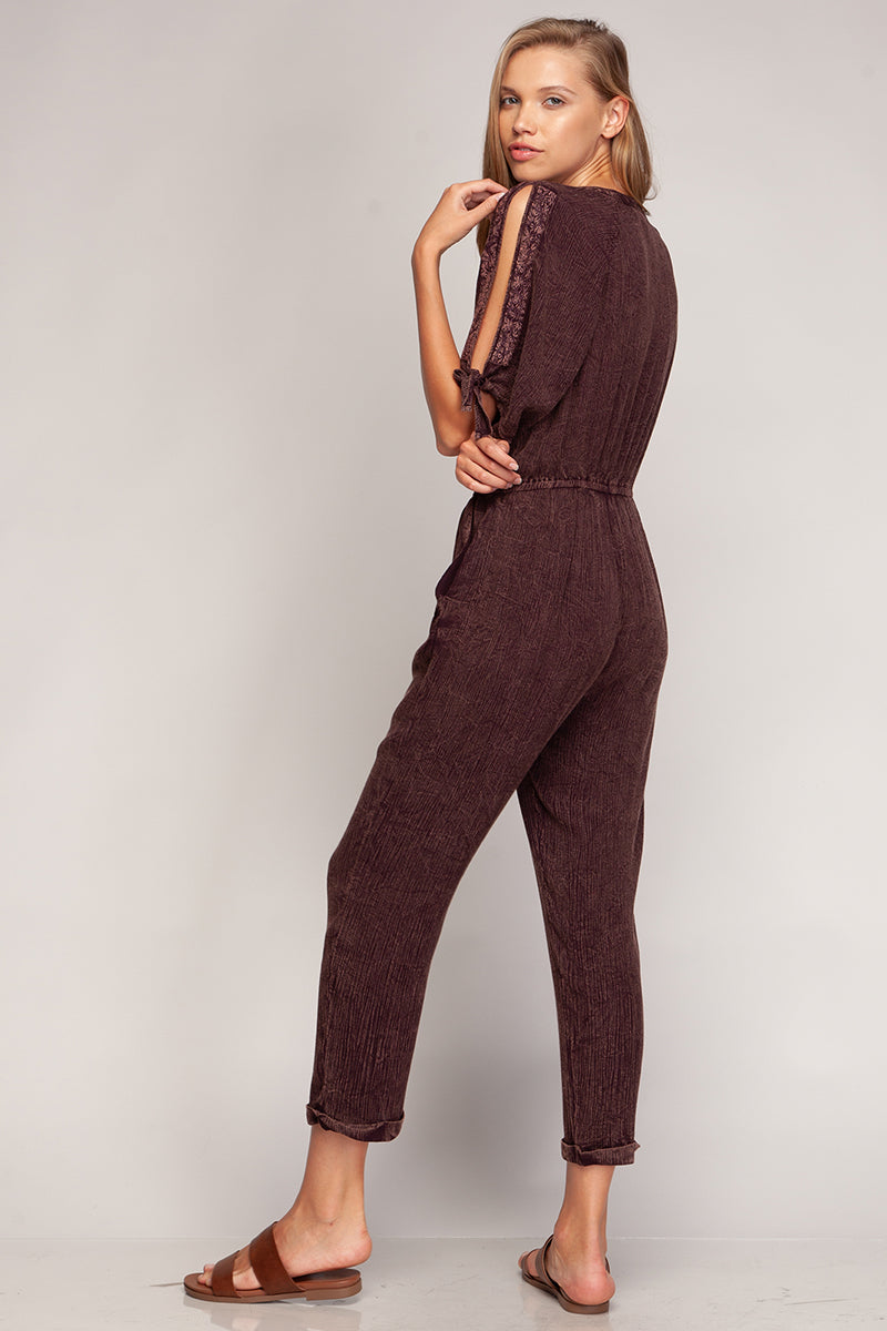 ╴Women's Cold Shoulder Tied Button Down Jumpsuit