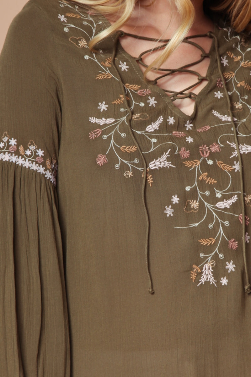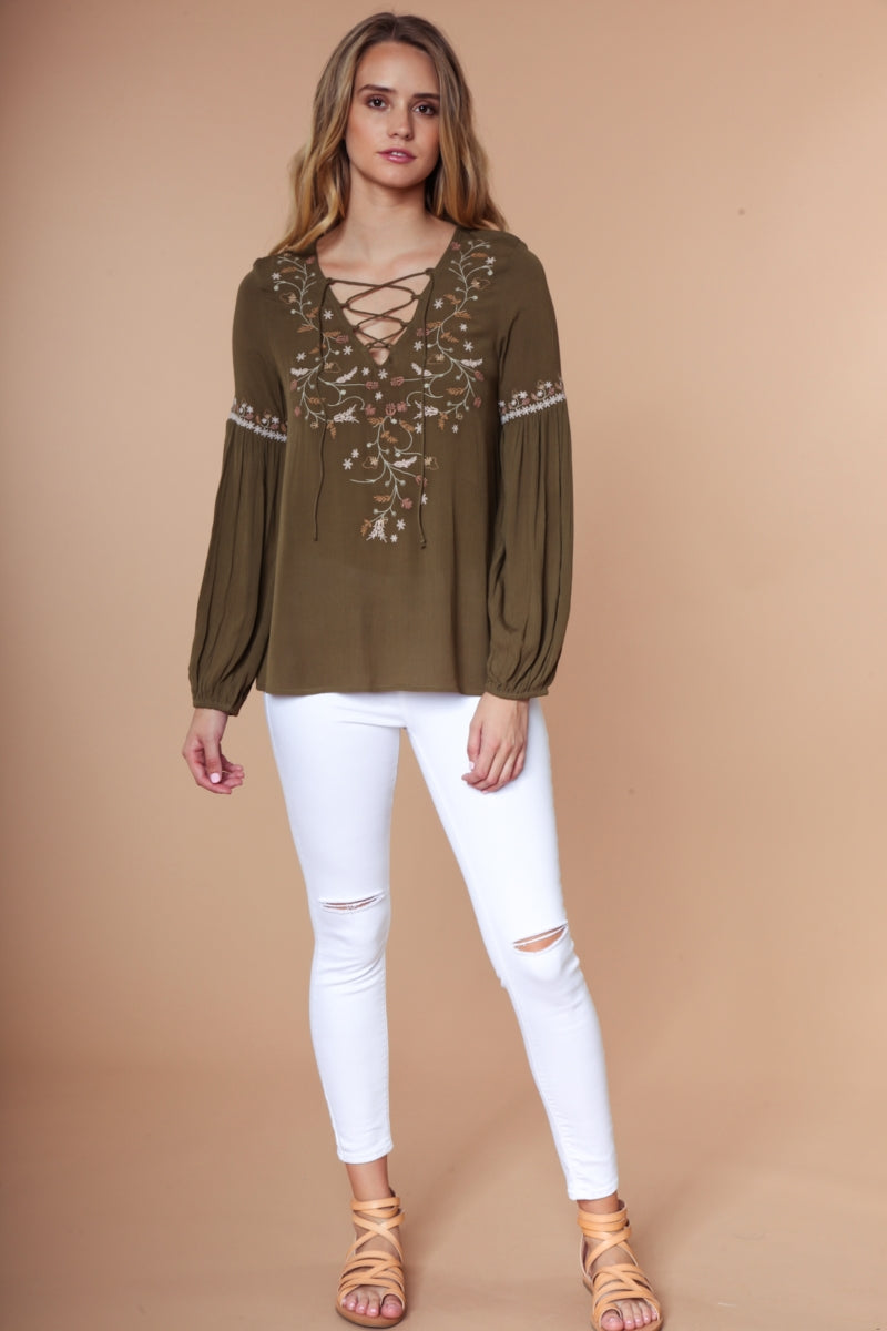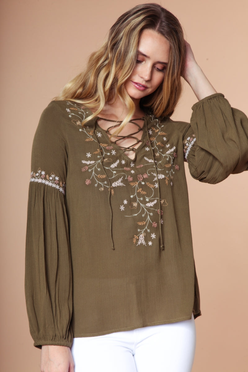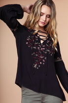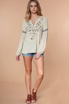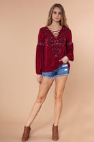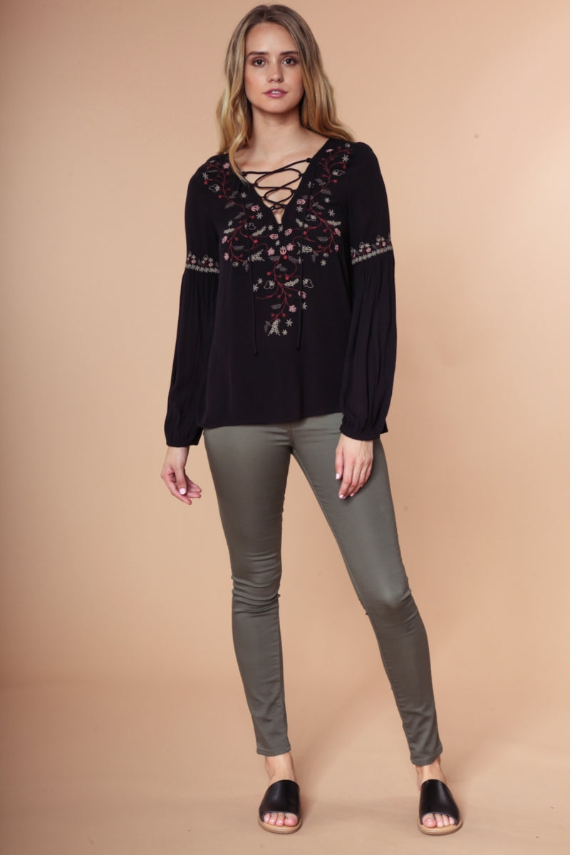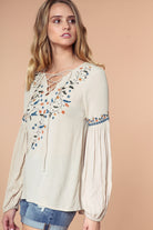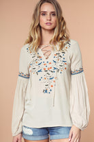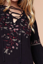 Embroidered Lace Up Long Sleeve Blouse
