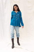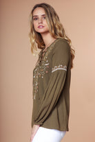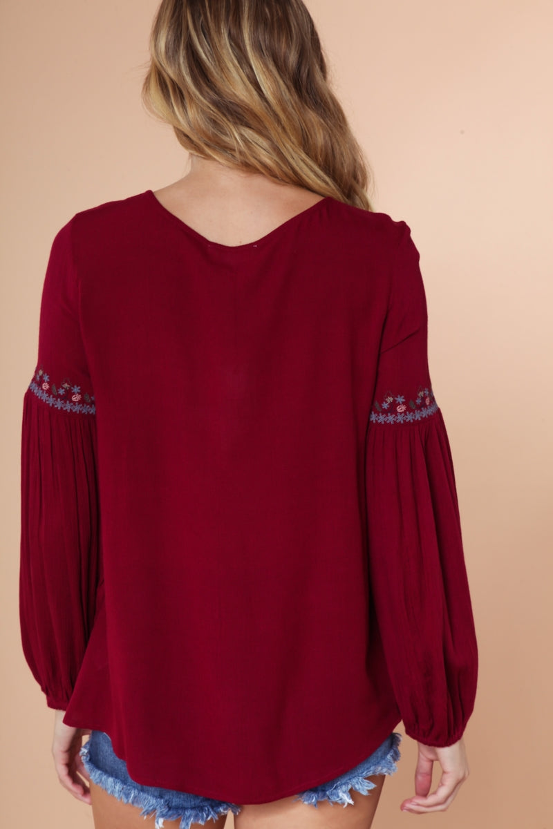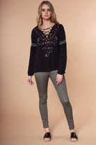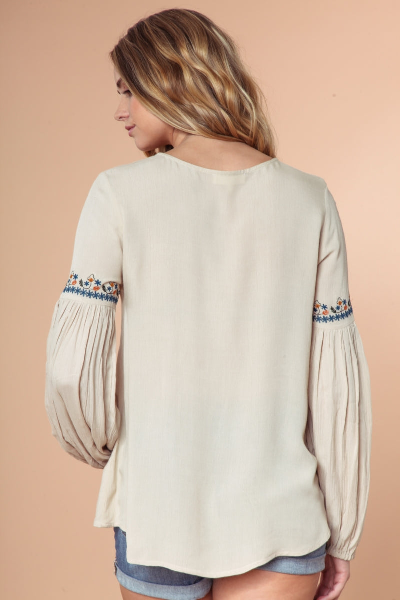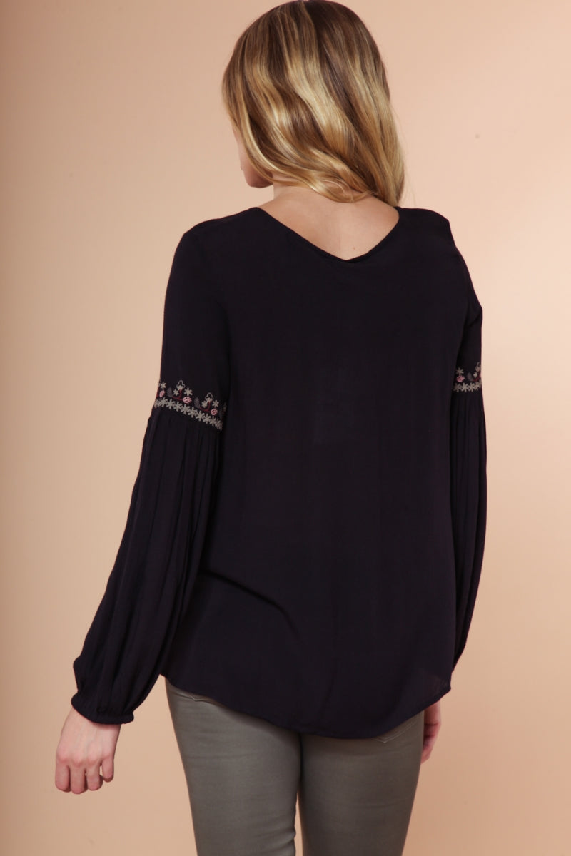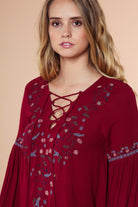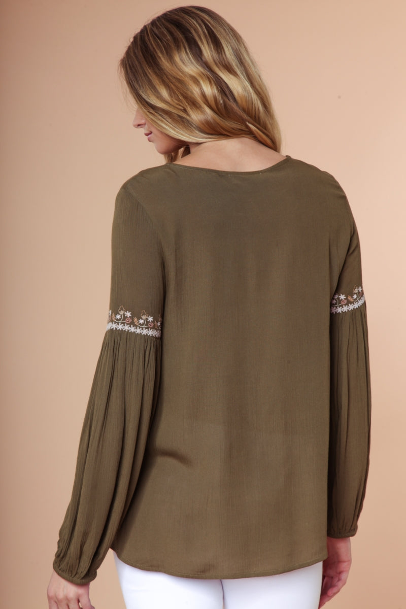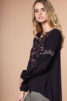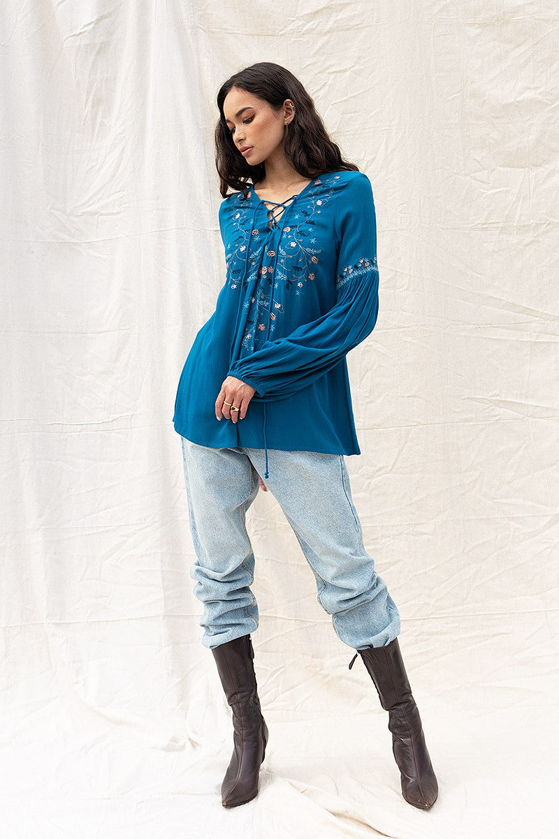 Embroidered Lace Up Long Sleeve Blouse