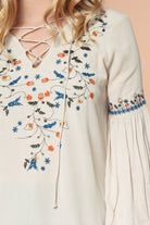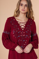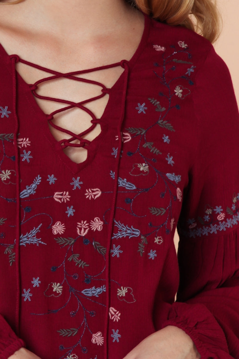 ╴Features intricate embroidery and a lace-up neckline for a soft, bohemian touch.