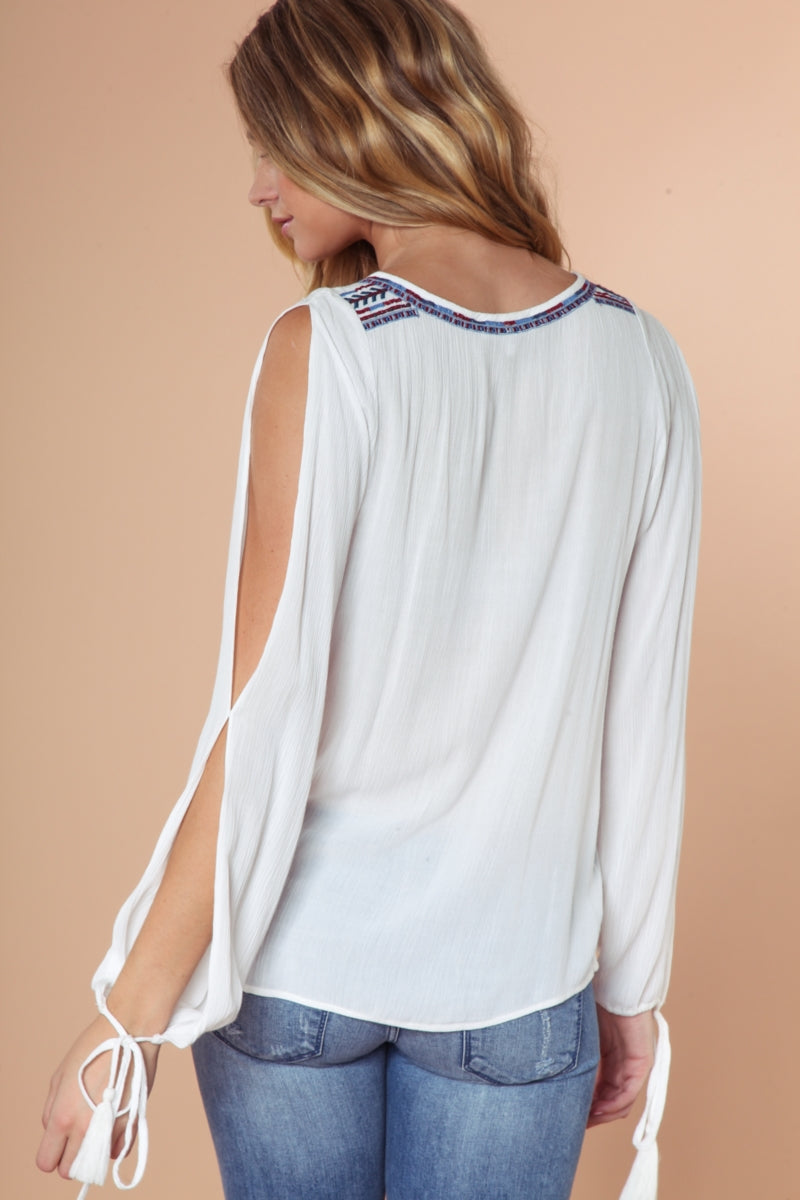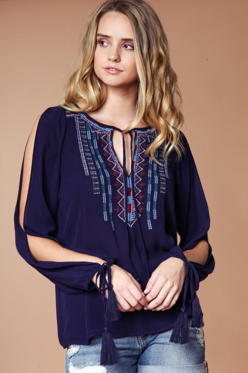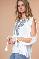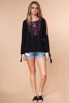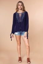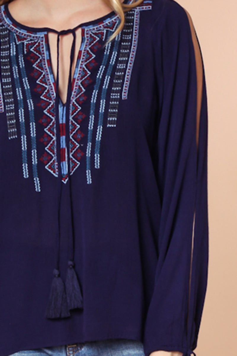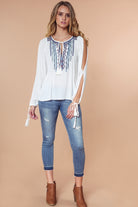 ╴Women's Embroidered Tassel Tie Long Sleeve Blouse