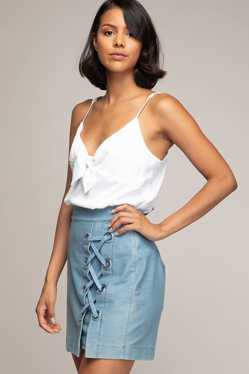 This eyelet lace up mini skirt is perfect for a night out or a fun day out with friends. The intricate lace up design adds a touch of elegance to the classic mini skirt style. Made with high-quality materials, this skirt is comfortable and stylish. Elevate your wardrobe with this must-have piece.