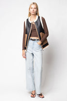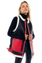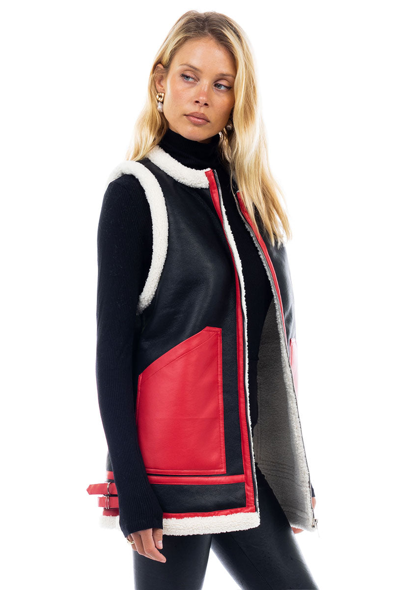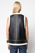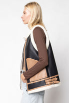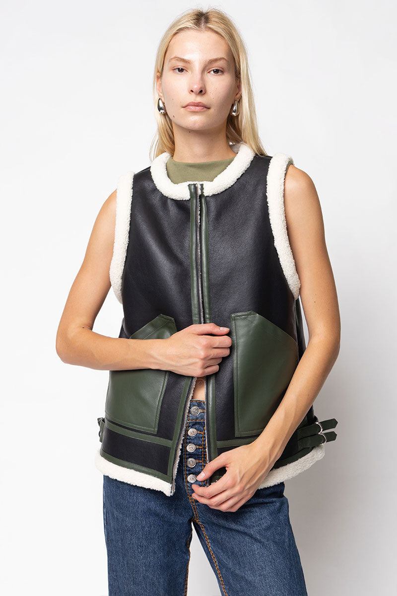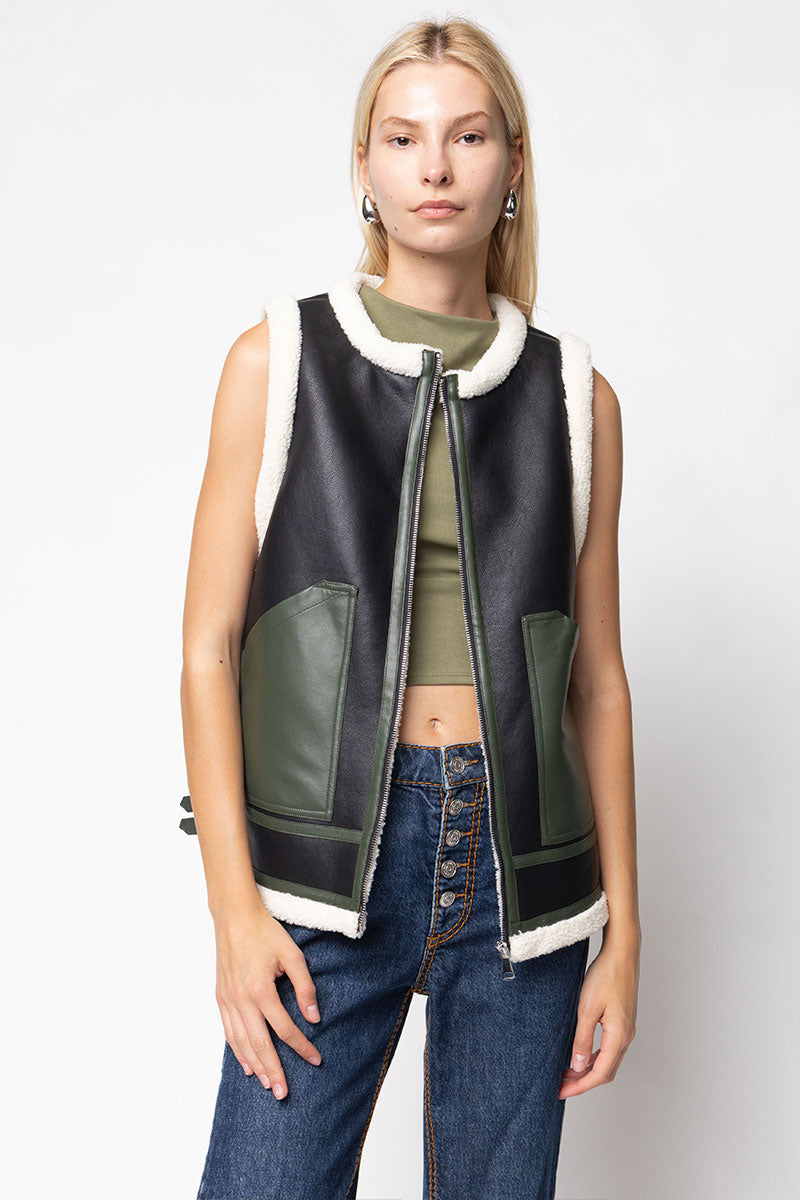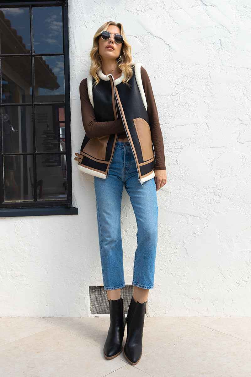 The Faux Shearling-Trimmed Leather Vest combines rugged style with luxurious detail. Featuring a sleek leather construction and cozy faux shearling trim, this vest adds a sophisticated edge to your outfit. Perfect for layering in cooler weather, it brings both warmth and contemporary flair to any wardrobe.