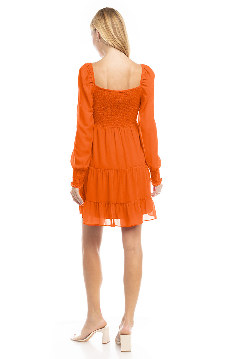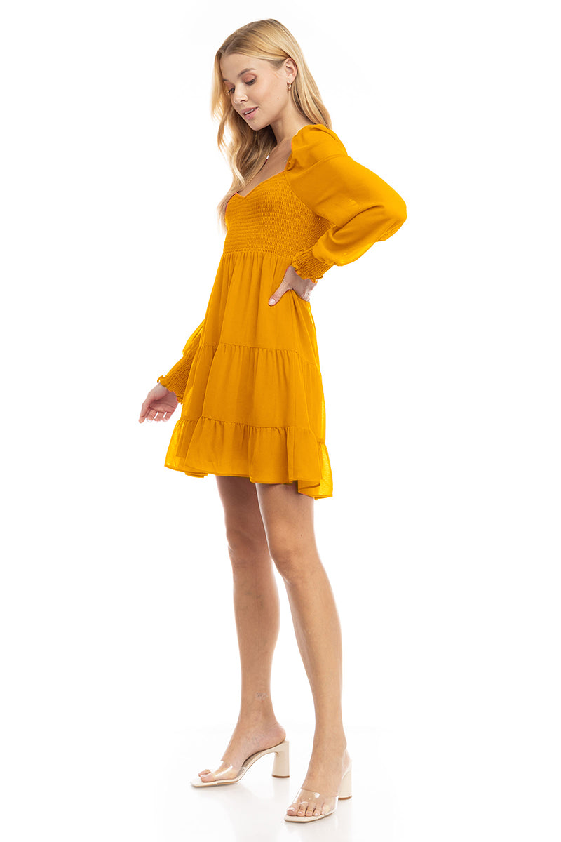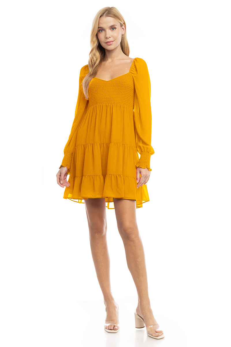 The Long Sheer Sleeve Smocking Tiered Dress combines romantic elegance with modern details. Featuring delicate sheer sleeves, a smocked bodice, and a tiered skirt, this dress offers a flattering and feminine silhouette. Perfect for both casual and formal occasions, it adds a touch of sophistication and grace to any wardrobe.