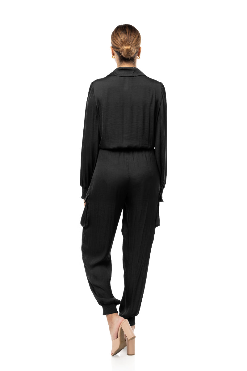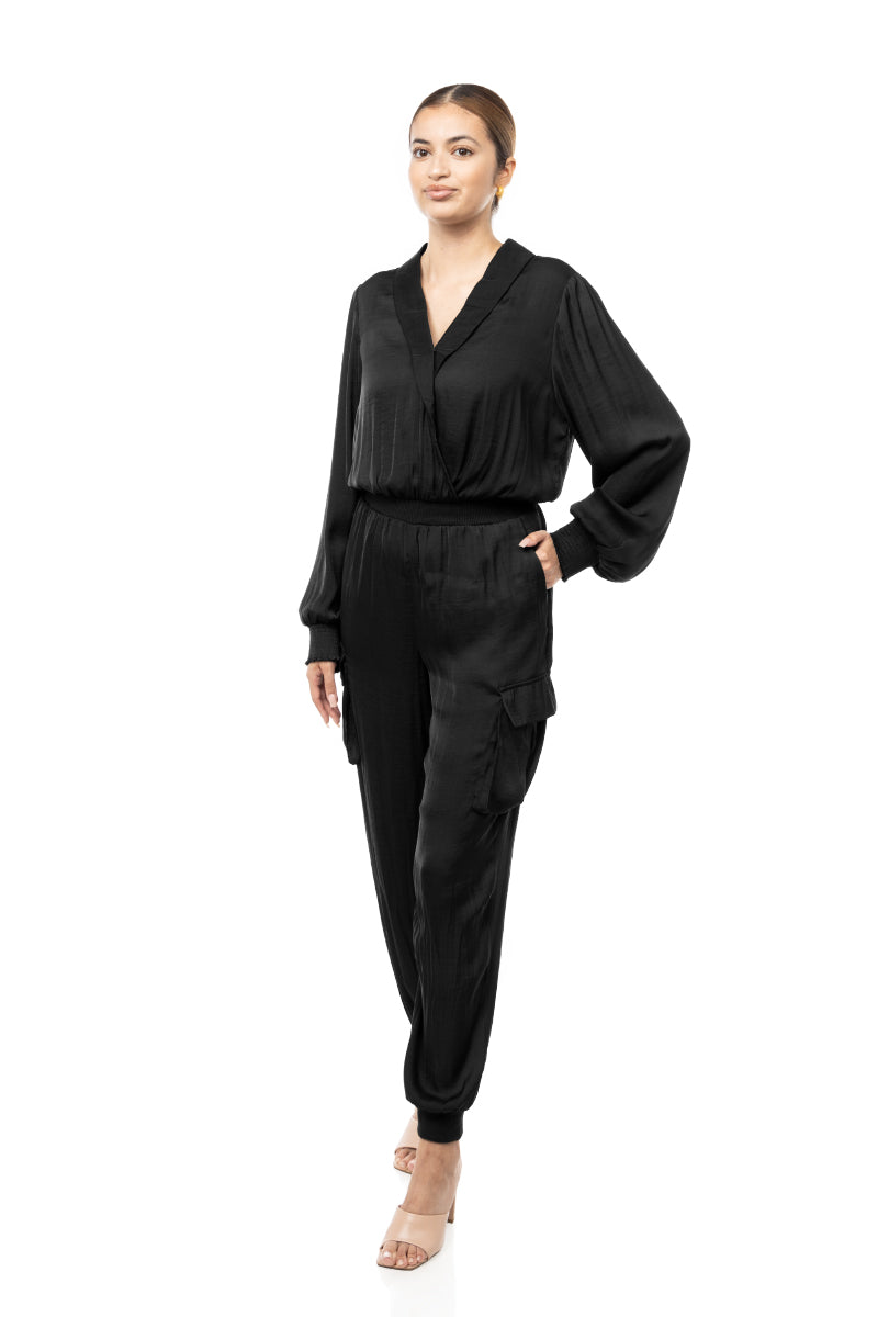 Long Sleeve Collared Surplice Cargo Jumpsuit