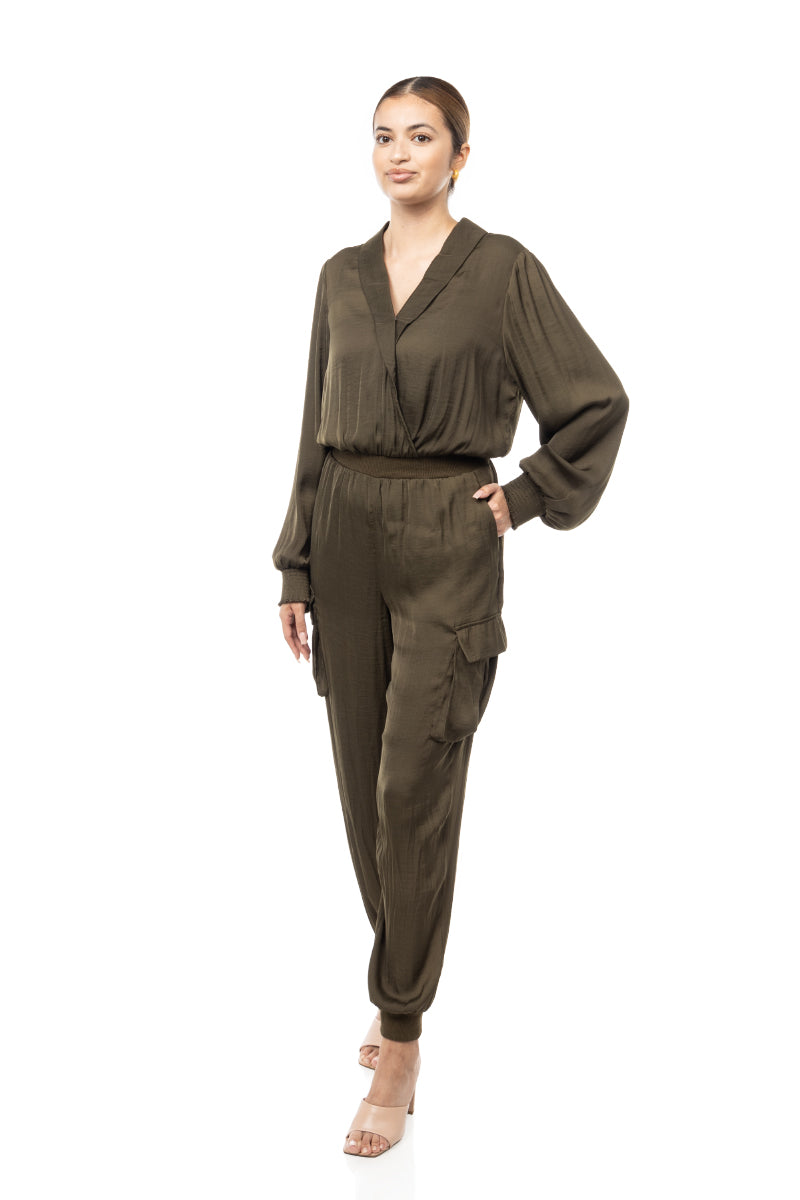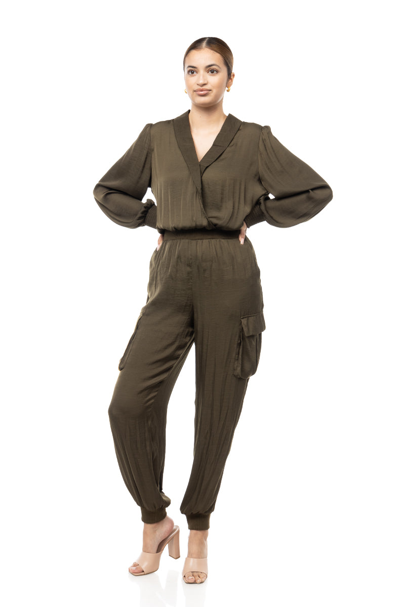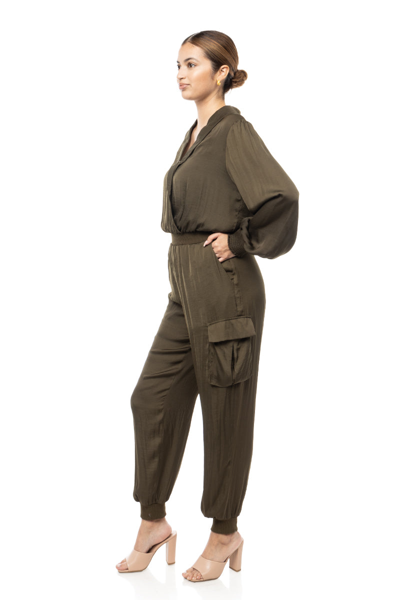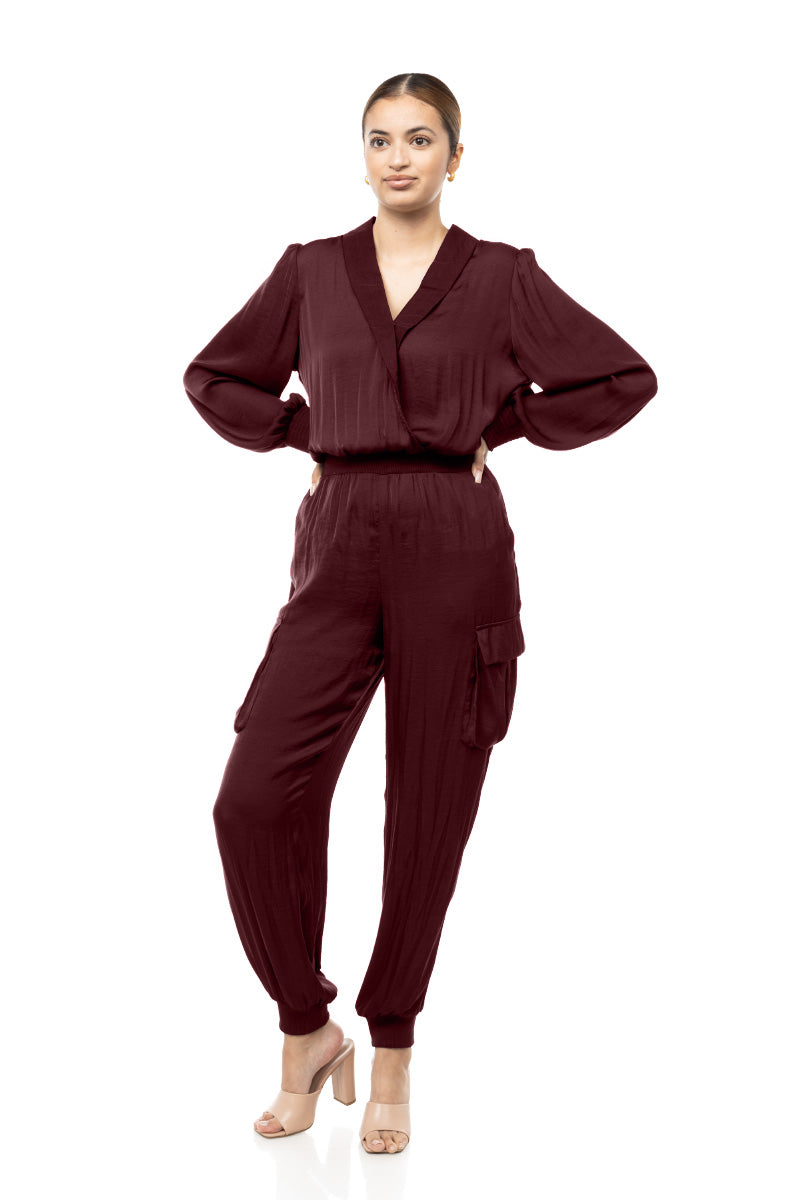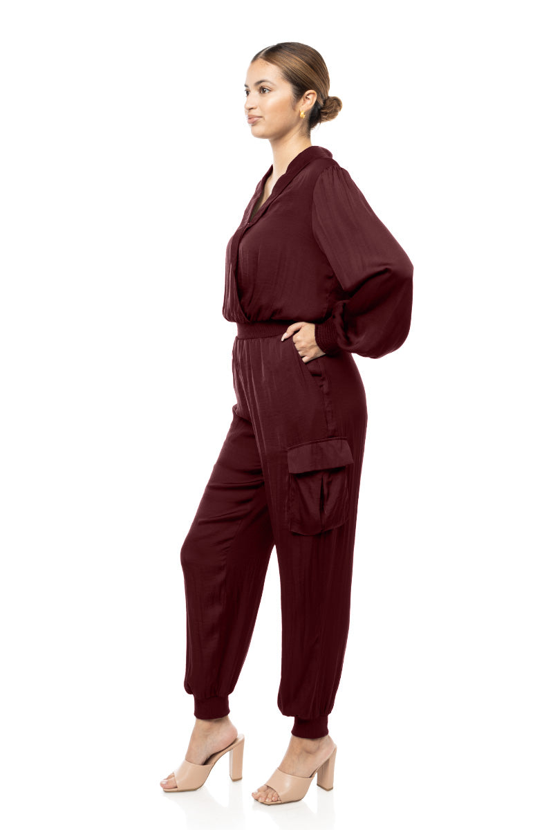 Women's Long Sleeve Collared Surplice Cargo Jumpsuit
