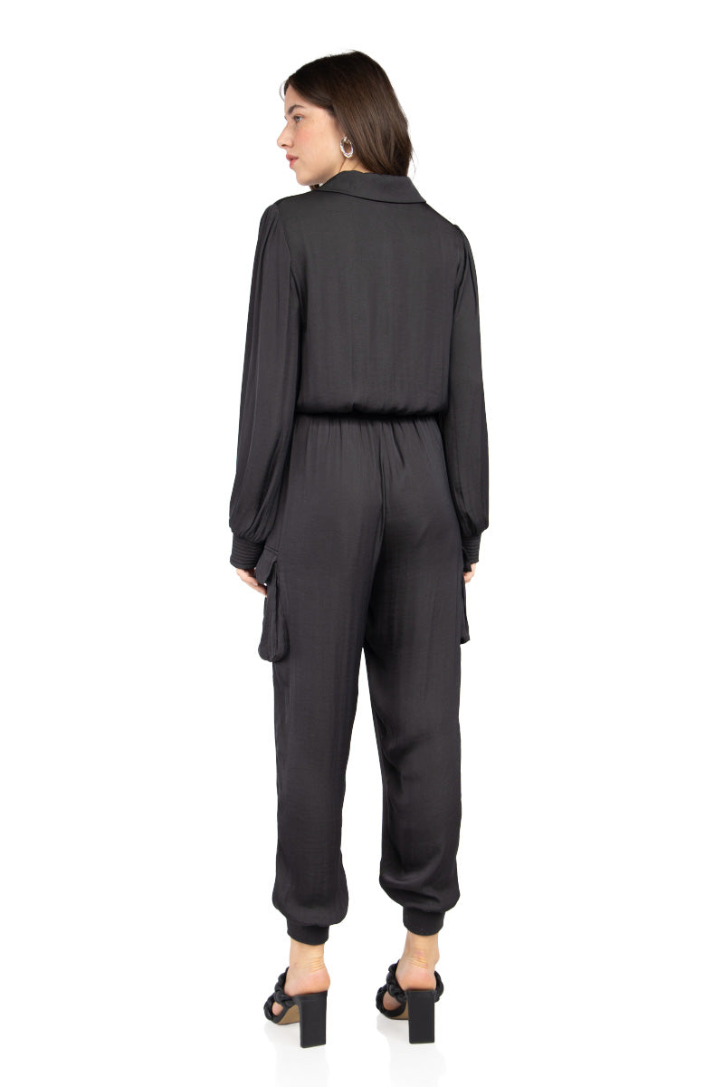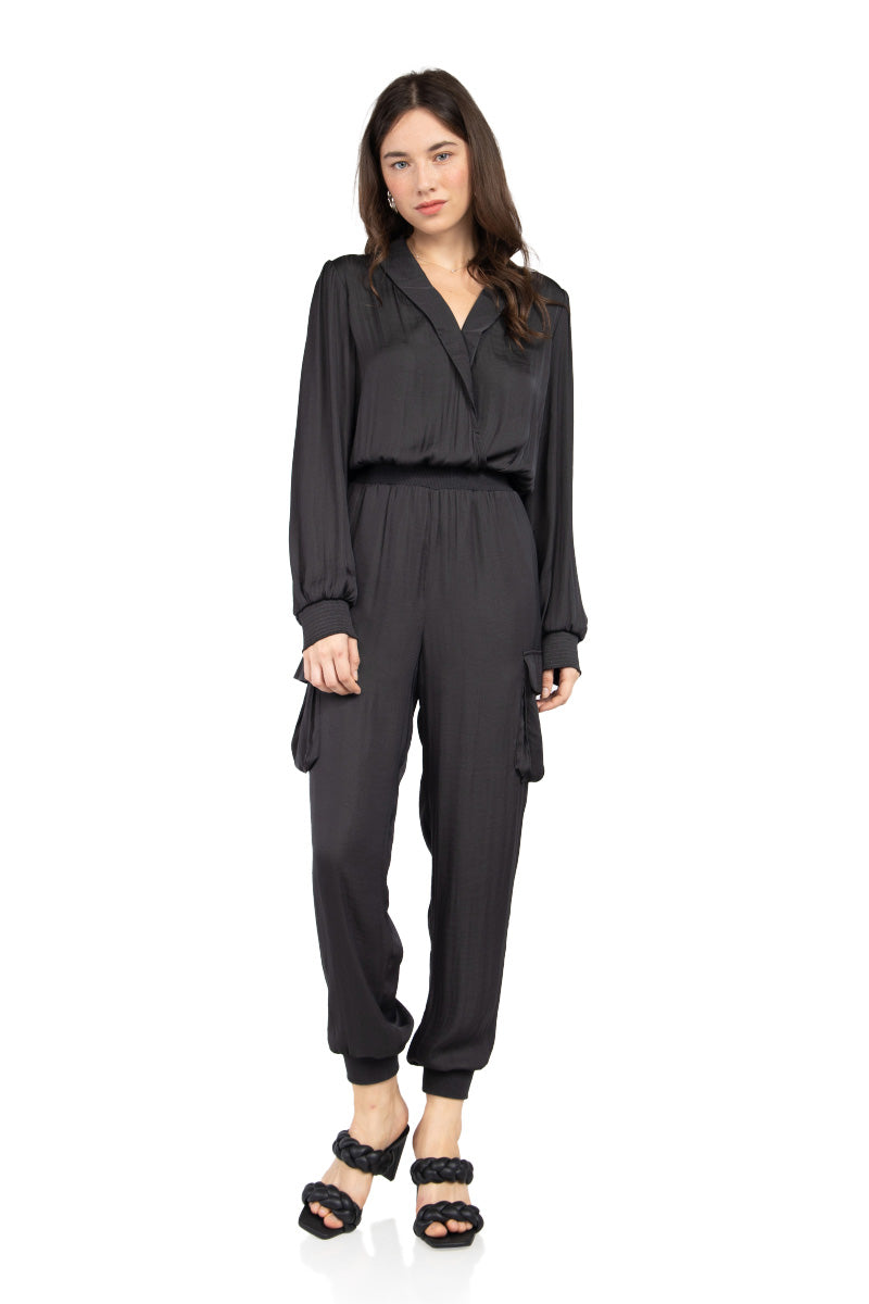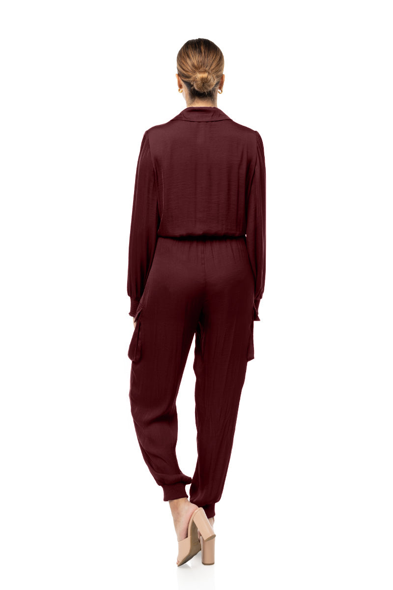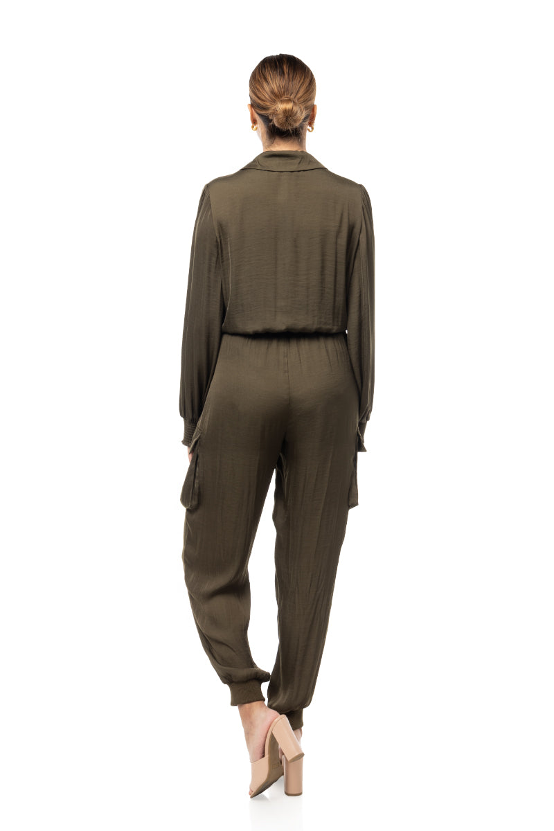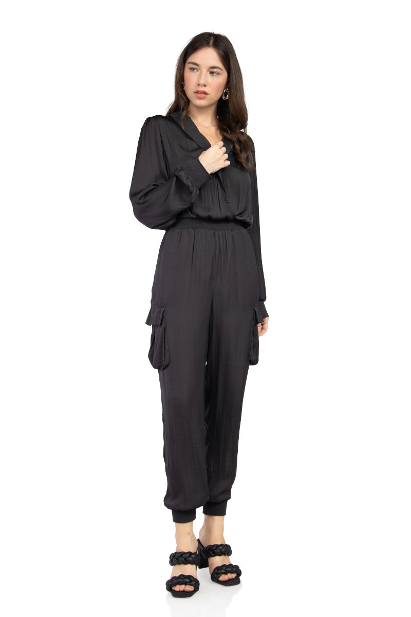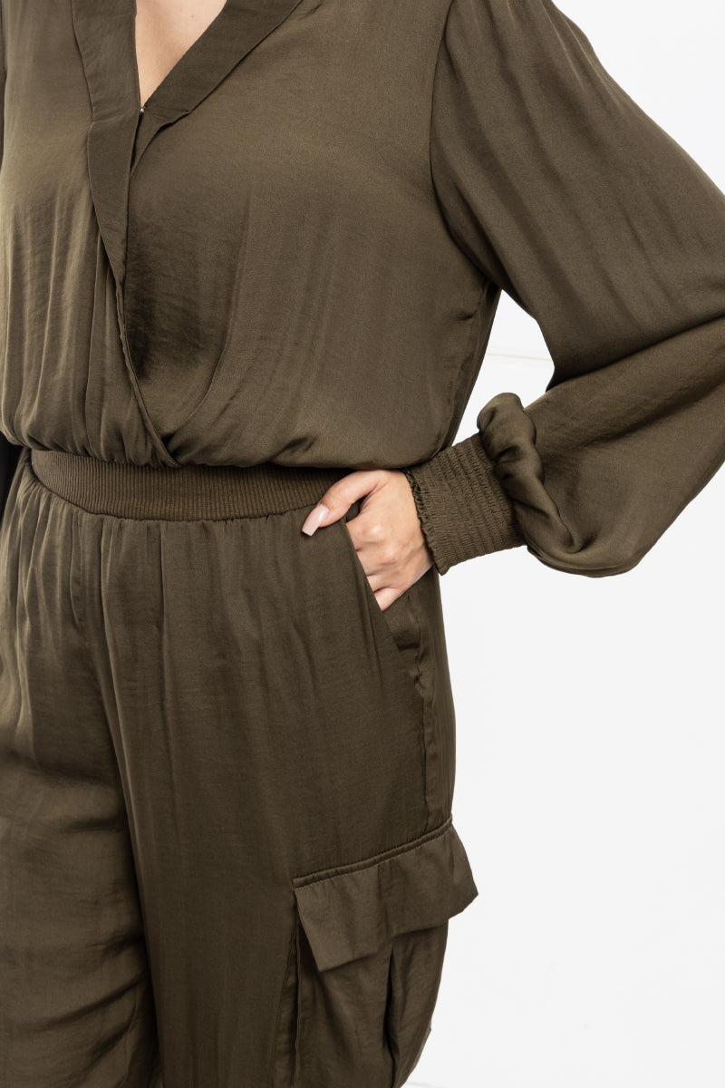 Women's Long Sleeve Collared Surplice Cargo Jumpsuit