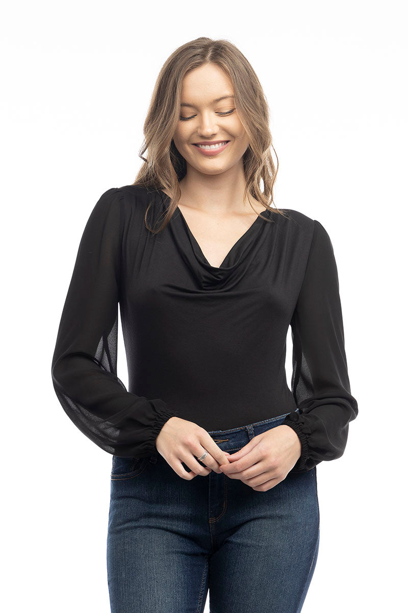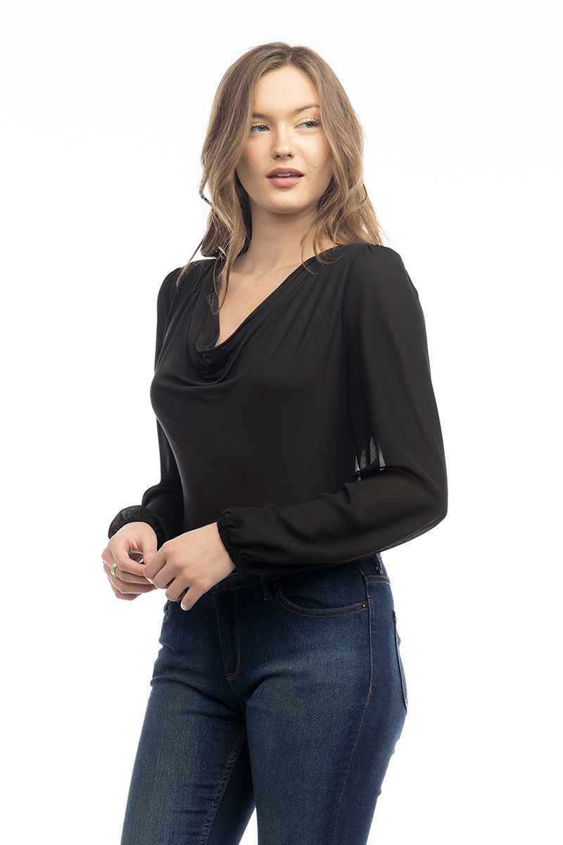 ╴Soft knit fabric with a sophisticated draped neckline and fitted long sleeves.