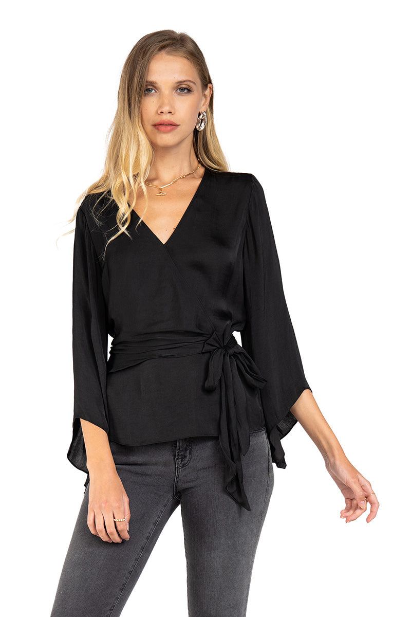 ╴Flowy long sleeves finished with dramatic bell cuffs and a versatile tie neckline.