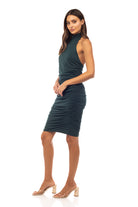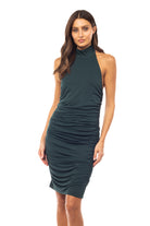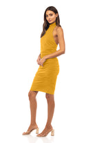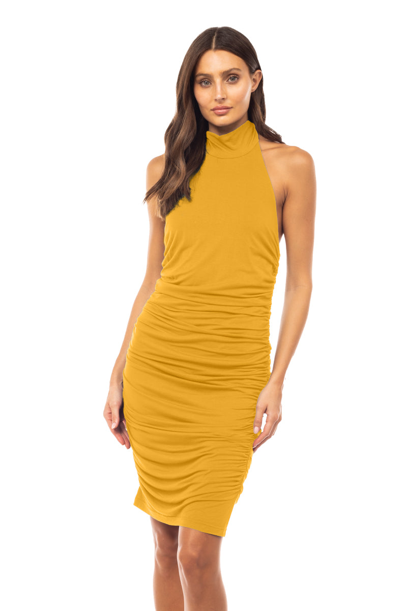The Mock Neck Shirred Knit Bodycon Dress combines elegance with a flattering fit. Featuring a mock neck and shirred detailing, this dress hugs your curves while providing comfort and style. Ideal for evening events or special occasions, it adds a chic and sophisticated touch to your wardrobe.