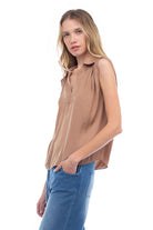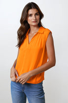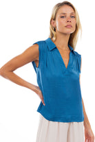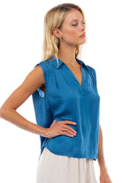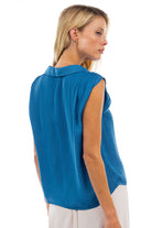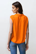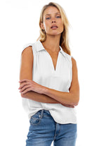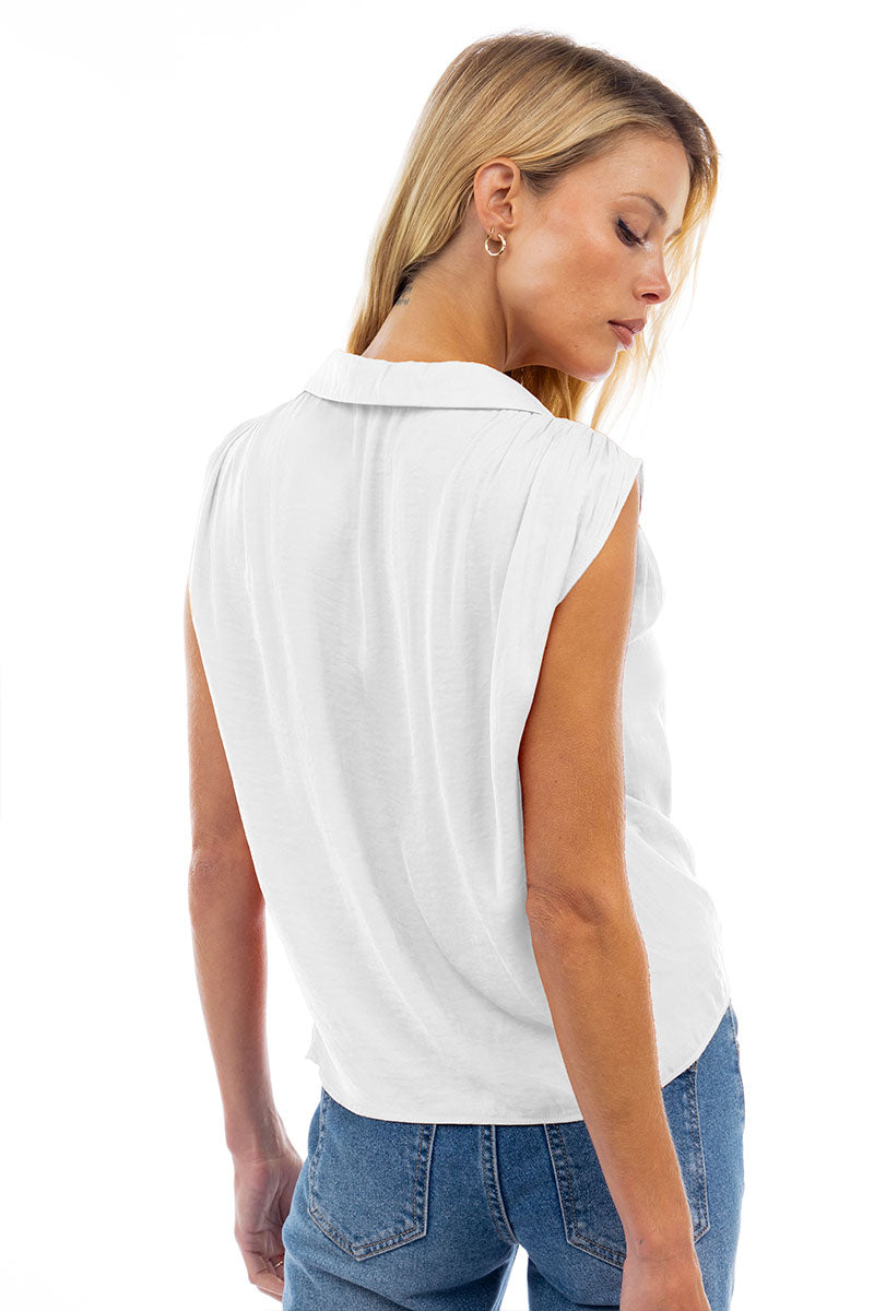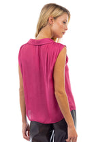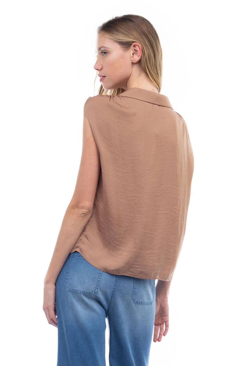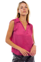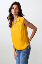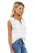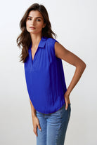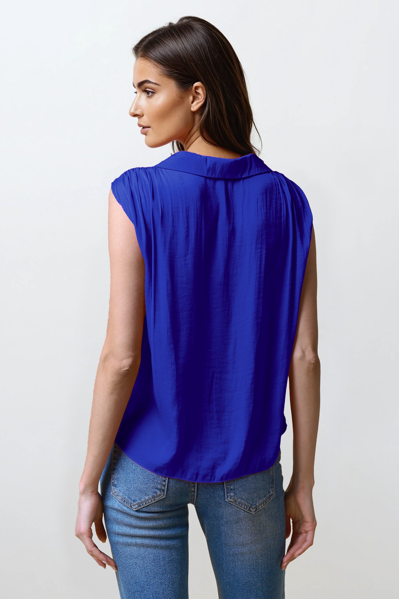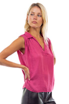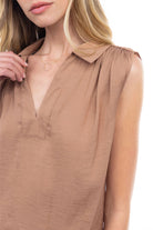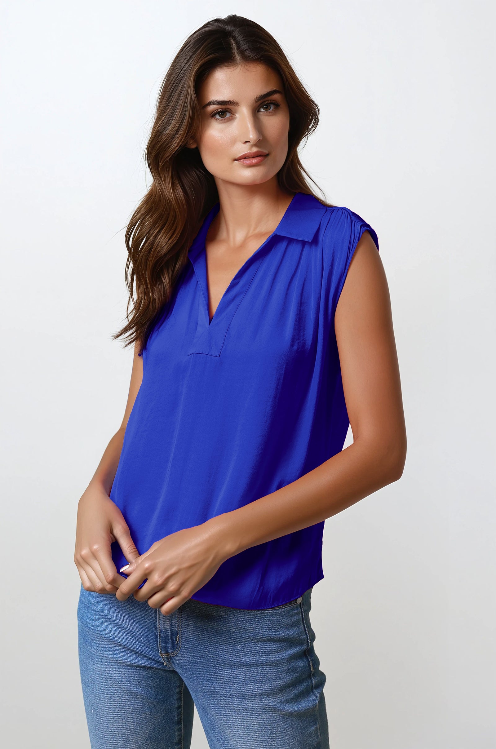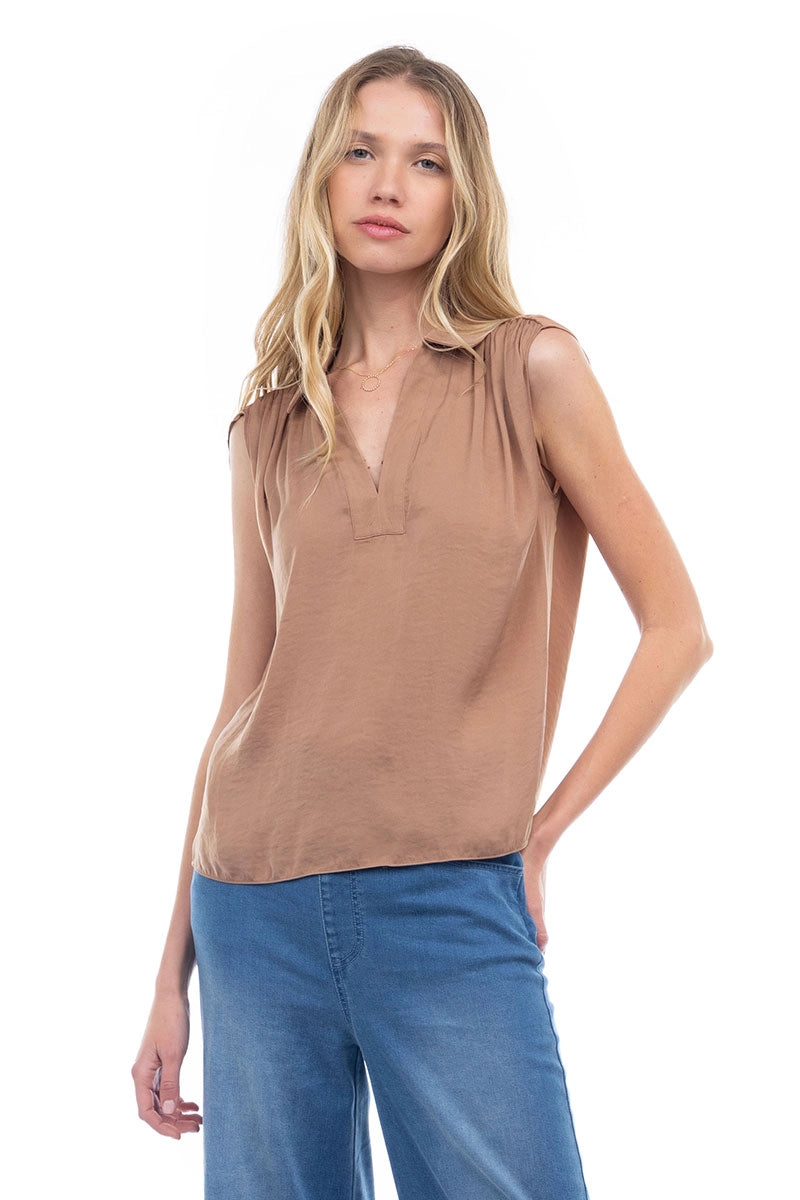 Elevate your ensemble with this sleeveless top featuring a sophisticated V-neck band collar and stylish ruched shoulders. The combination of the V-neck collar and the subtle ruching adds a touch of modern flair, making this top a chic and versatile choice for various occasions.