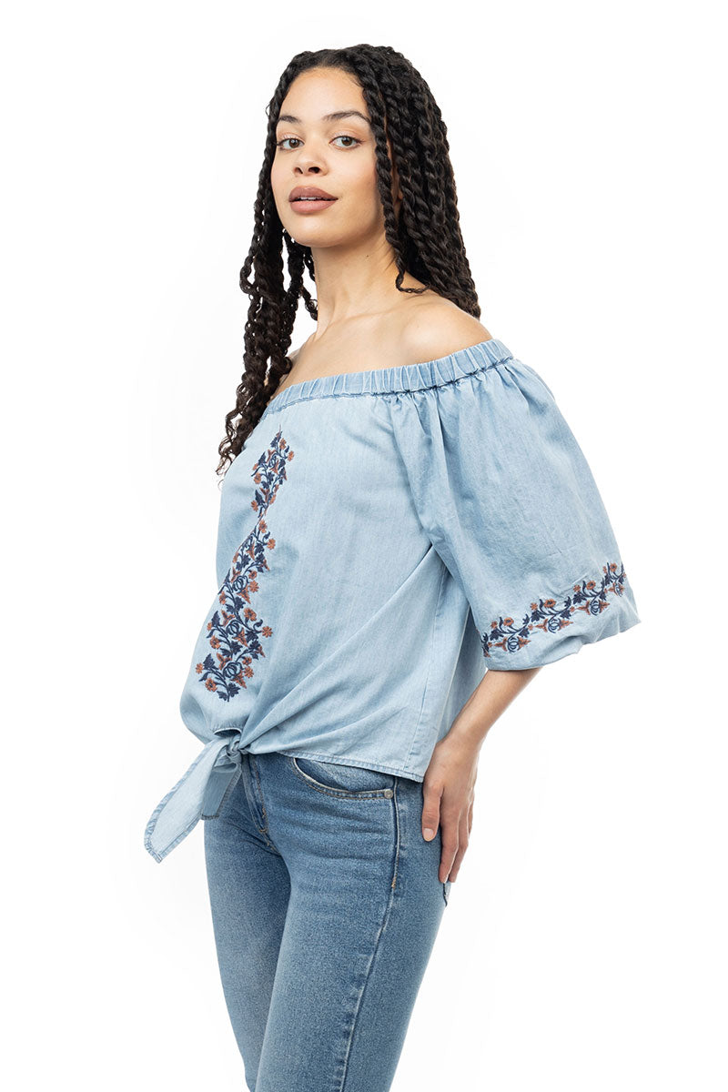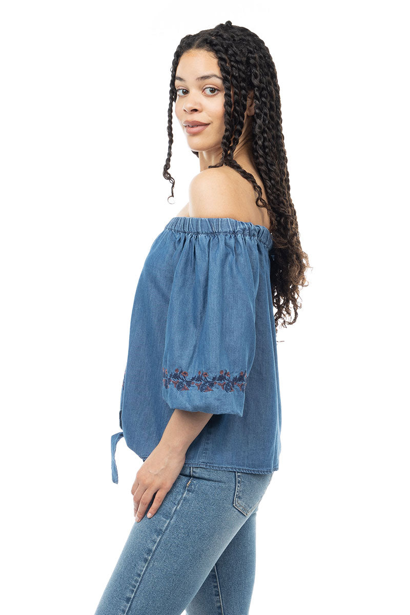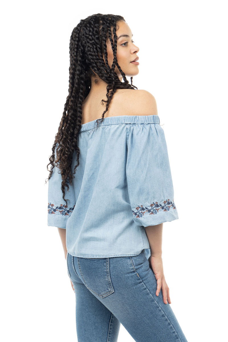 Off Shoulder Bubble Sleeve Embroidered Blouse