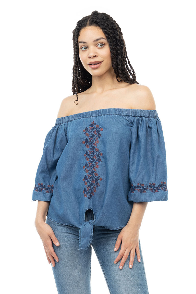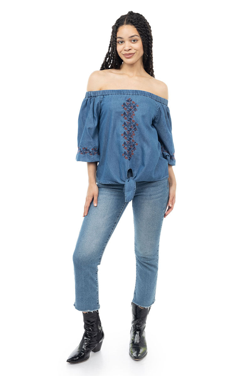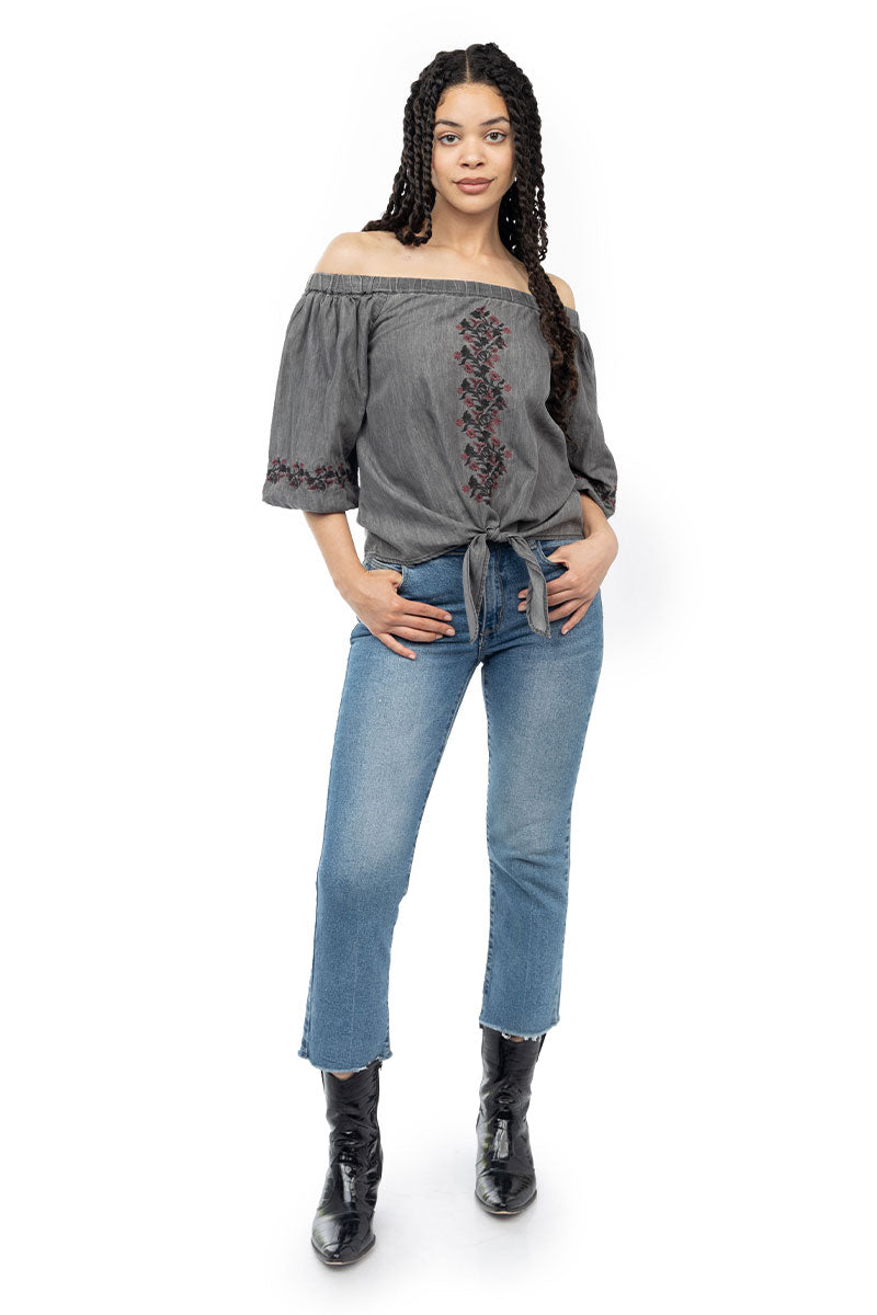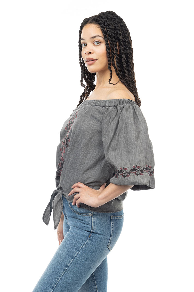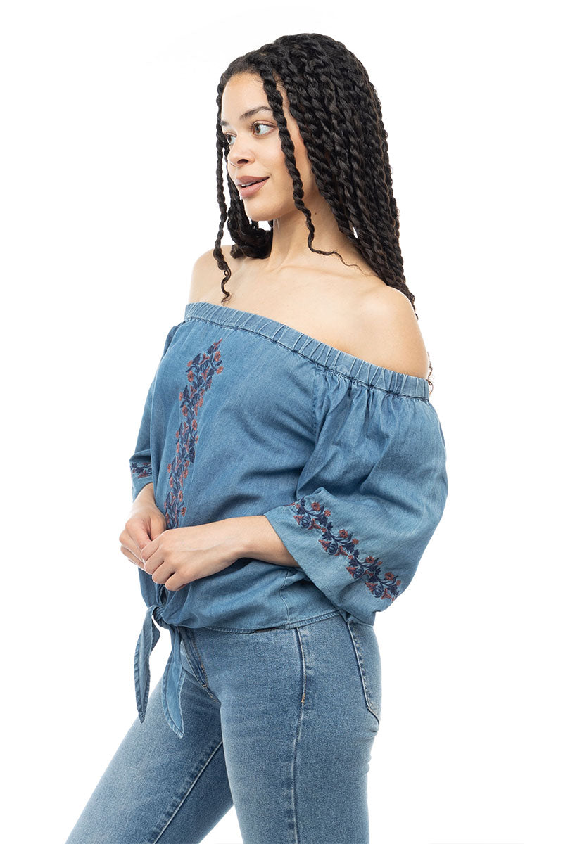 Upgrade your wardrobe with our stylish Off Shoulder Bubble Sleeve Embroidered Blouse. This elegant design features a trendy off shoulder neckline and delicate embroidered details, perfect for a chic and sophisticated look. Be ready to impress with this must-have piece.