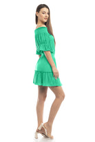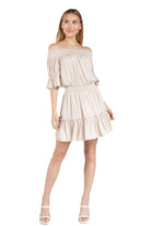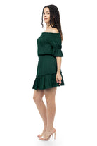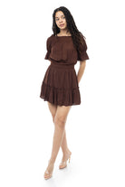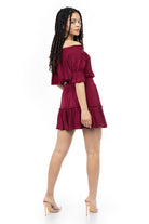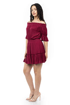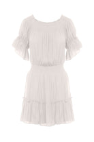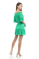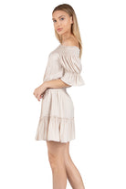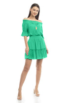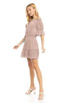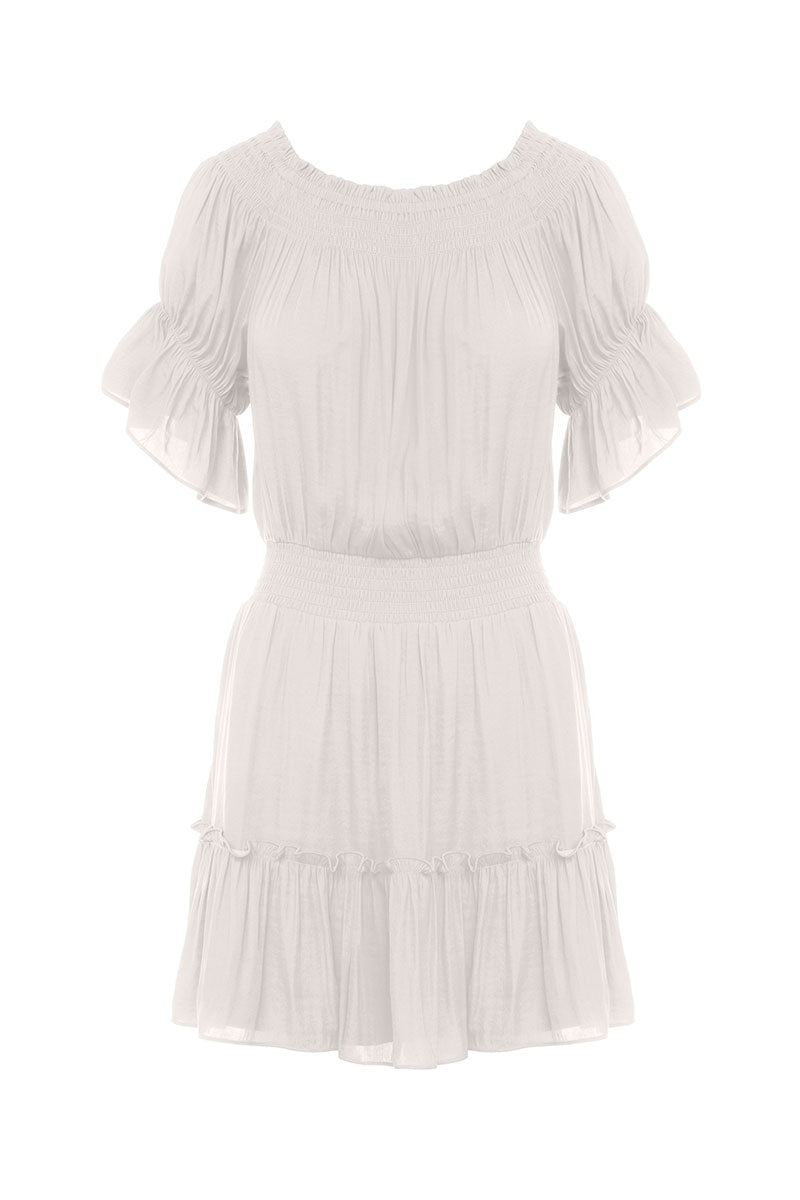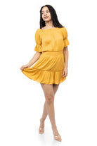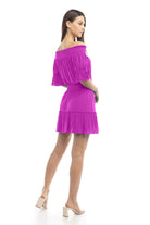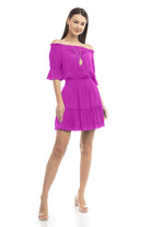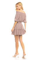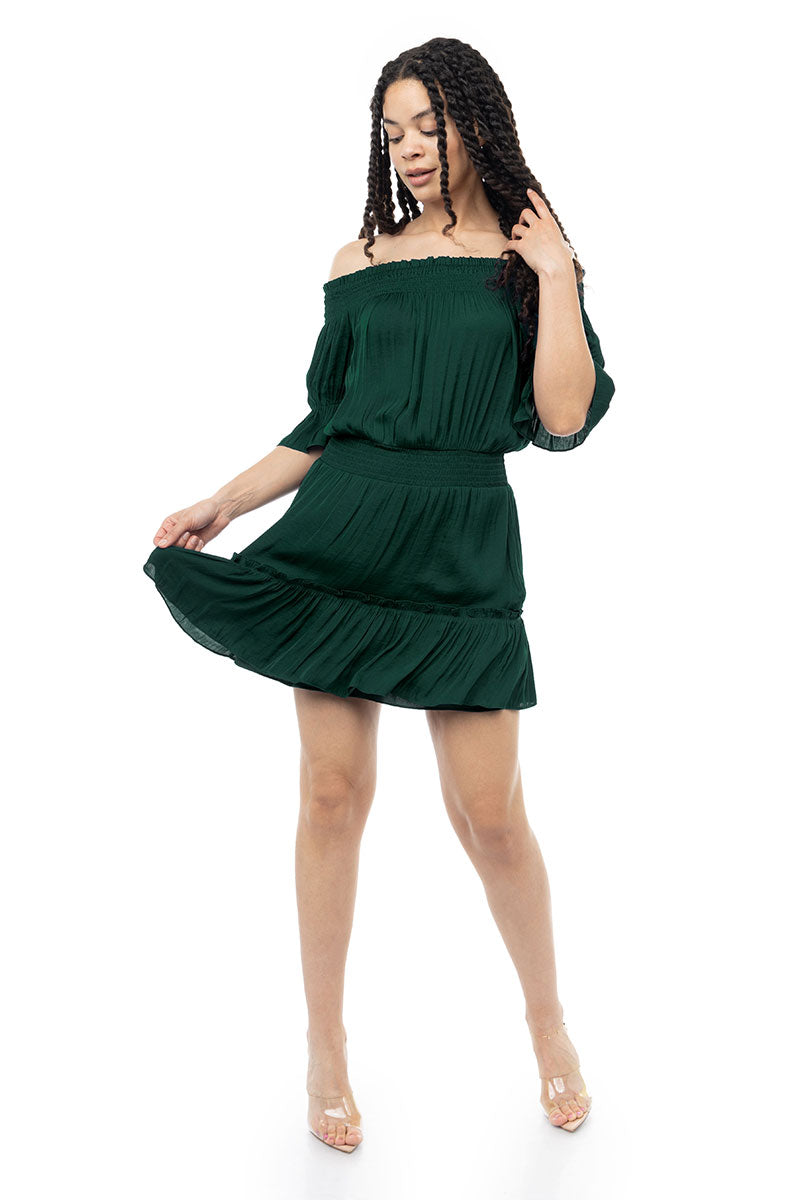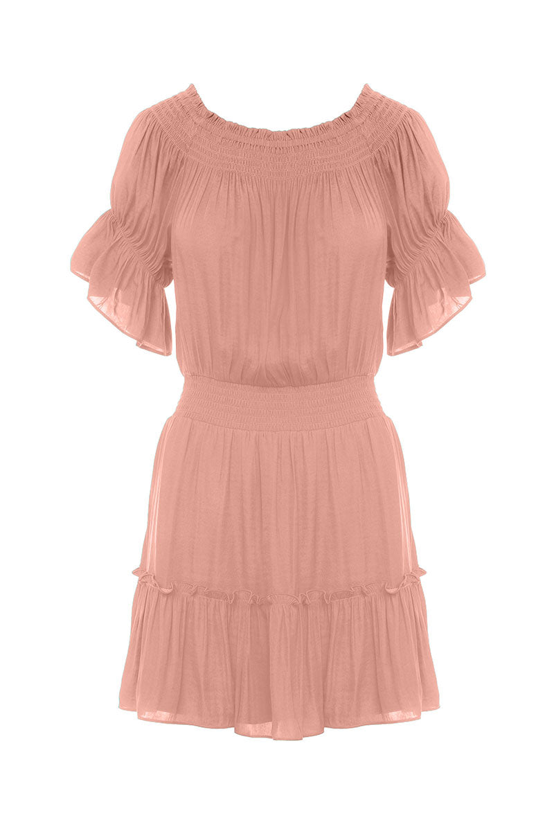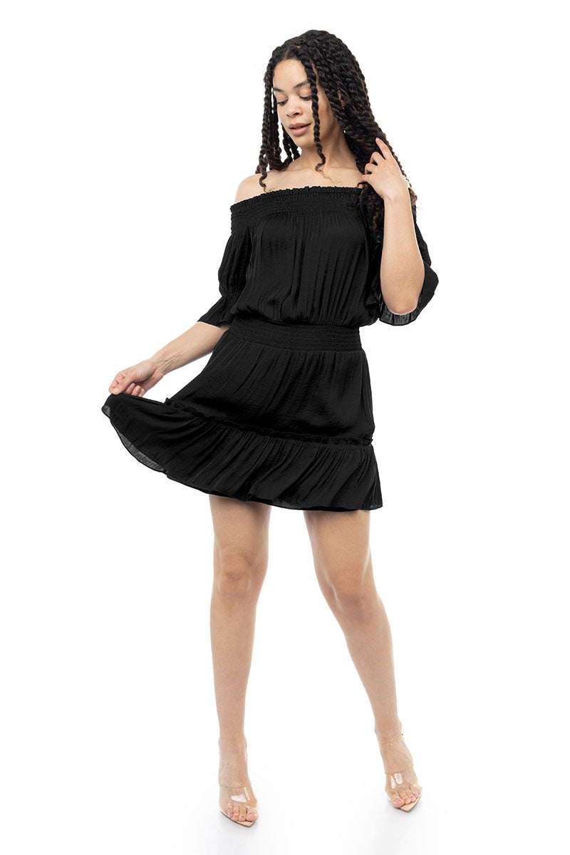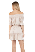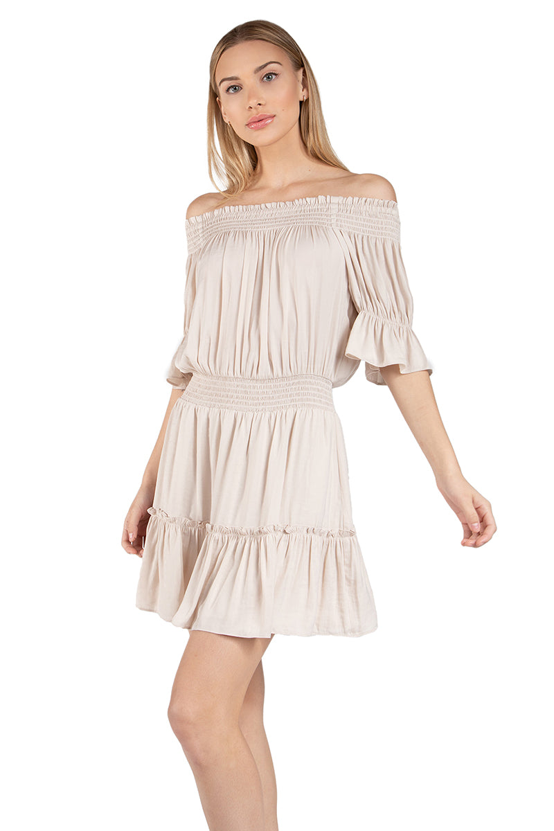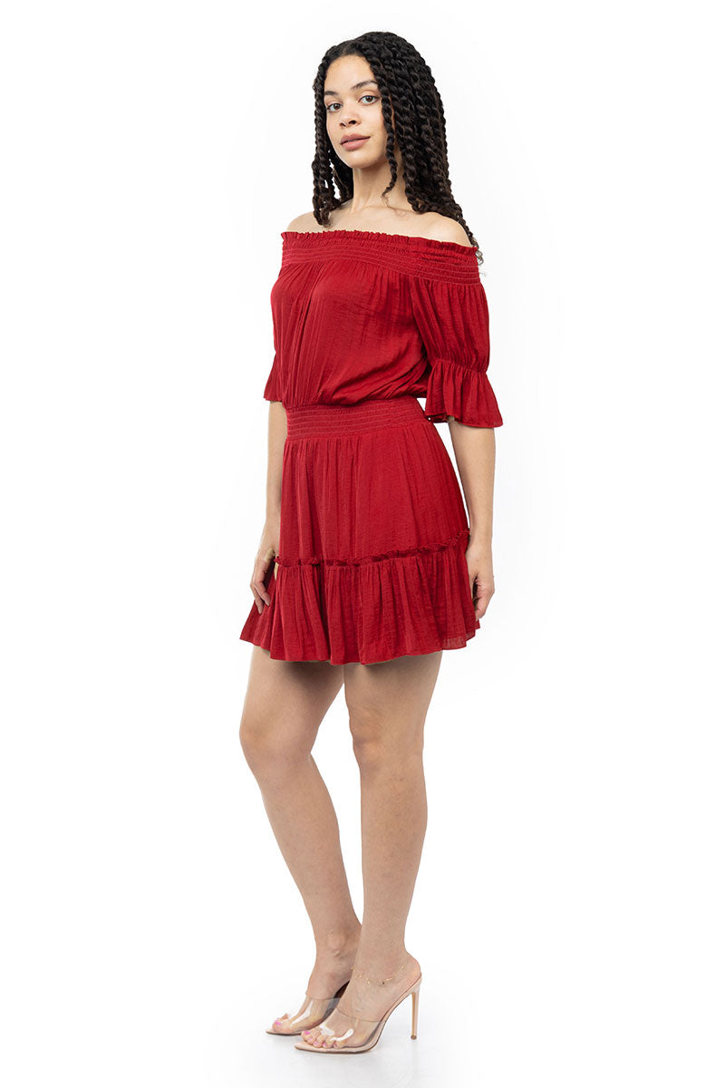 Expertly crafted with an off shoulder design and smocked detailing, this mini dress is a must-have for any fashion-forward wardrobe. The off shoulder style adds a touch of femininity, while the smocked detailing provides a flattering and comfortable fit. Perfect for any occasion, this dress is sure to make a statement.