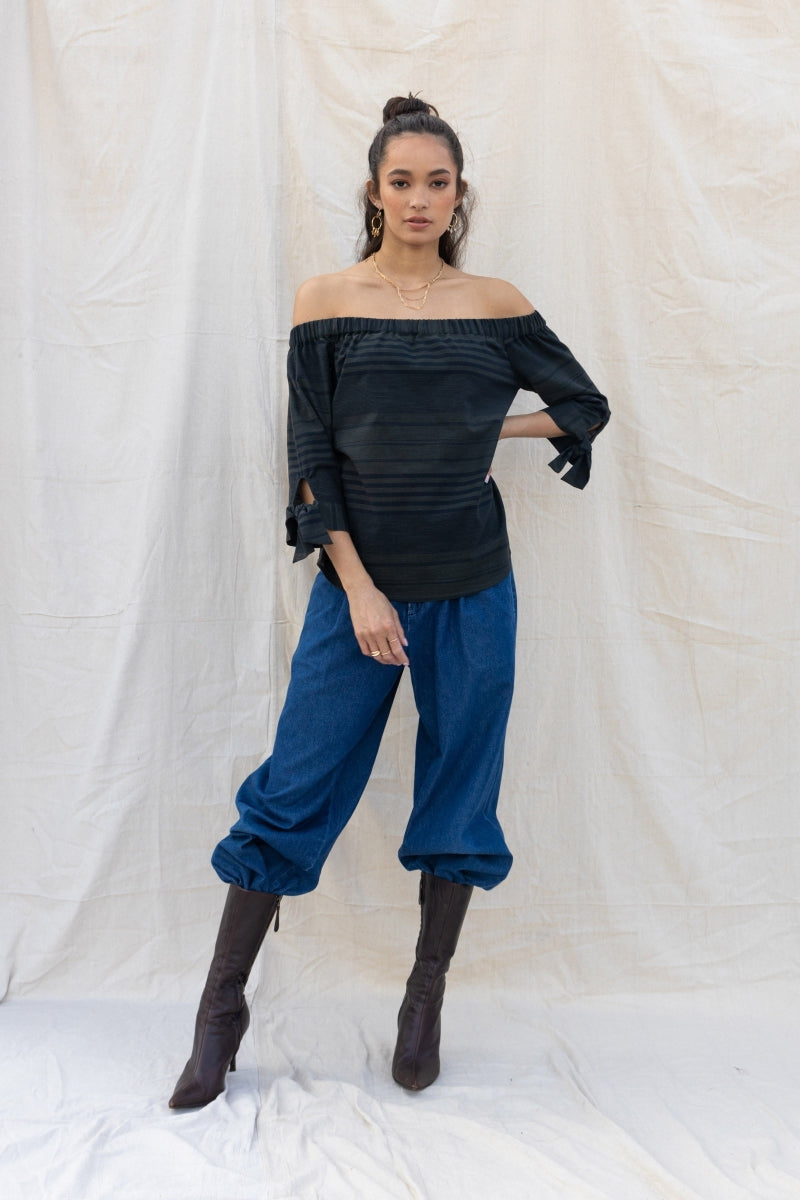 ╴Features an off-shoulder neckline with adjustable tie sleeves for a customizable, flirty fit.