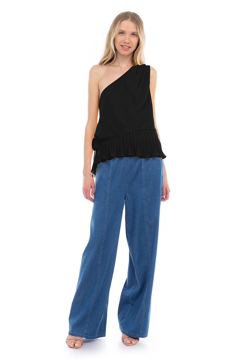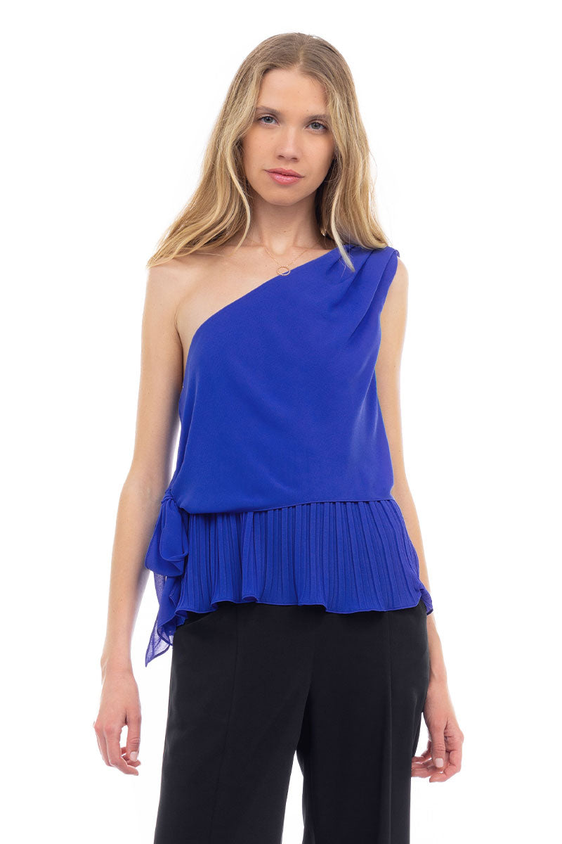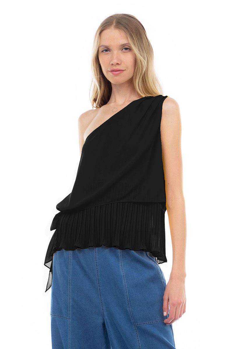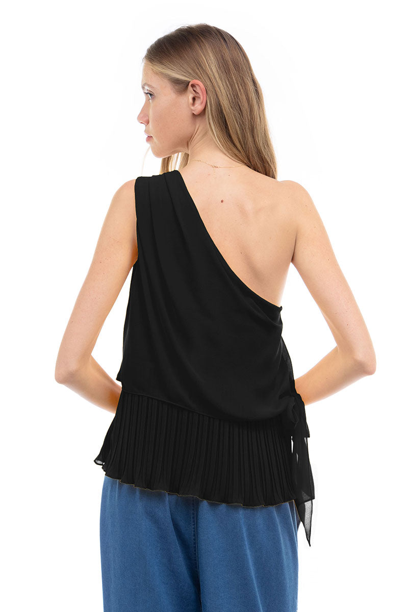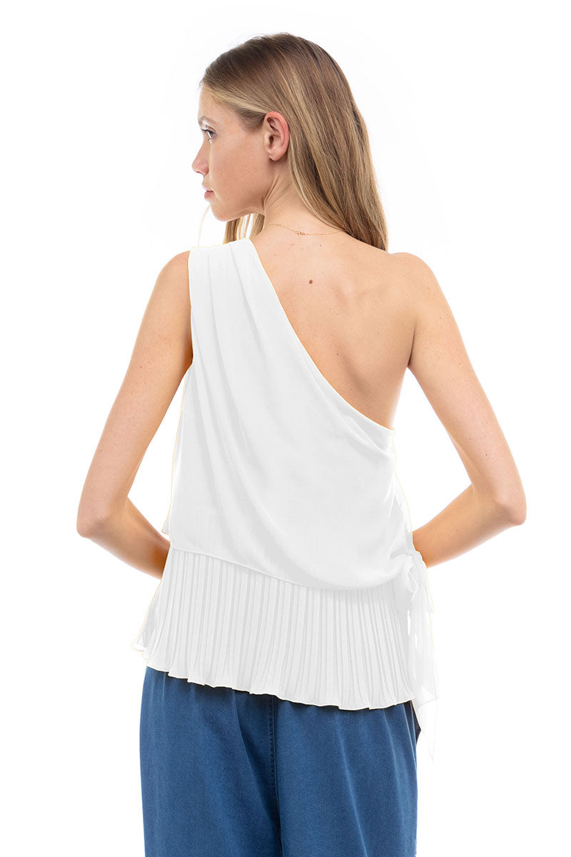 Indulge in elegant asymmetry with this one-shoulder top featuring a charming side tie on the waist and a pleated, flowy bottom. The combination of the one-shoulder design and thoughtful details creates a stylish and graceful silhouette, making this top a versatile and chic choice for various occasions.