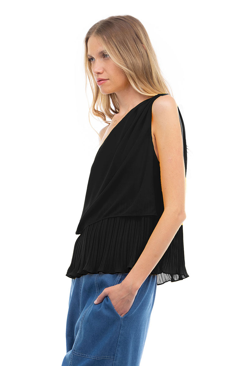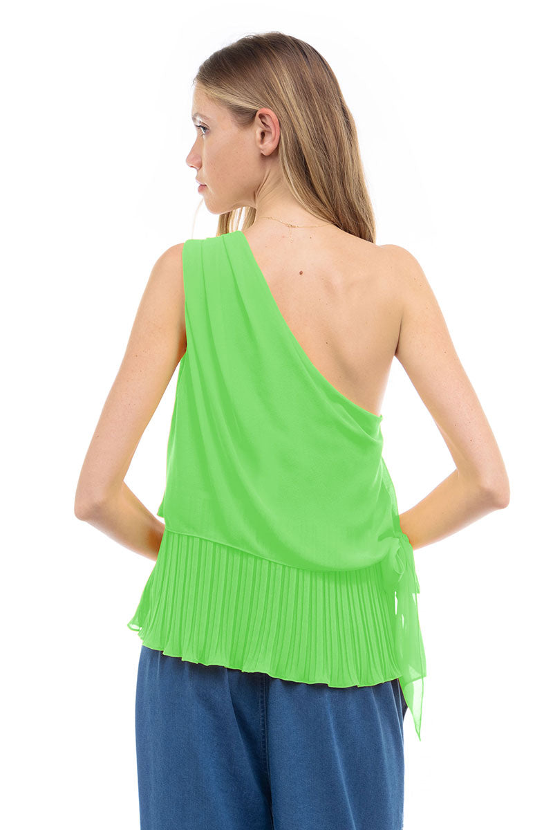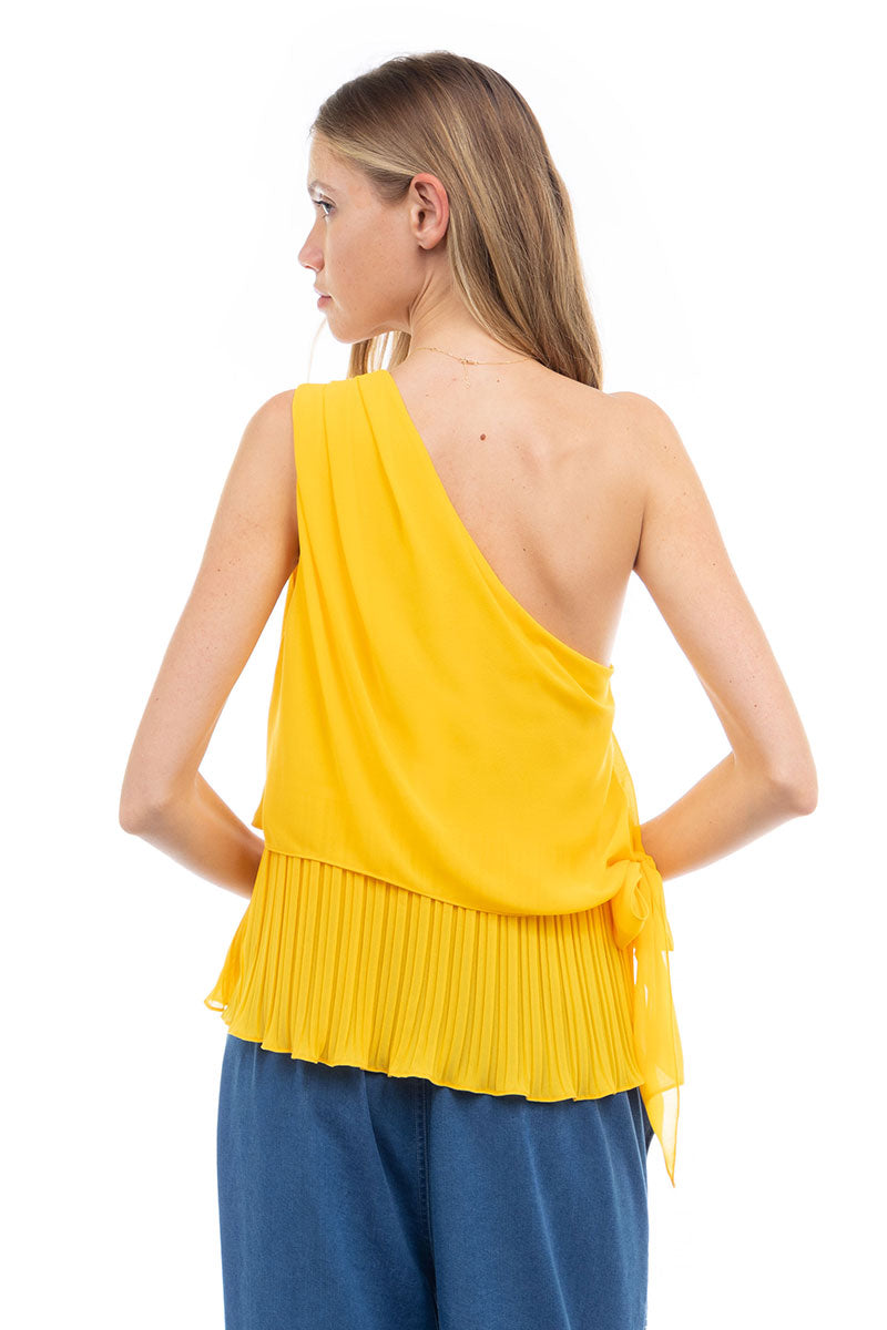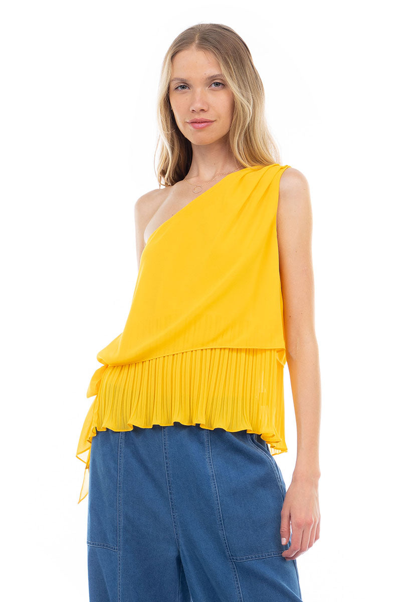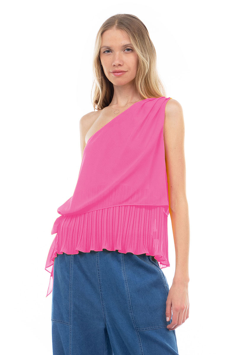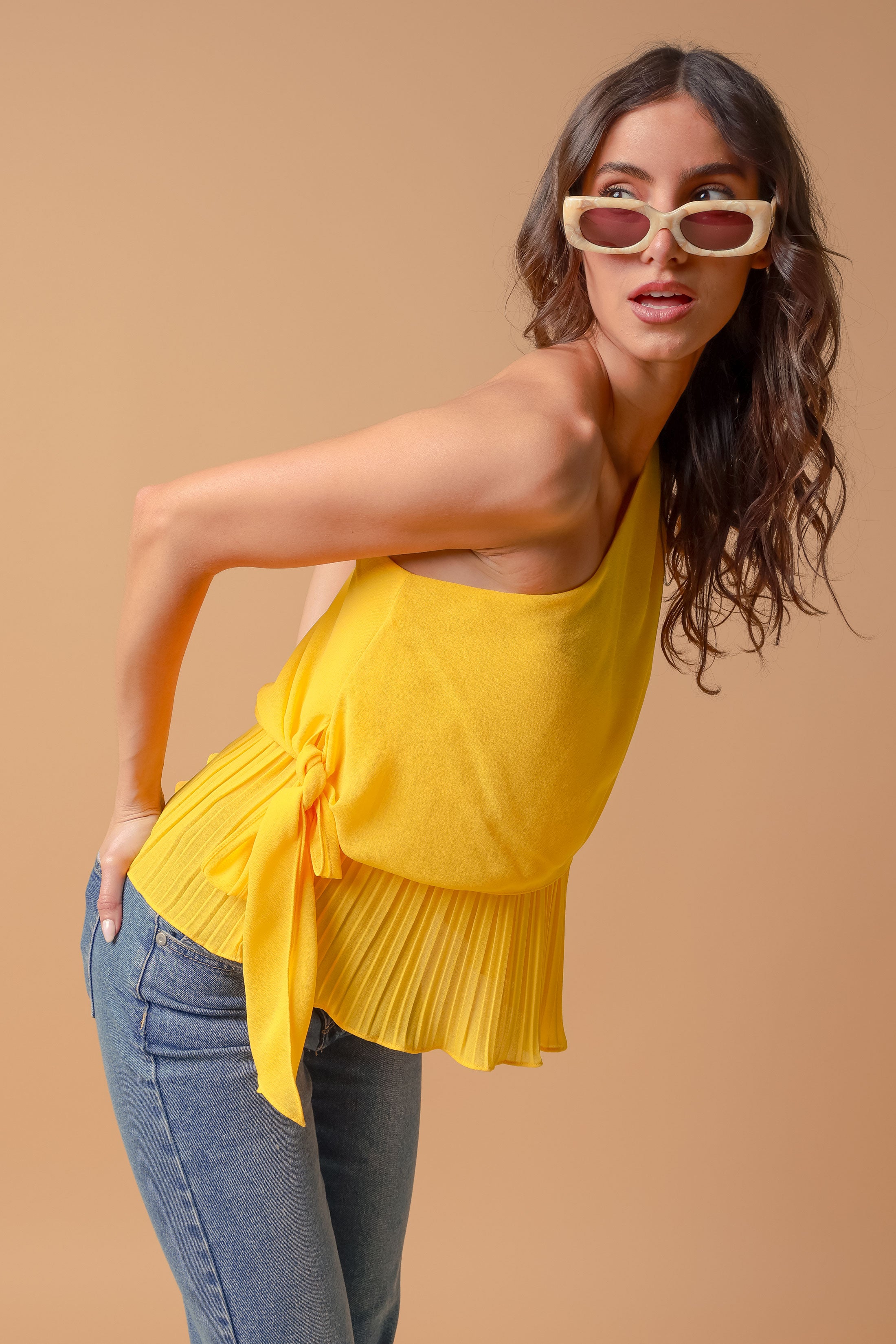 Indulge in elegant asymmetry with this one-shoulder top featuring a charming side tie on the waist and a pleated, flowy bottom. The combination of the one-shoulder design and thoughtful details creates a stylish and graceful silhouette, making this top a versatile and chic choice for various occasions.