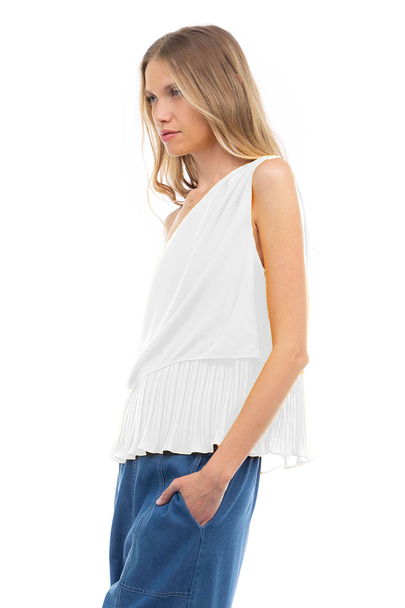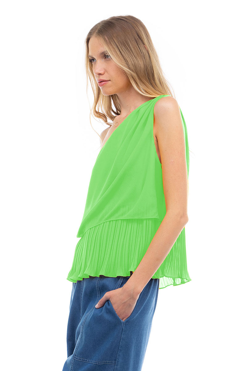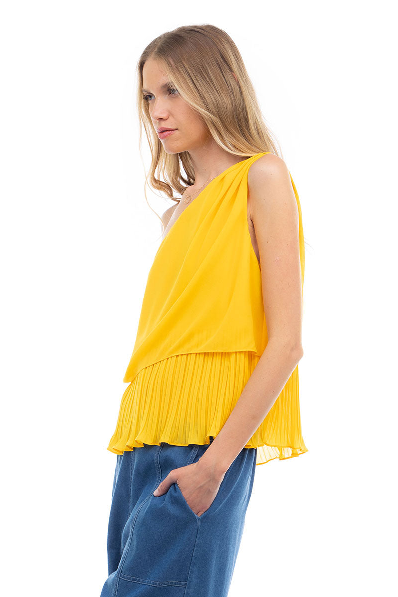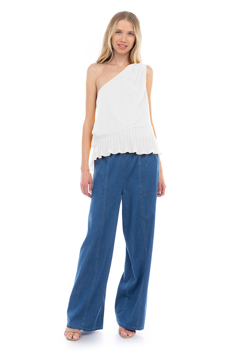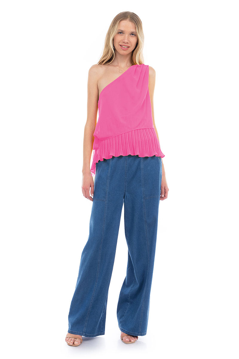 Indulge in elegant asymmetry with this one-shoulder top featuring a charming side tie on the waist and a pleated, flowy bottom. The combination of the one-shoulder design and thoughtful details creates a stylish and graceful silhouette, making this top a versatile and chic choice for various occasions.