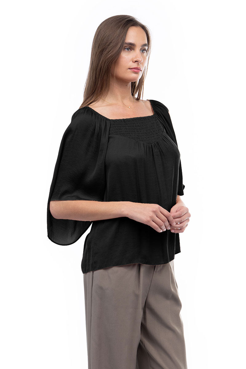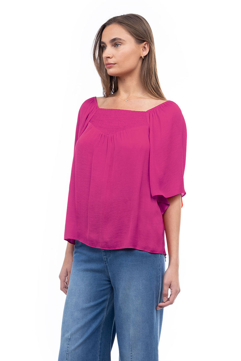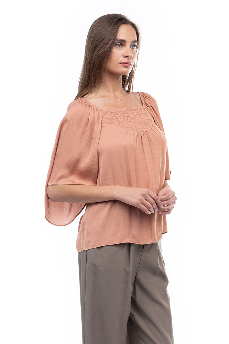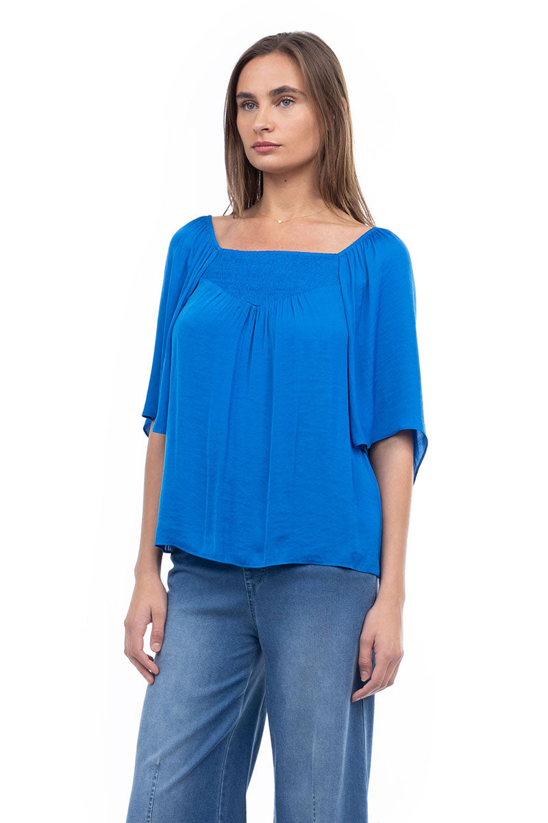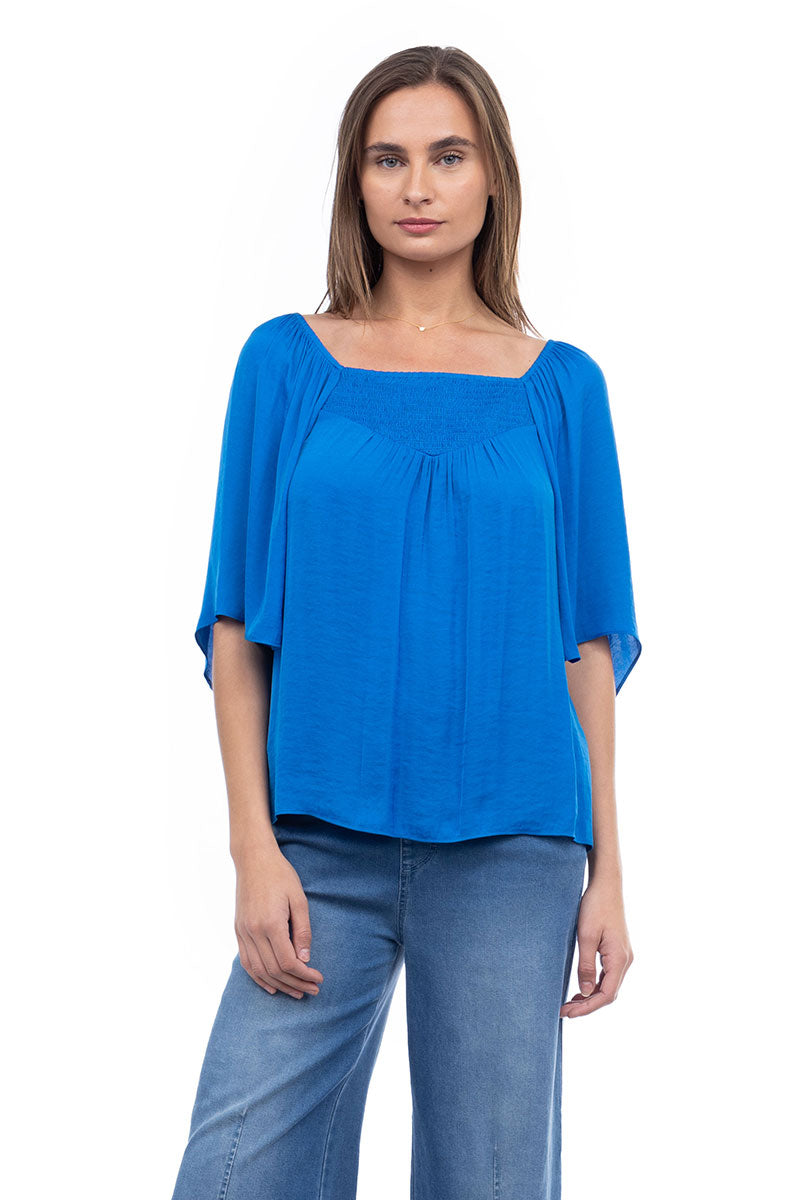 The front smocking adds a touch of texture and charm, while the sleeves hitting right at the elbow create a flattering silhouette. Perfect for a bohemian-inspired and comfortable look, this blouse effortlessly combines style and ease, making it an ideal choice for various occasions.