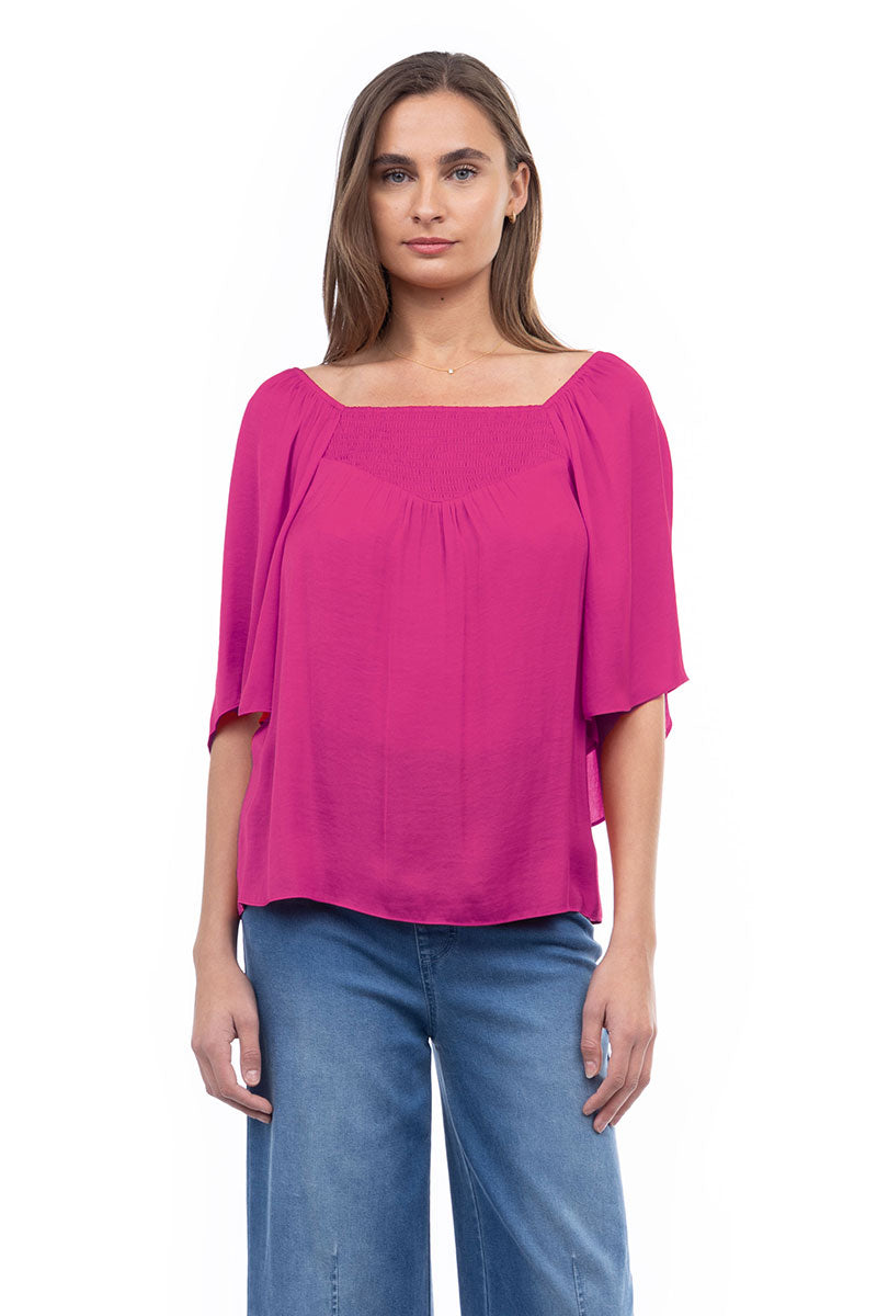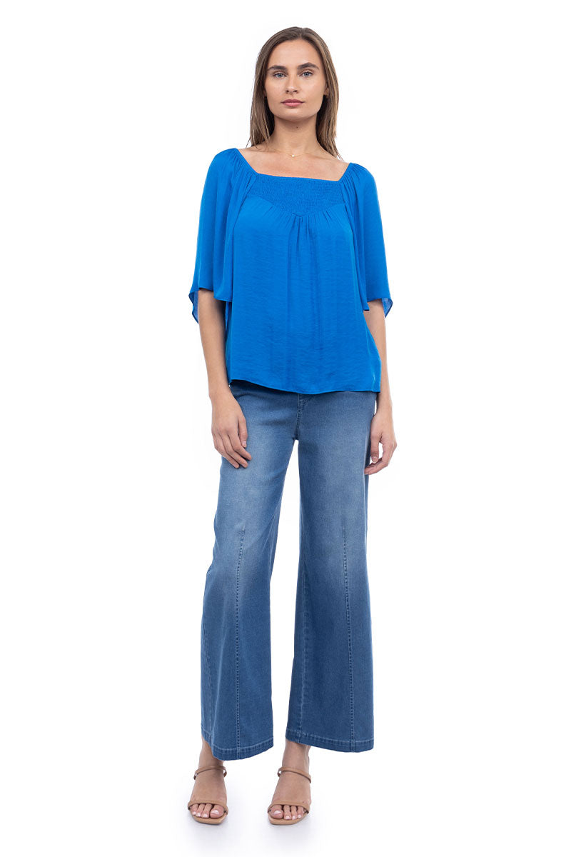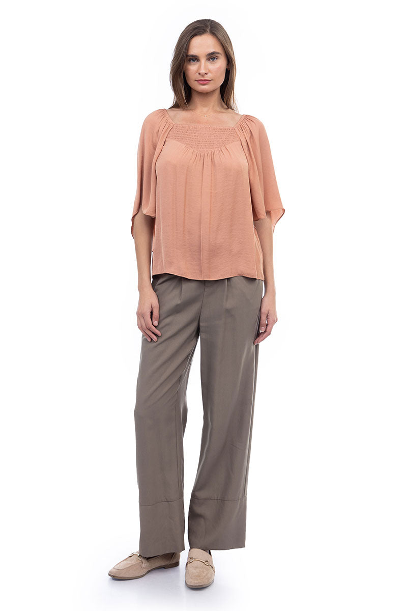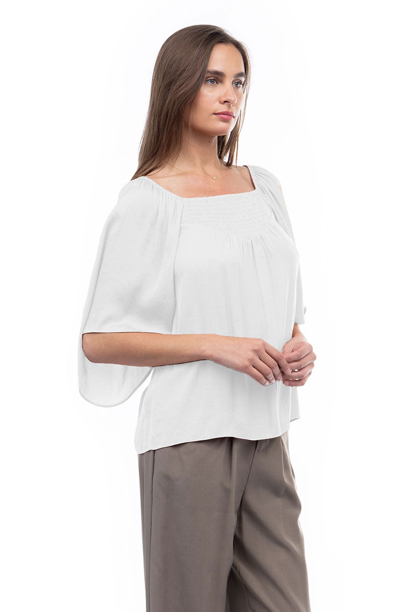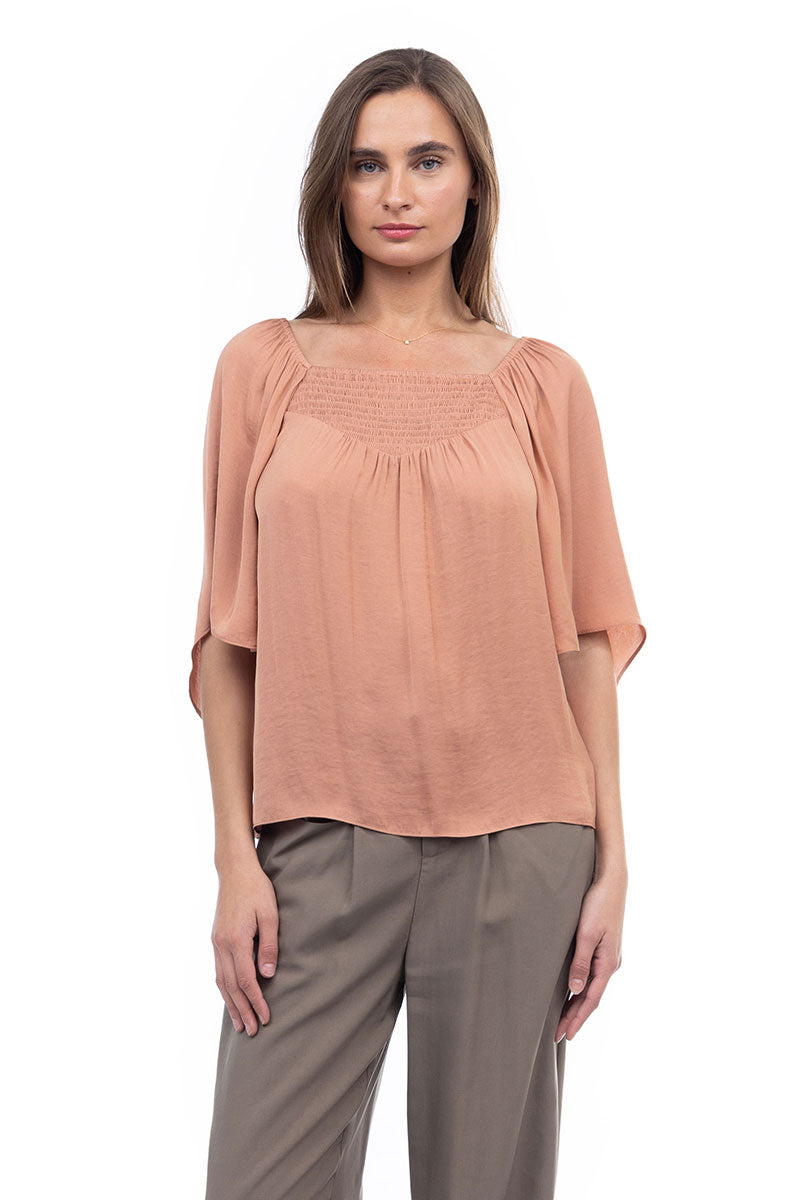 The front smocking adds a touch of texture and charm, while the sleeves hitting right at the elbow create a flattering silhouette. Perfect for a bohemian-inspired and comfortable look, this blouse effortlessly combines style and ease, making it an ideal choice for various occasions.