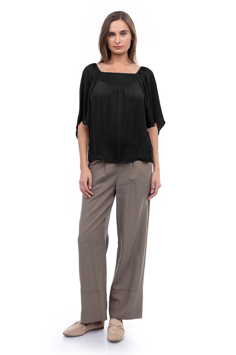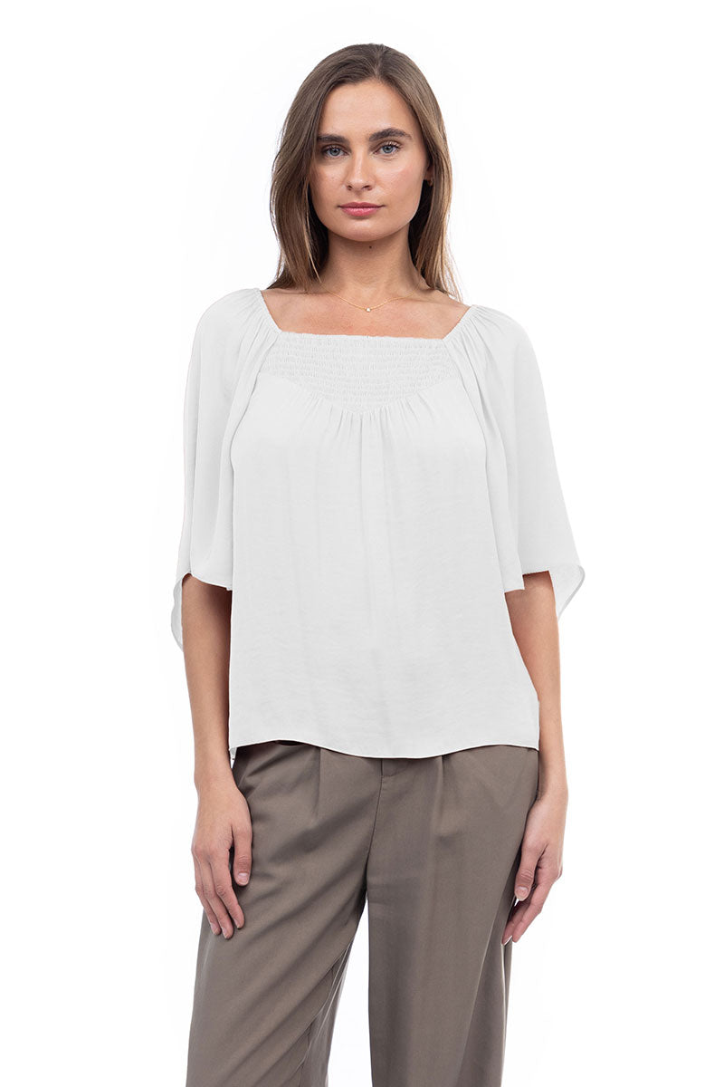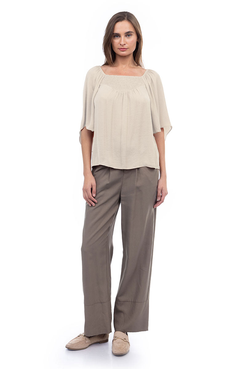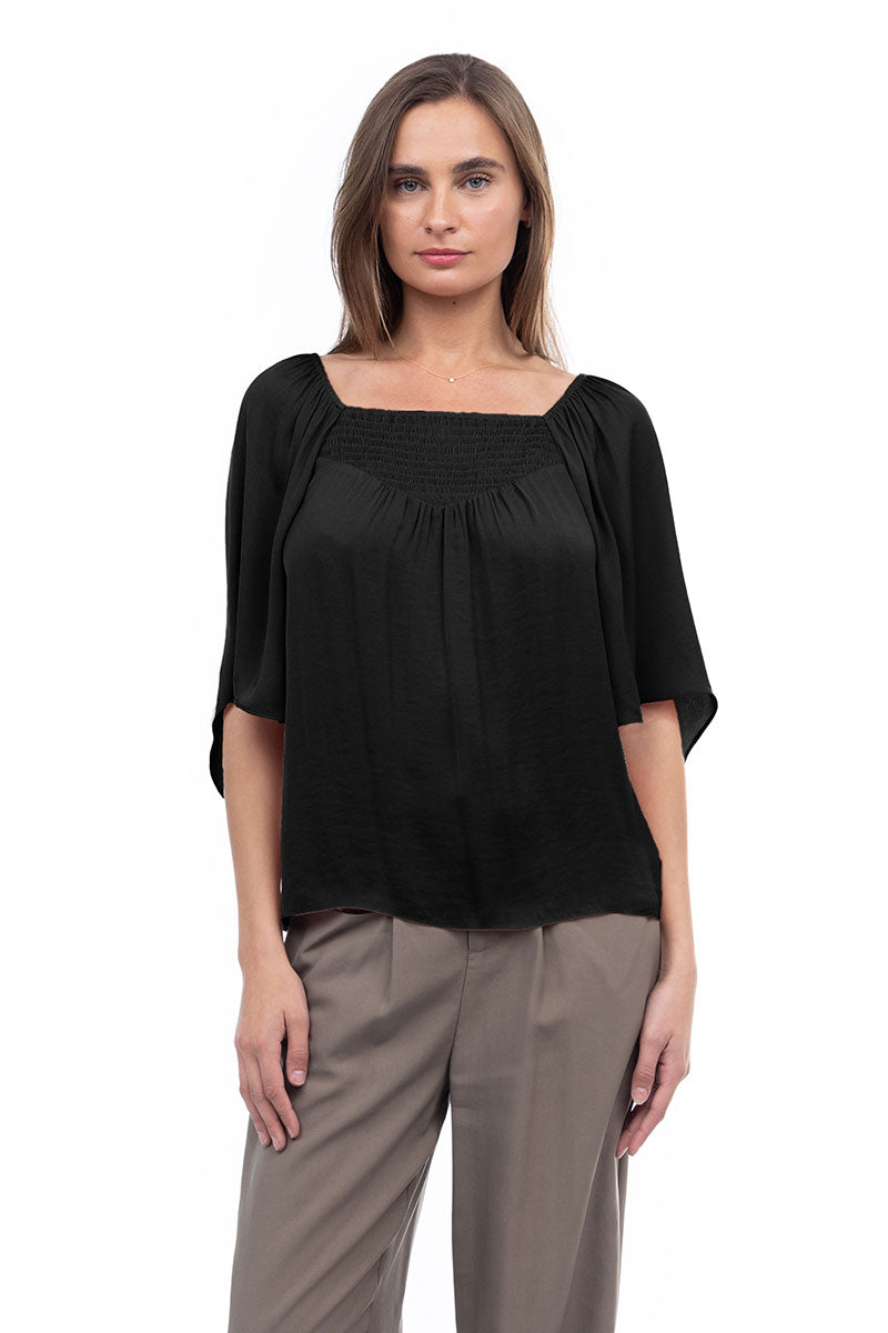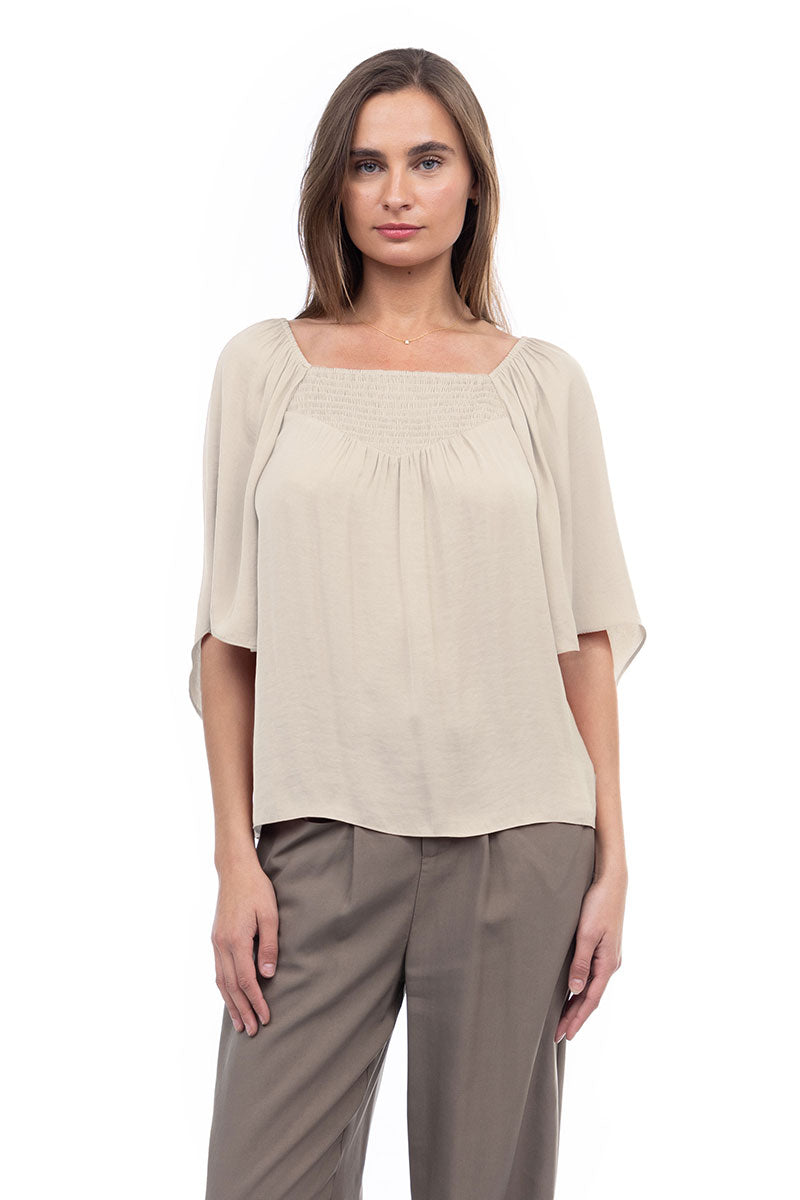 The front smocking adds a touch of texture and charm, while the sleeves hitting right at the elbow create a flattering silhouette. Perfect for a bohemian-inspired and comfortable look, this blouse effortlessly combines style and ease, making it an ideal choice for various occasions.